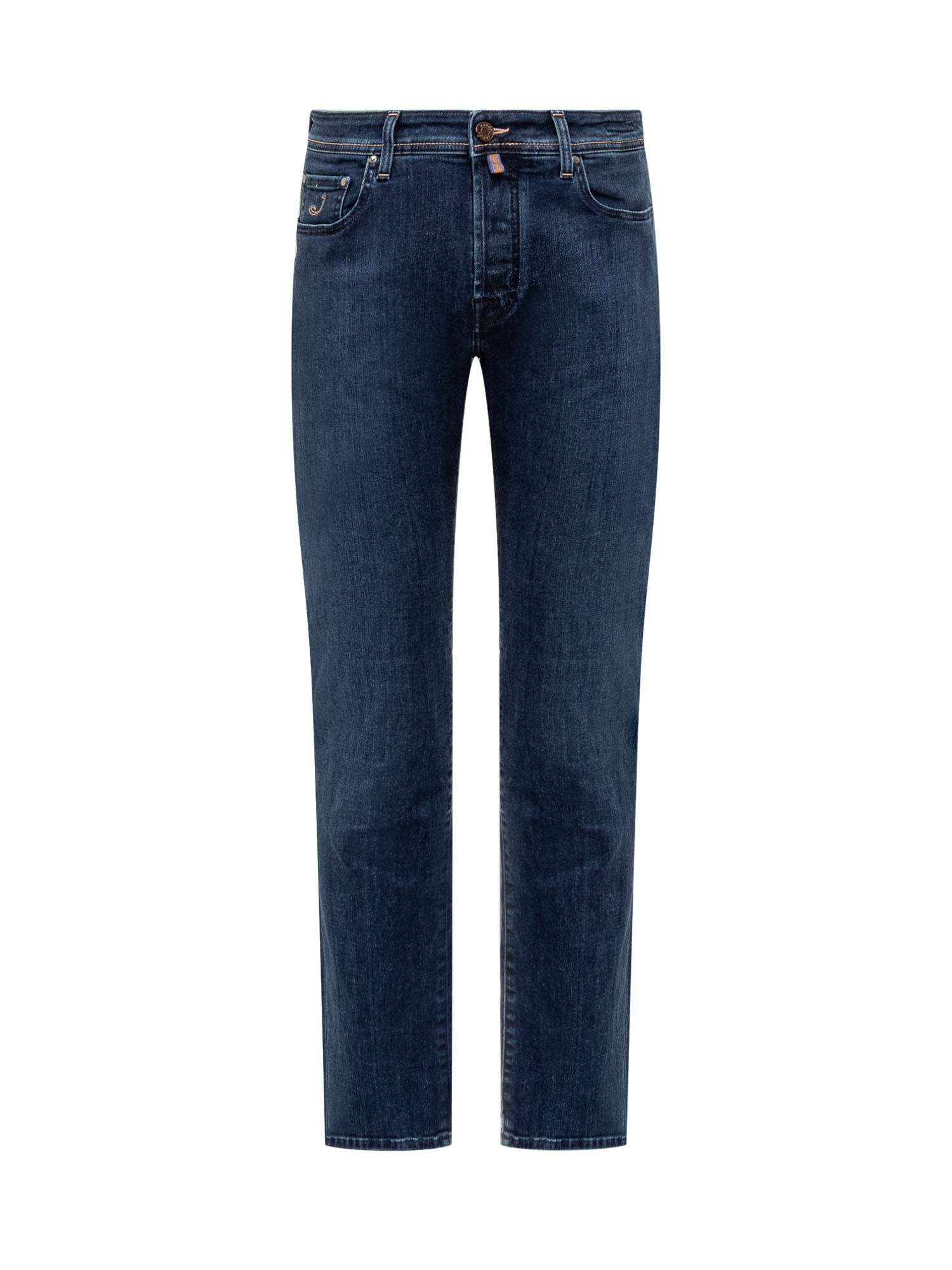 Long slim fit jeans. Button and zipper closure. Belt loops. Five pockets.
