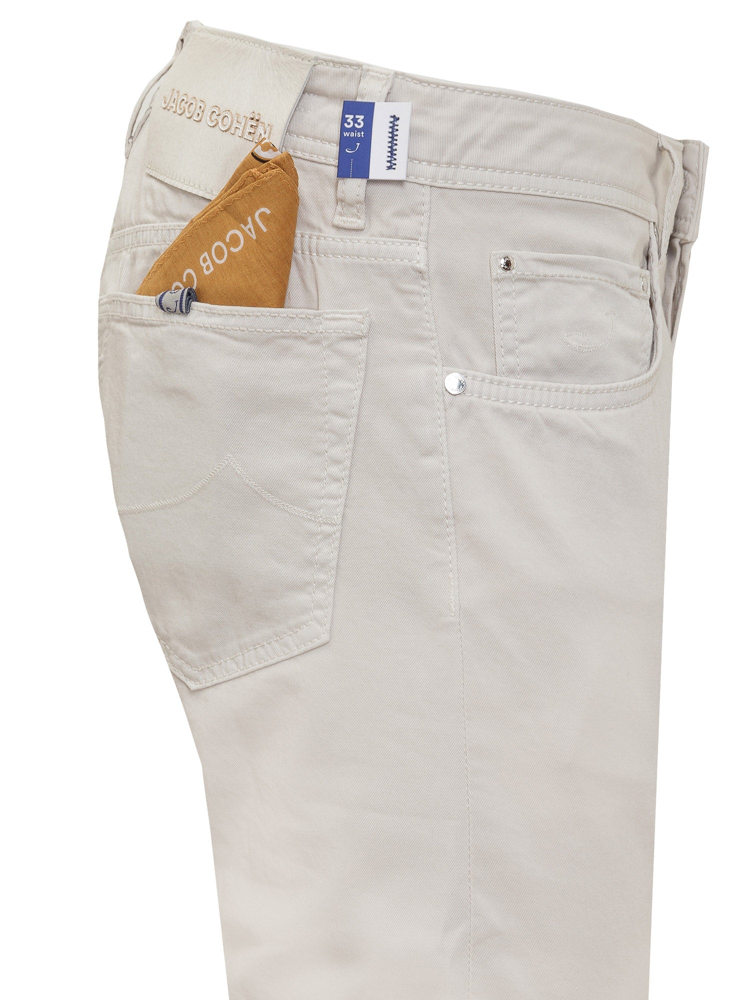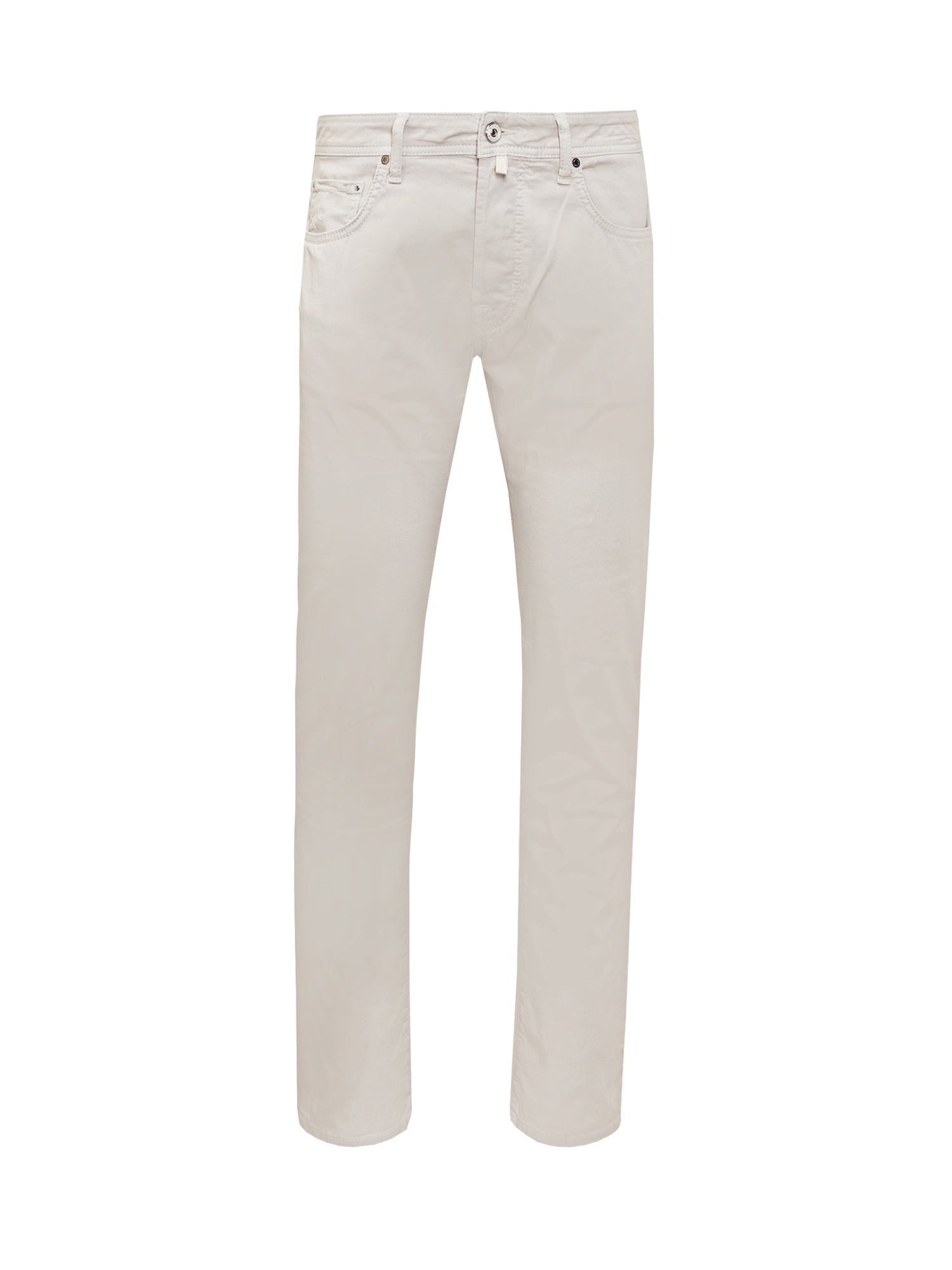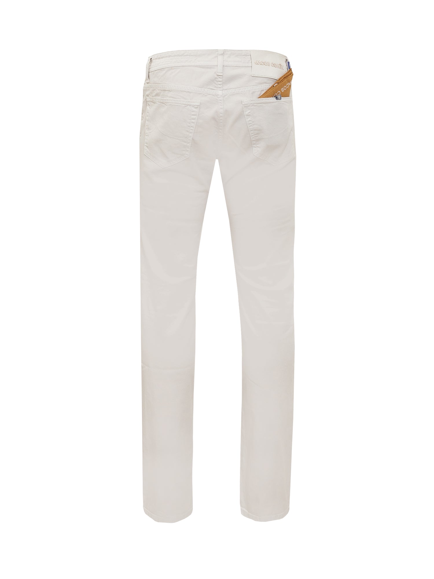 White trousers. Zip and button closure. Belt loops. Five pockets. Logo on the back.