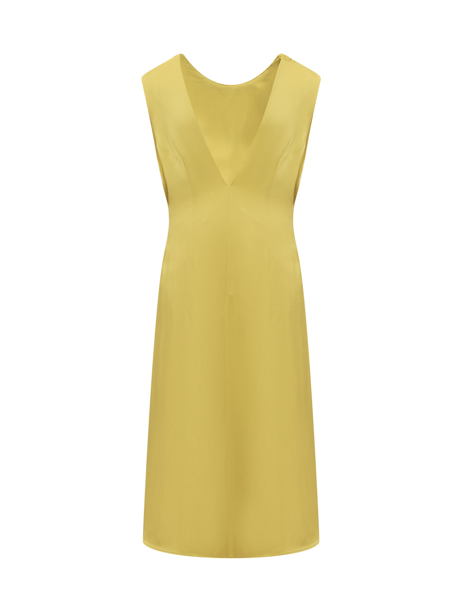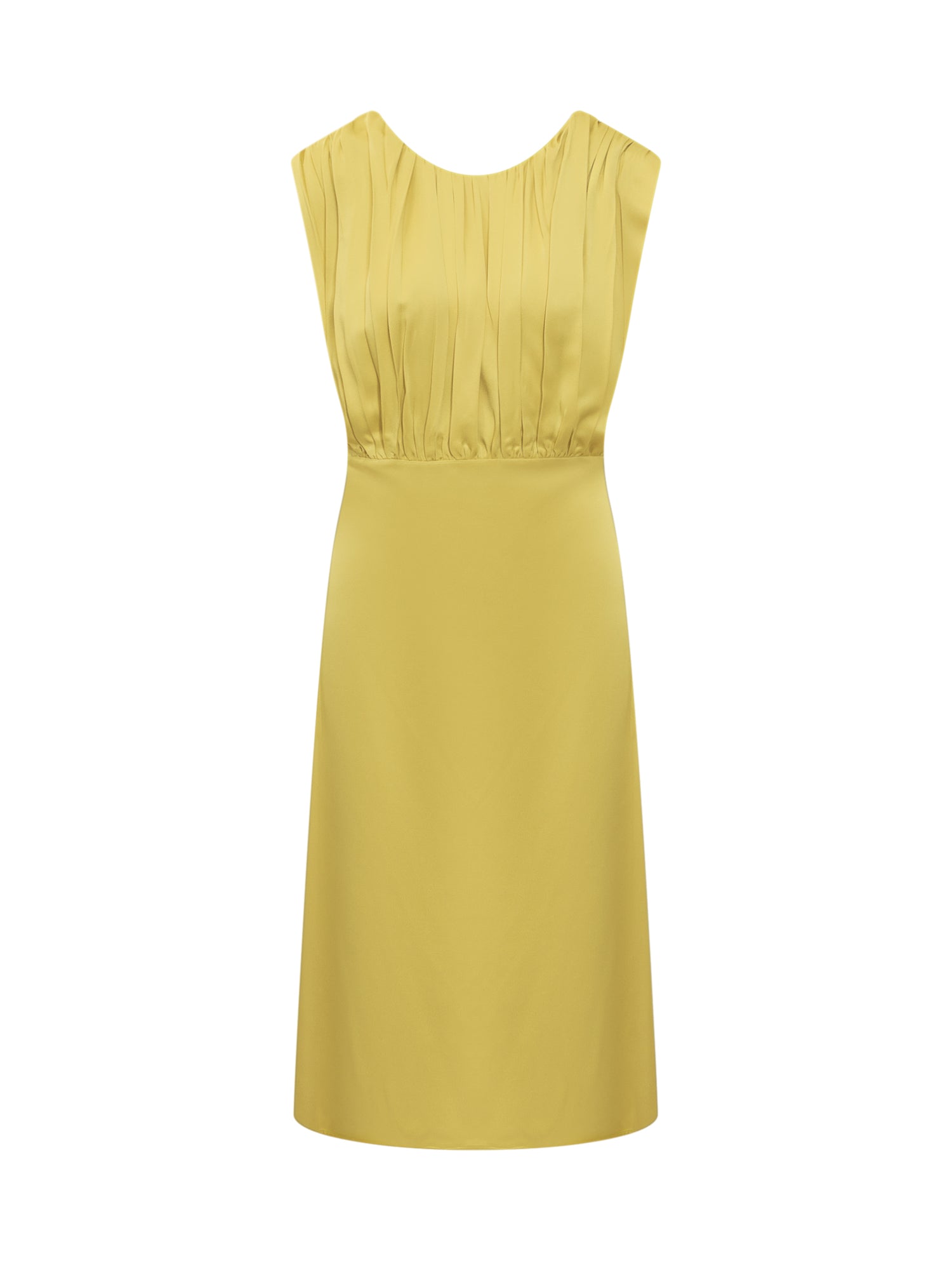Short sleeveless dress. U-shaped neckline at the front. V-neck at the back. Side zipper closure. Gathered effect at front.