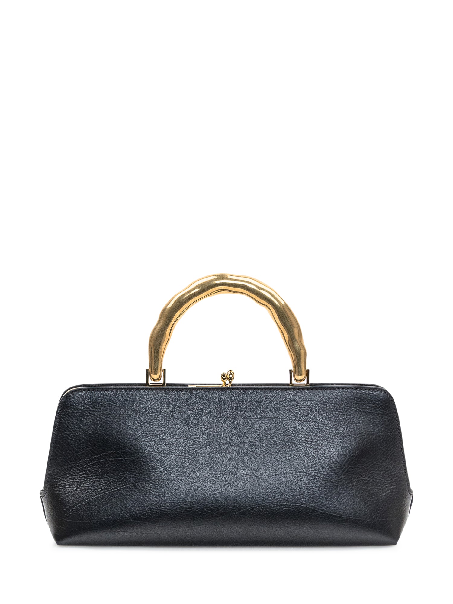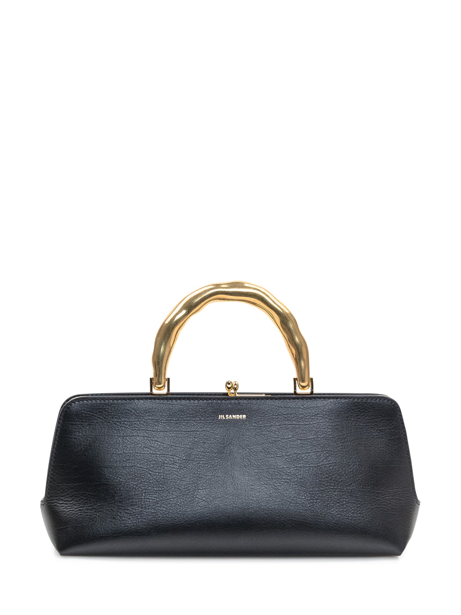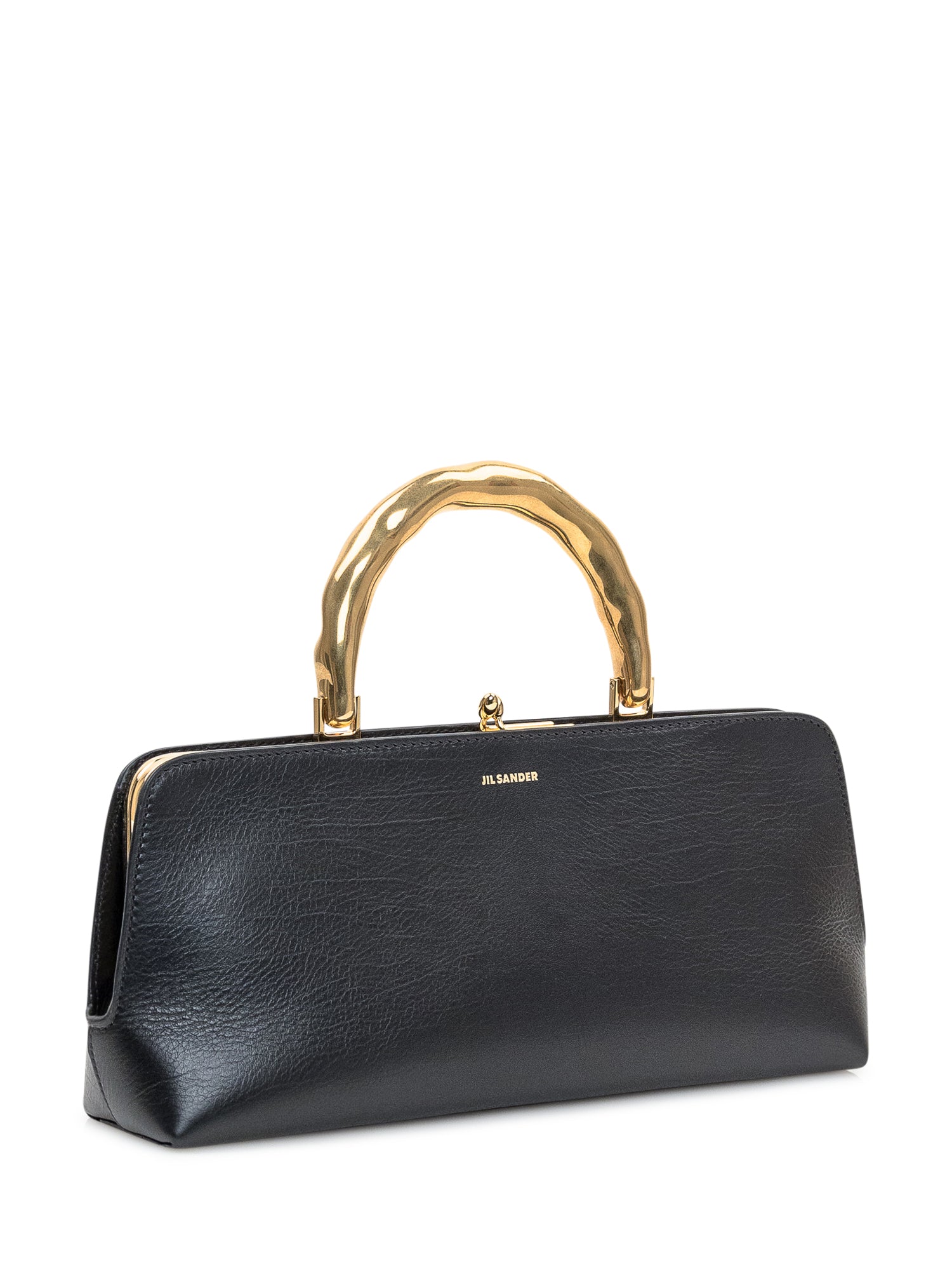 Small bag in calfskin leather. Clutch clasp closure with snap hook. Inside zipper pocket. Electroformed metal handle. Embossed and gilded Jil Sander logo. Rectangular shape.