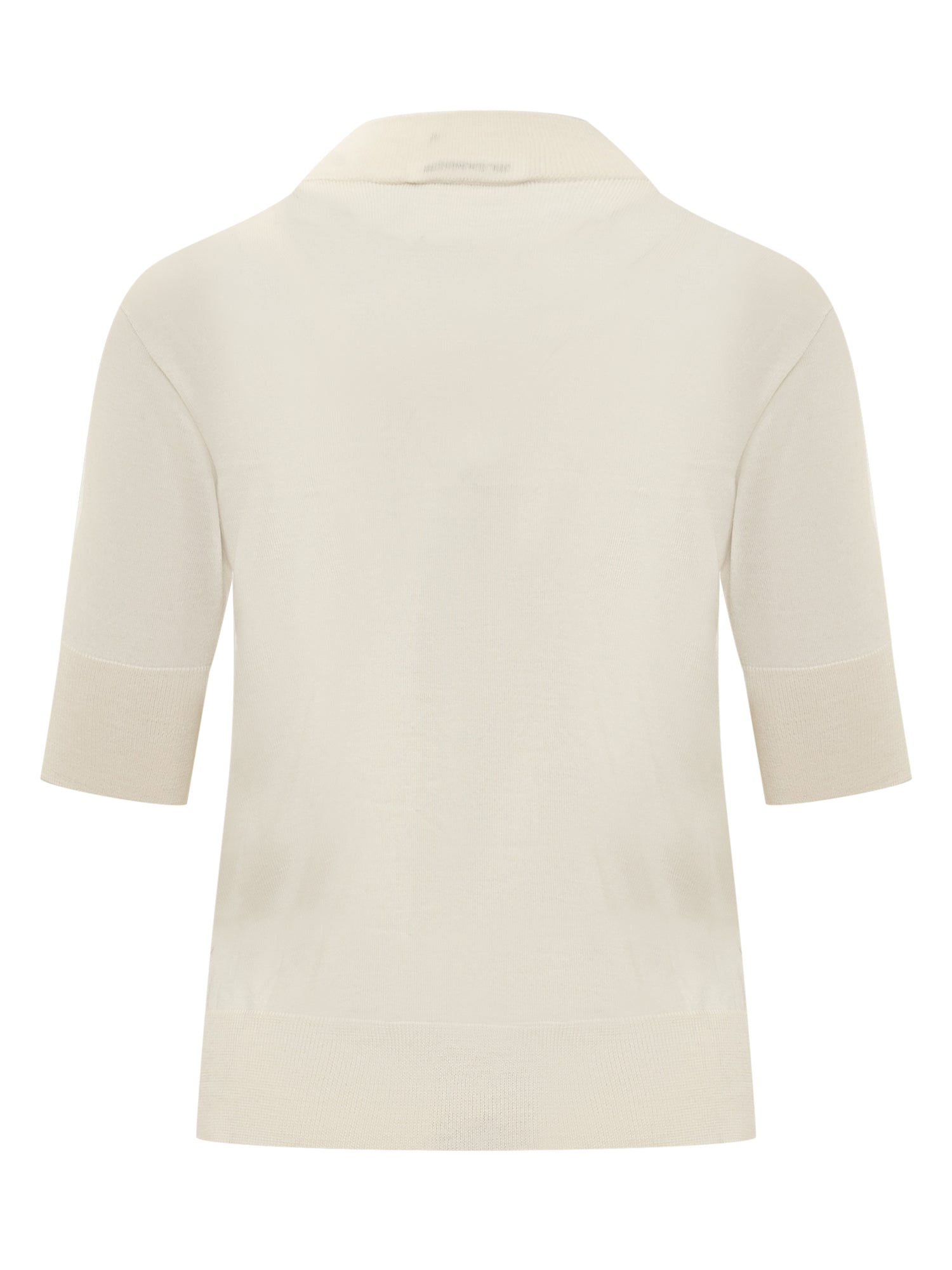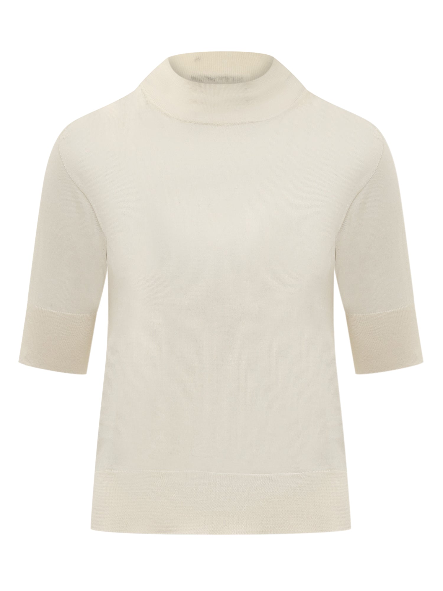 Short-sleeved sweater made of wool, cashmere, and silk. High collar. Ribbed hems. Side slits.