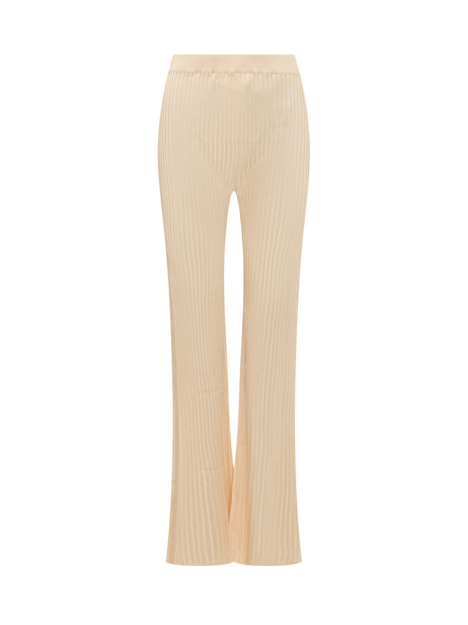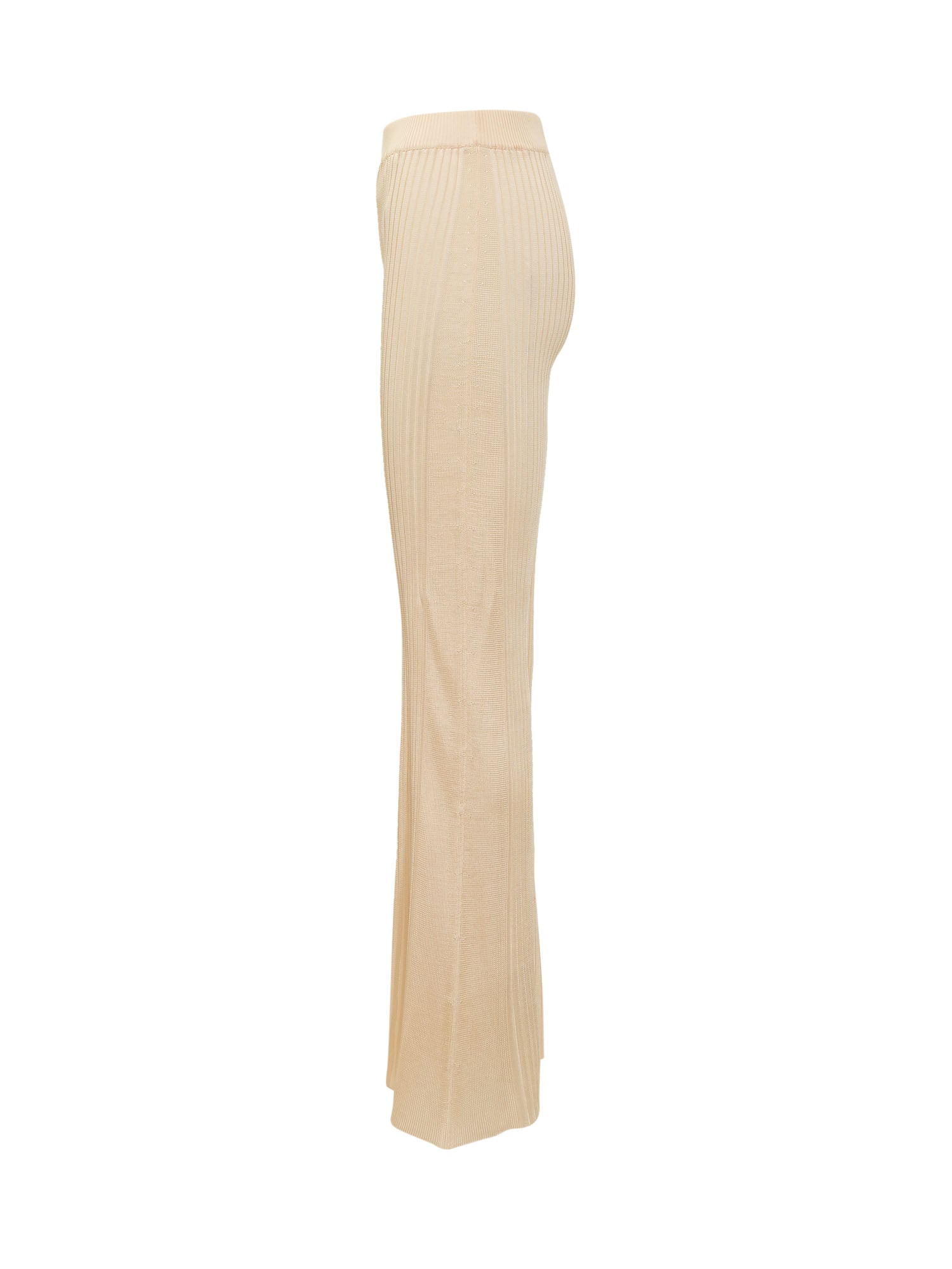 Long flared pants. Elasticated waistband. Ribbed effect.
