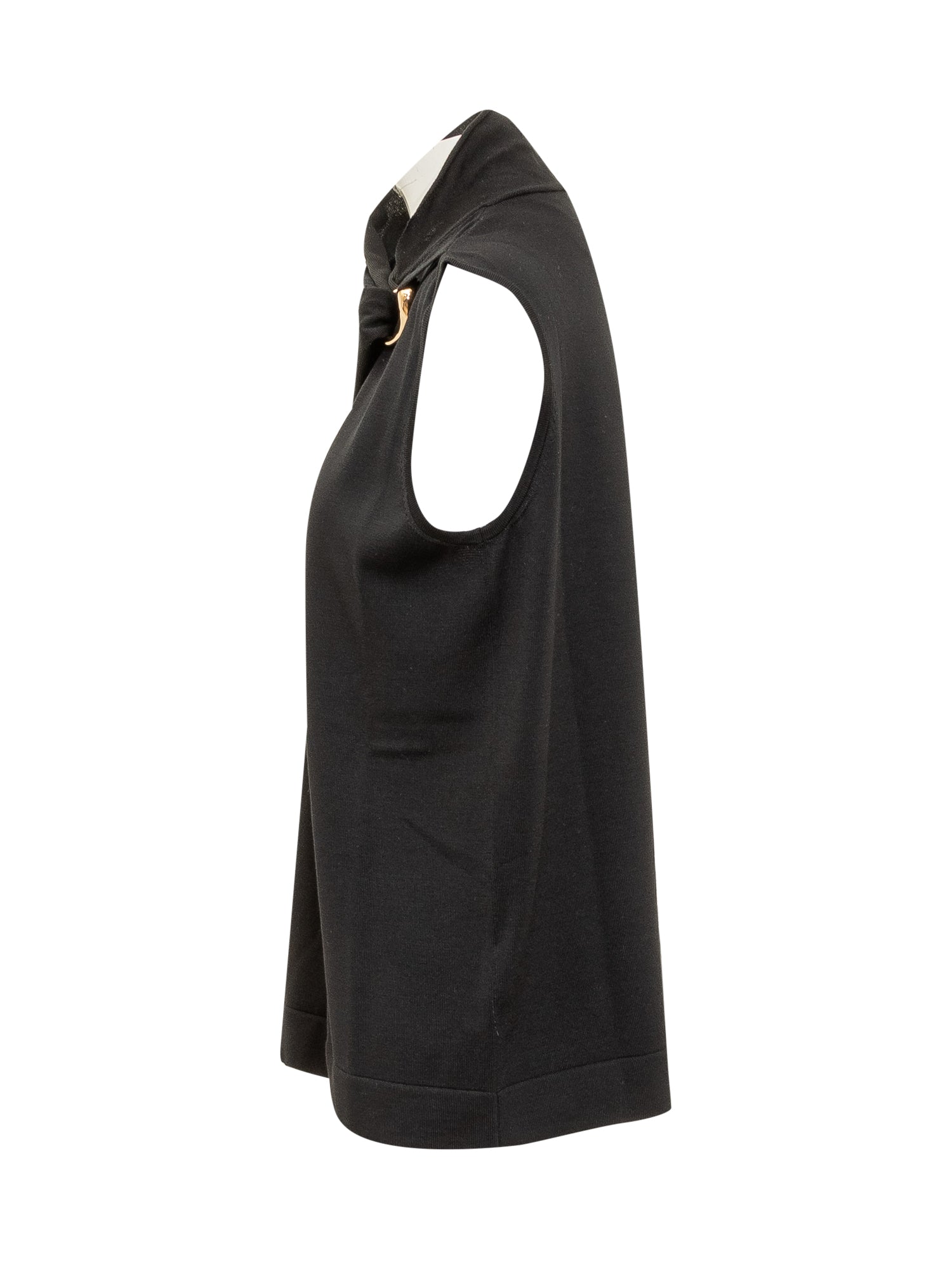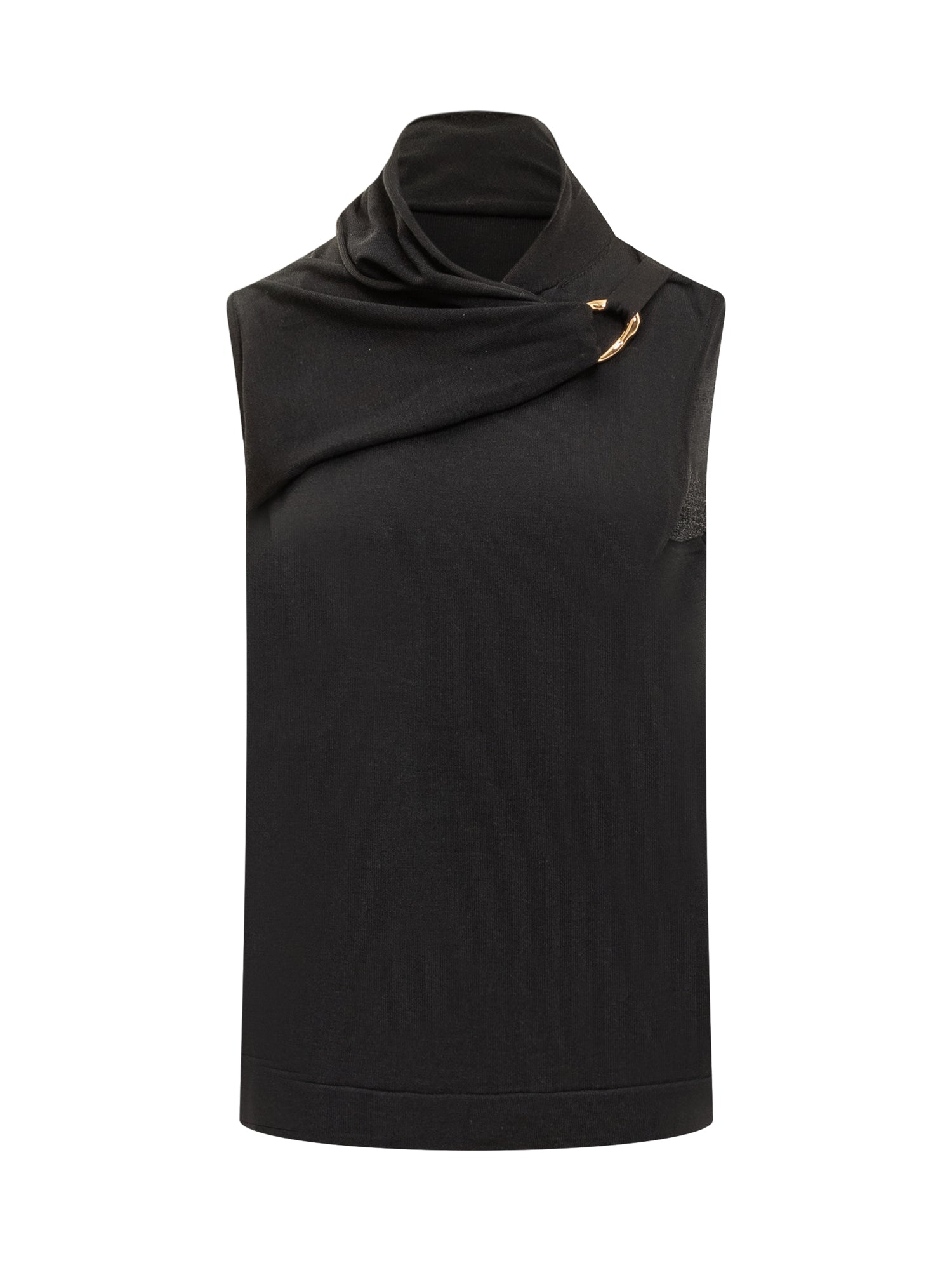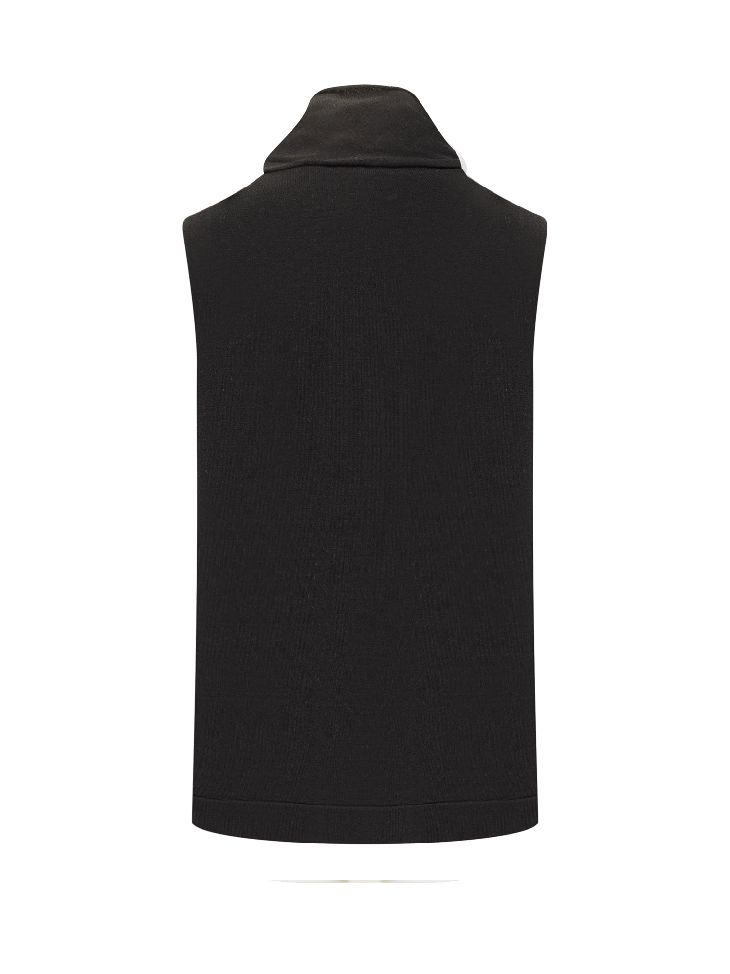 Virgin wool sleeveless top. Round neckline. Straight hems. Ruffle detail with metal hook at front.