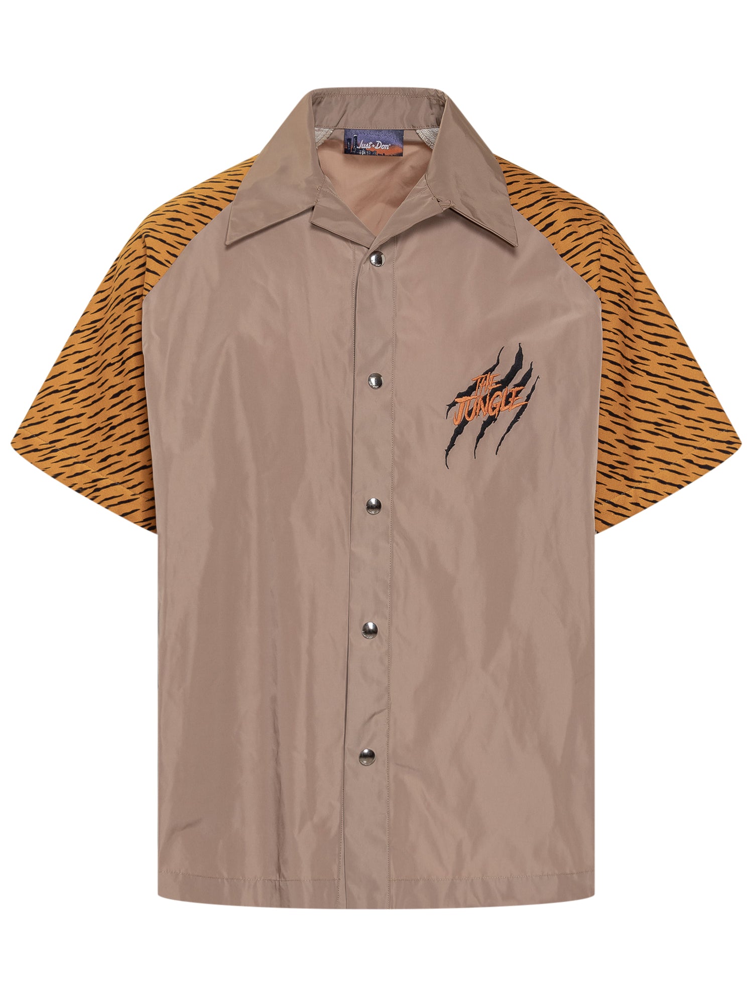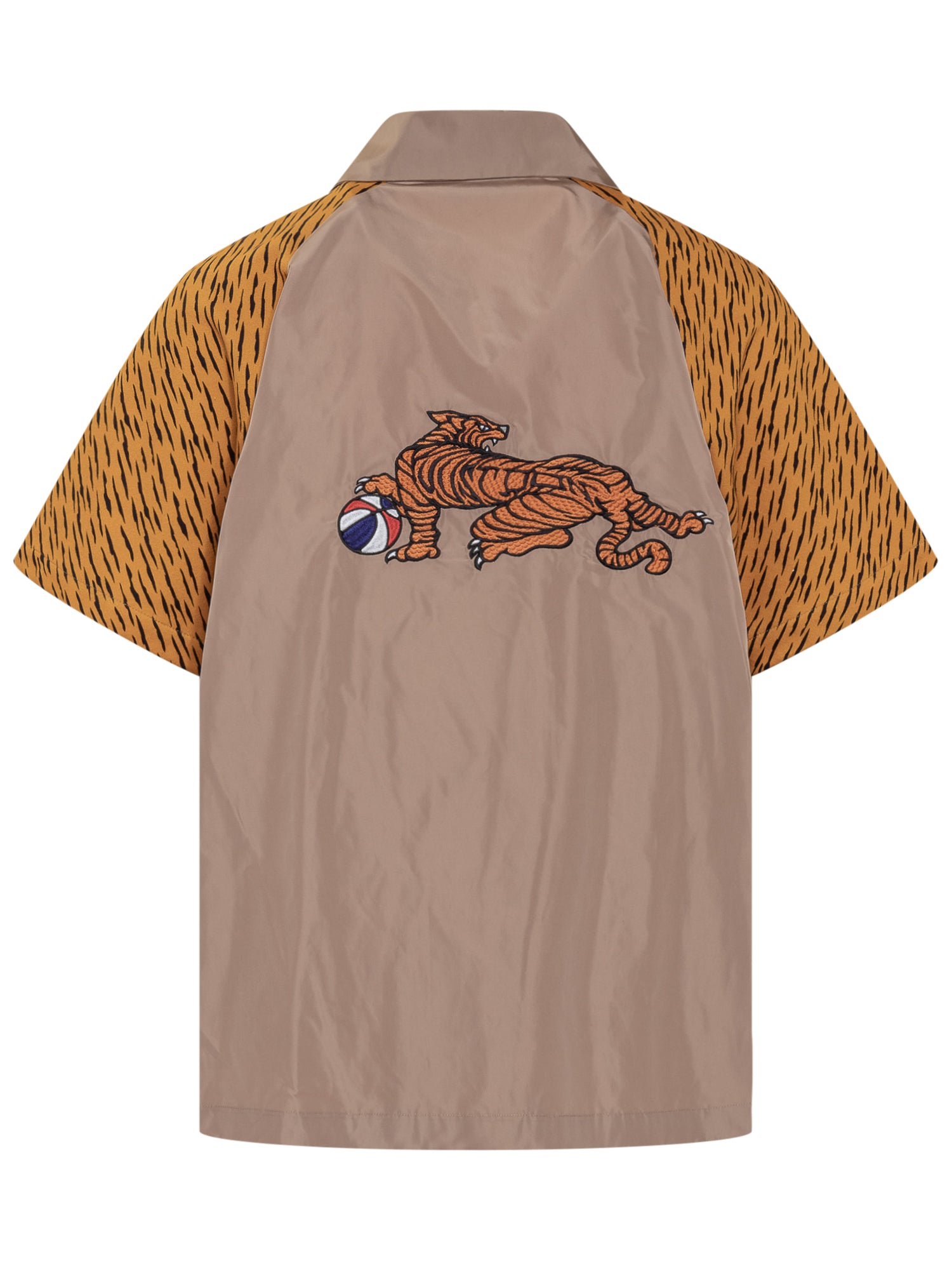 Brown shirt with short sleeves. Front closure with buttons. Sleeves with tiger print. Embroidered logo on the chest. Print on the back.