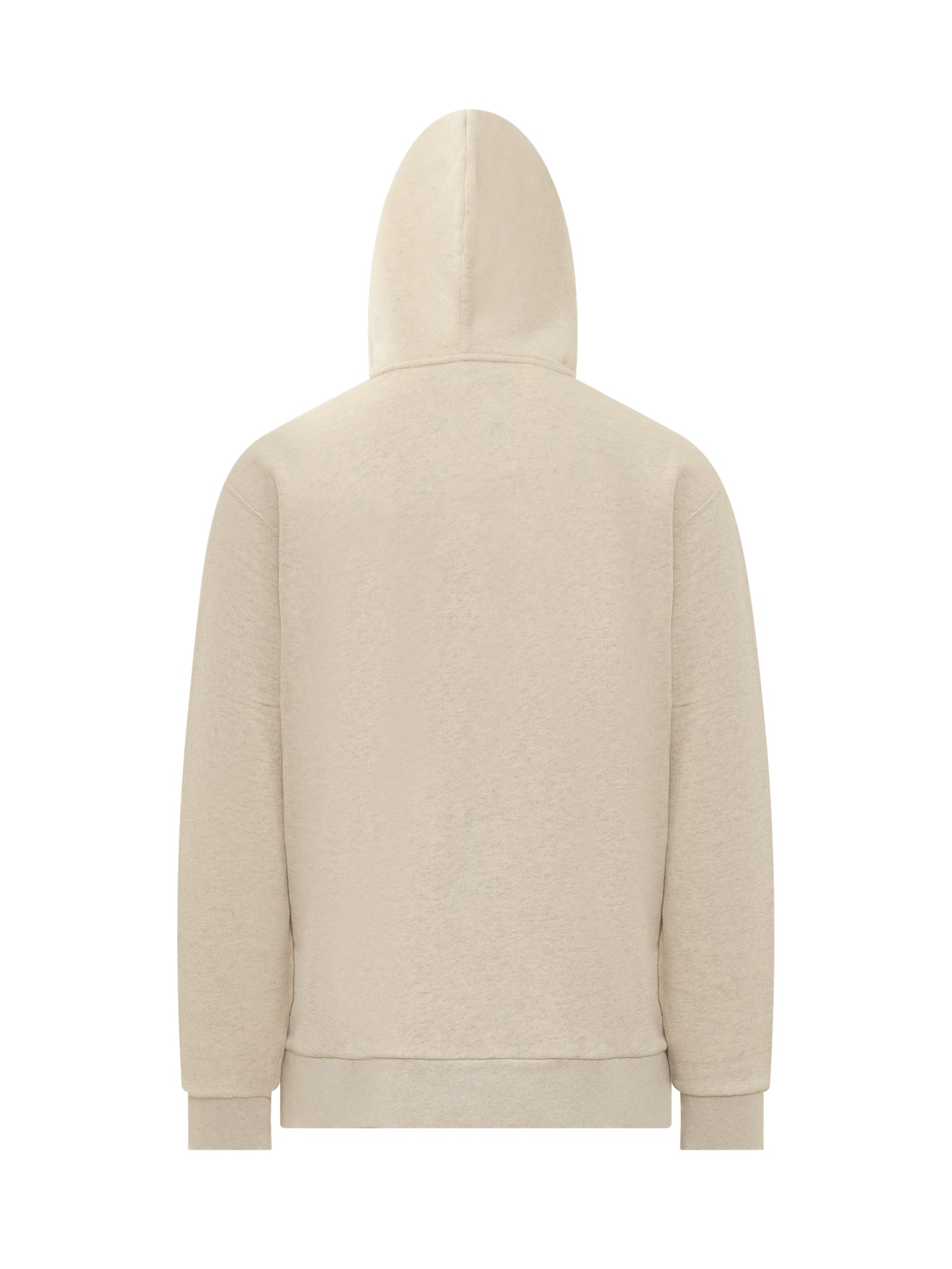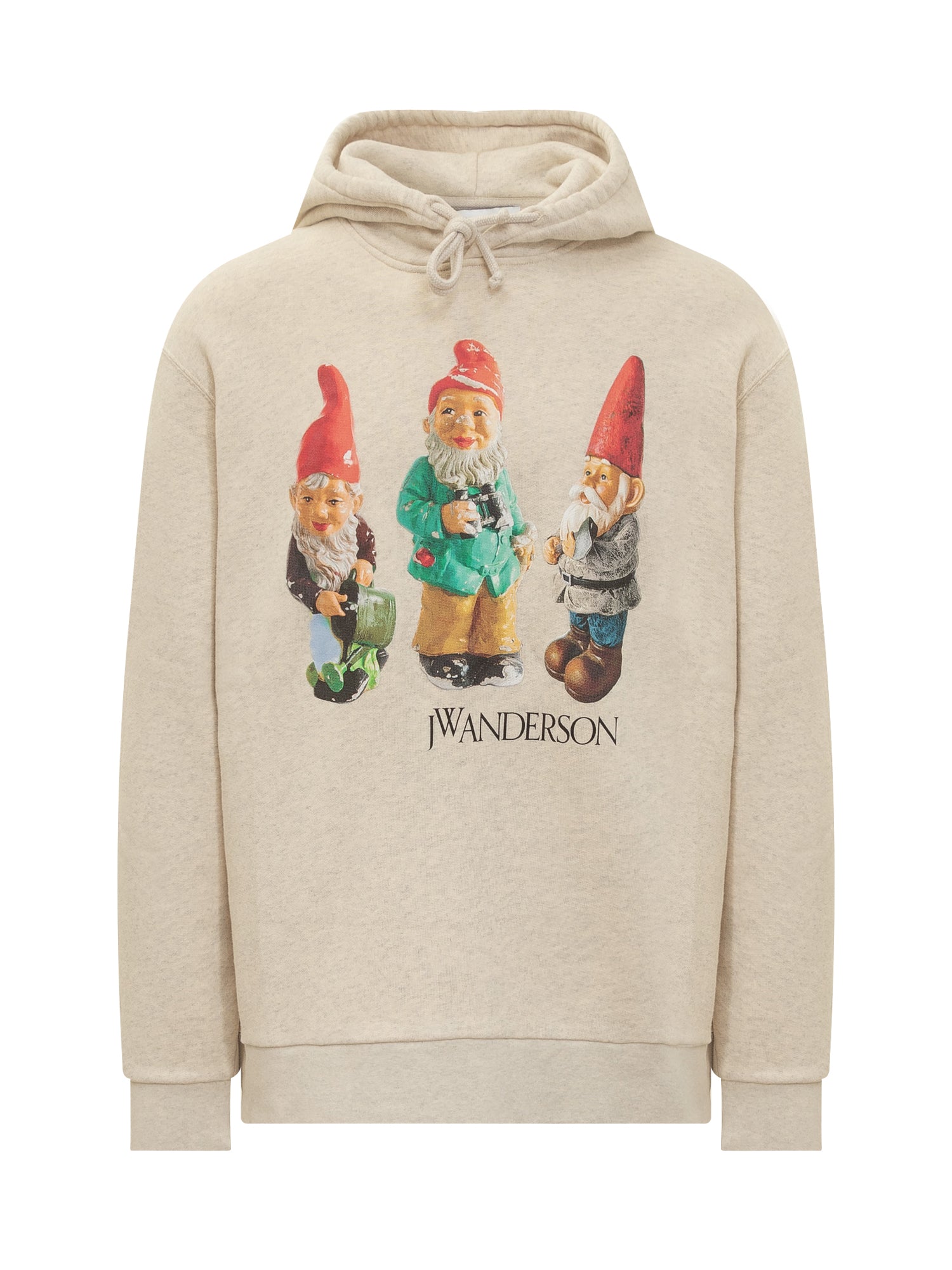 Beige hoodie. Three gnomes print. Ribbed hem and cuffs.