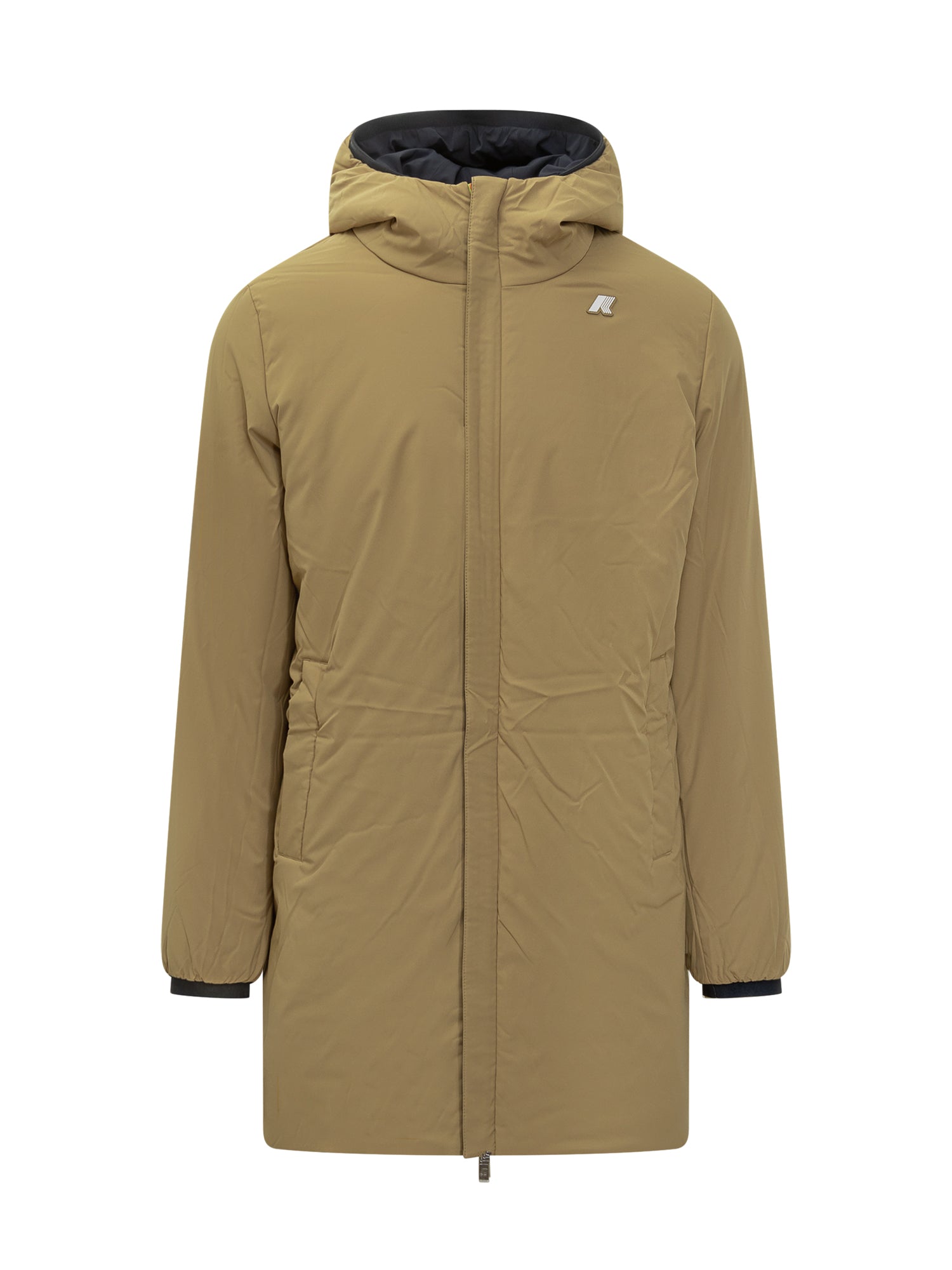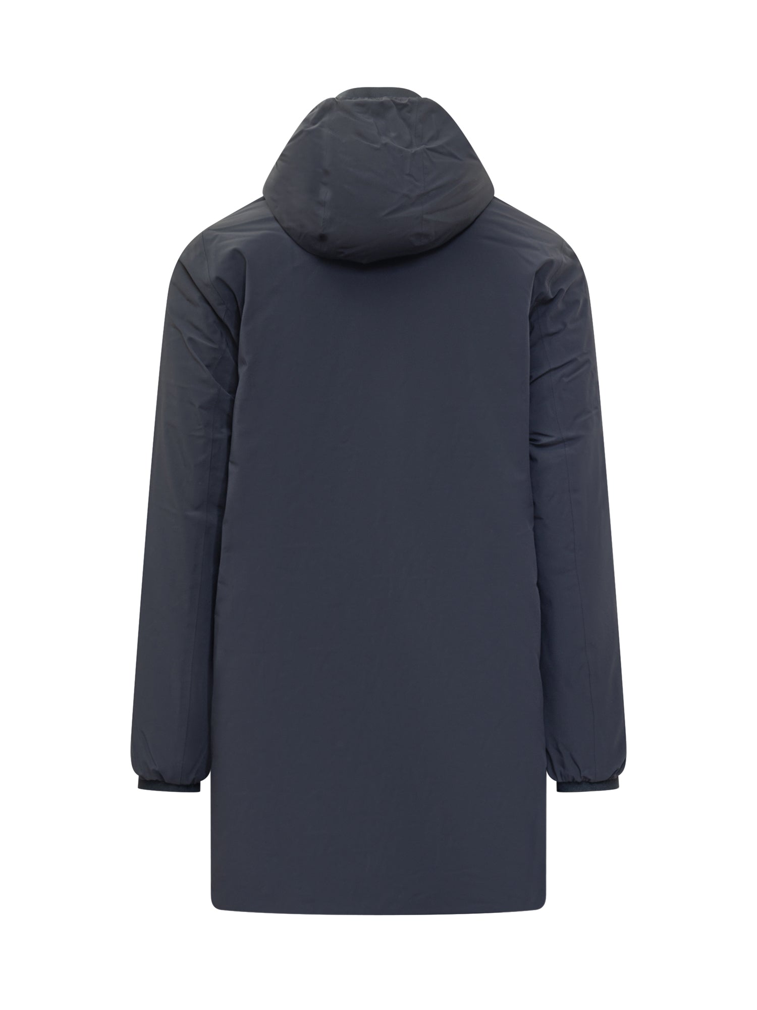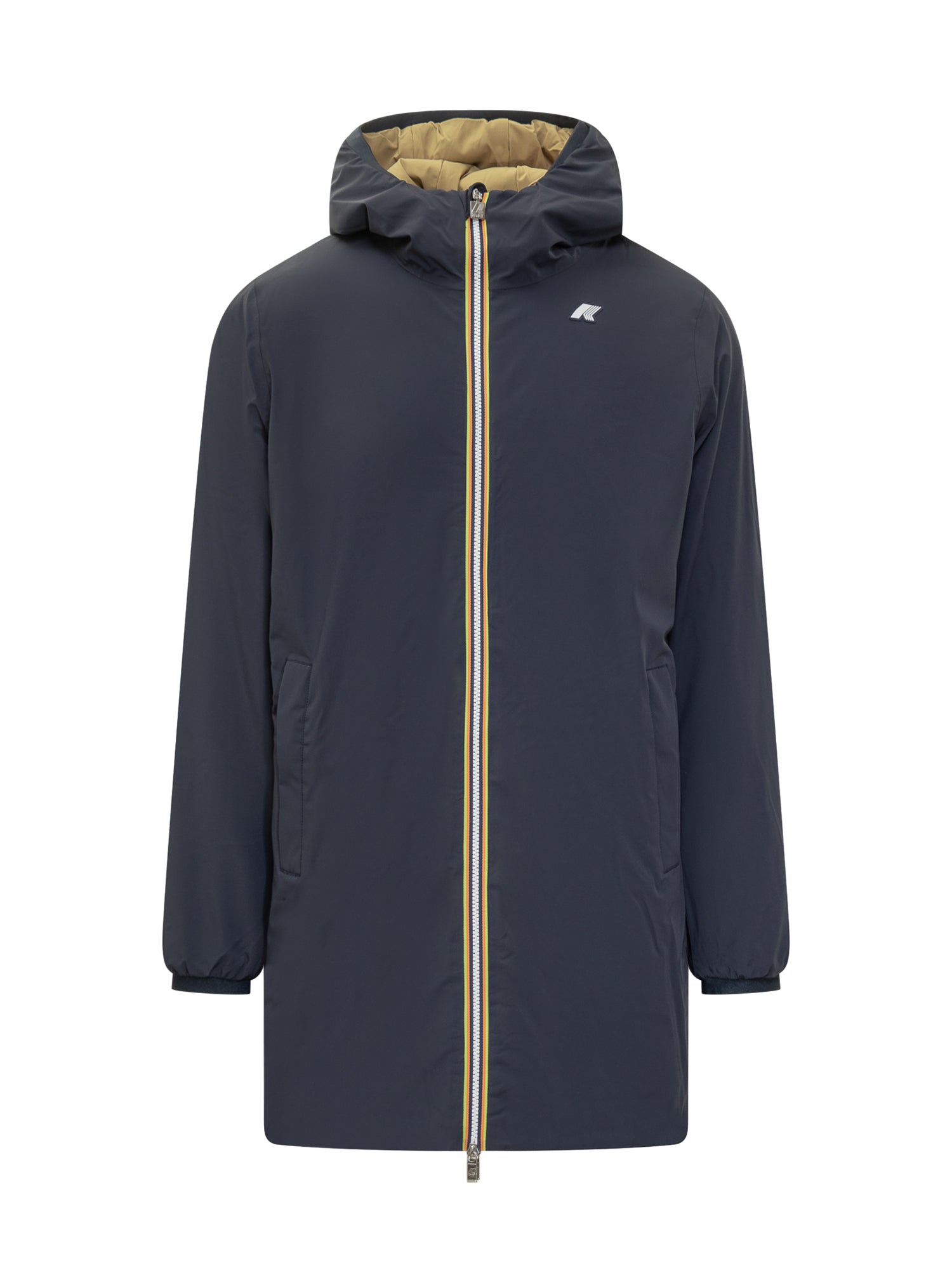K-Way Jacob St Warm Double parka in blue with hood and multicolor zip. Reversible padded design.