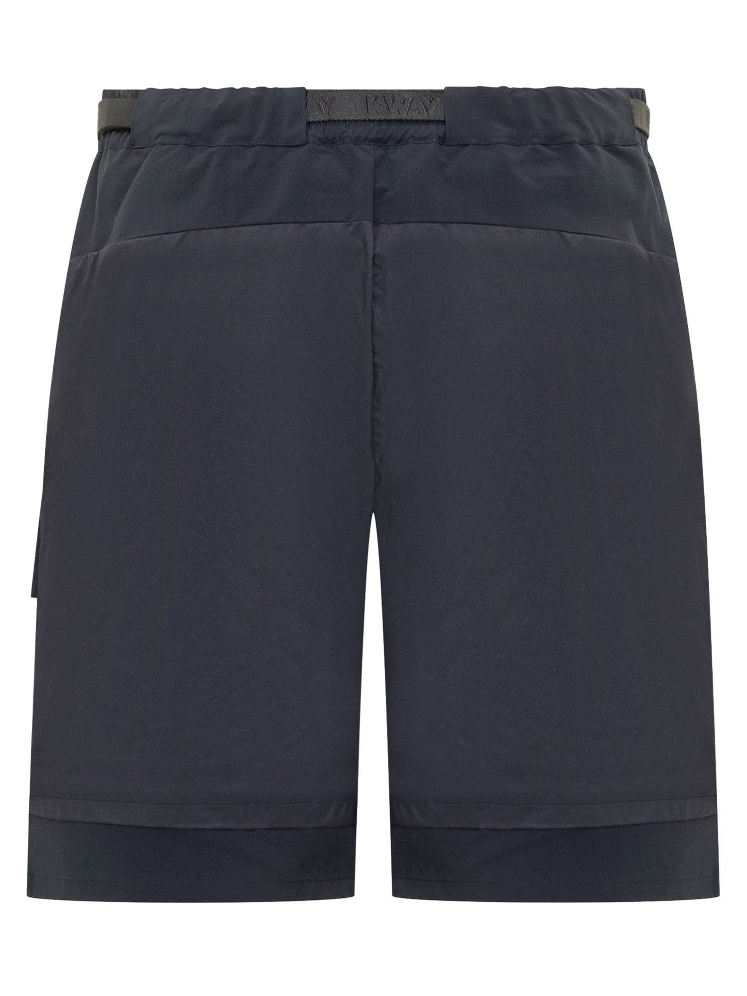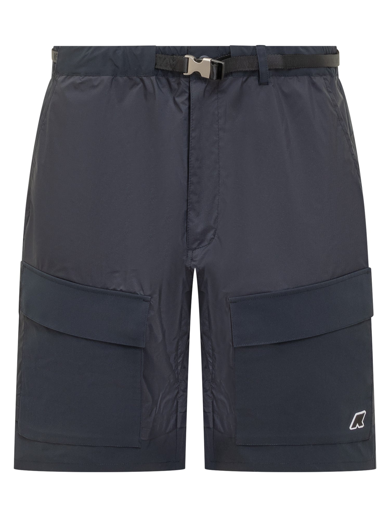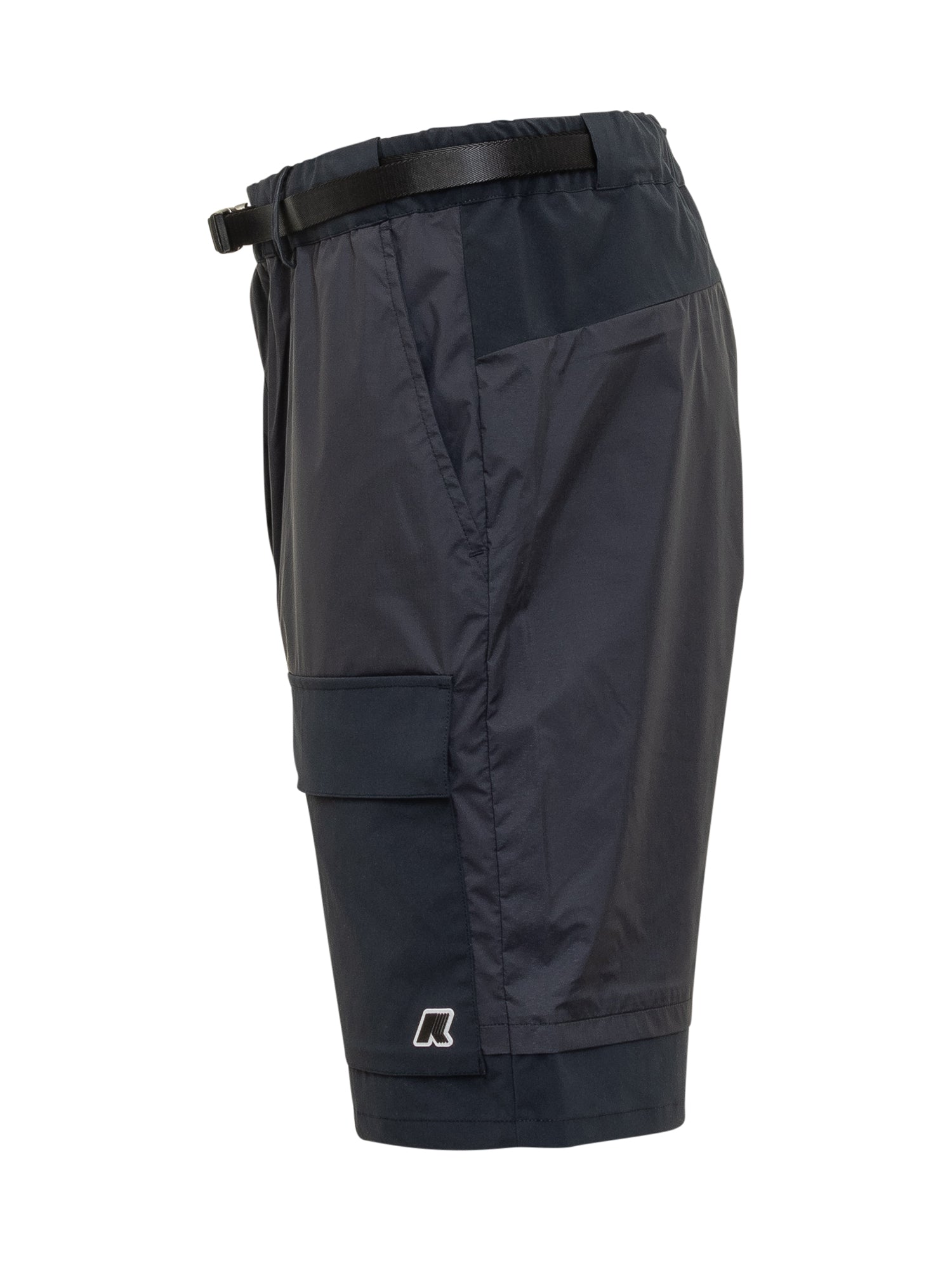 Button and zip closure, belt with carabiner. Wide leg with side and back pockets. Inside pocket for coins. Keychain loop and logo in black silicone on white background.