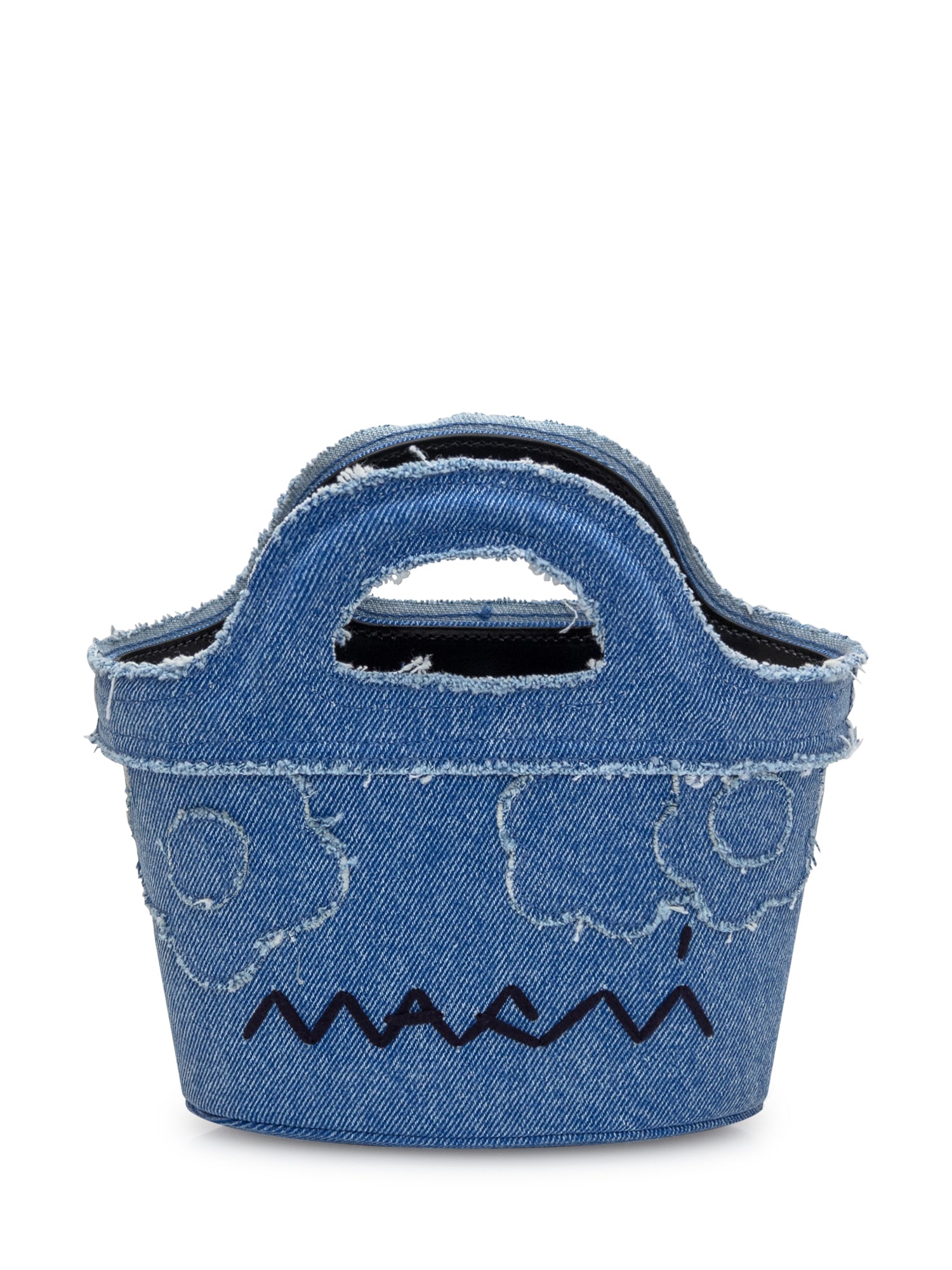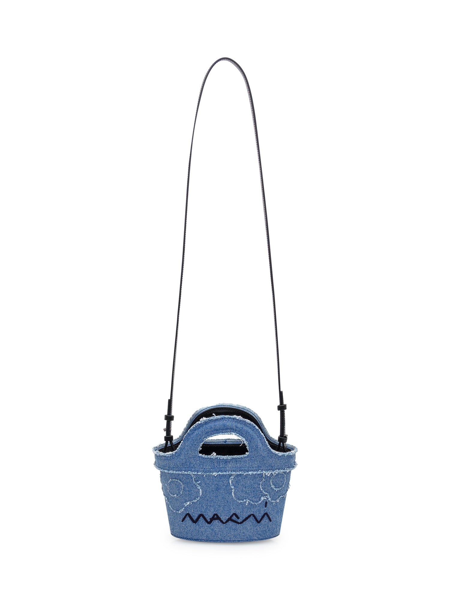 Micro bag in jeans. Two top handles. Adjustable and removable shoulder strap. Front panel with embroidered logo. Contains non-textile parts of animal origin.