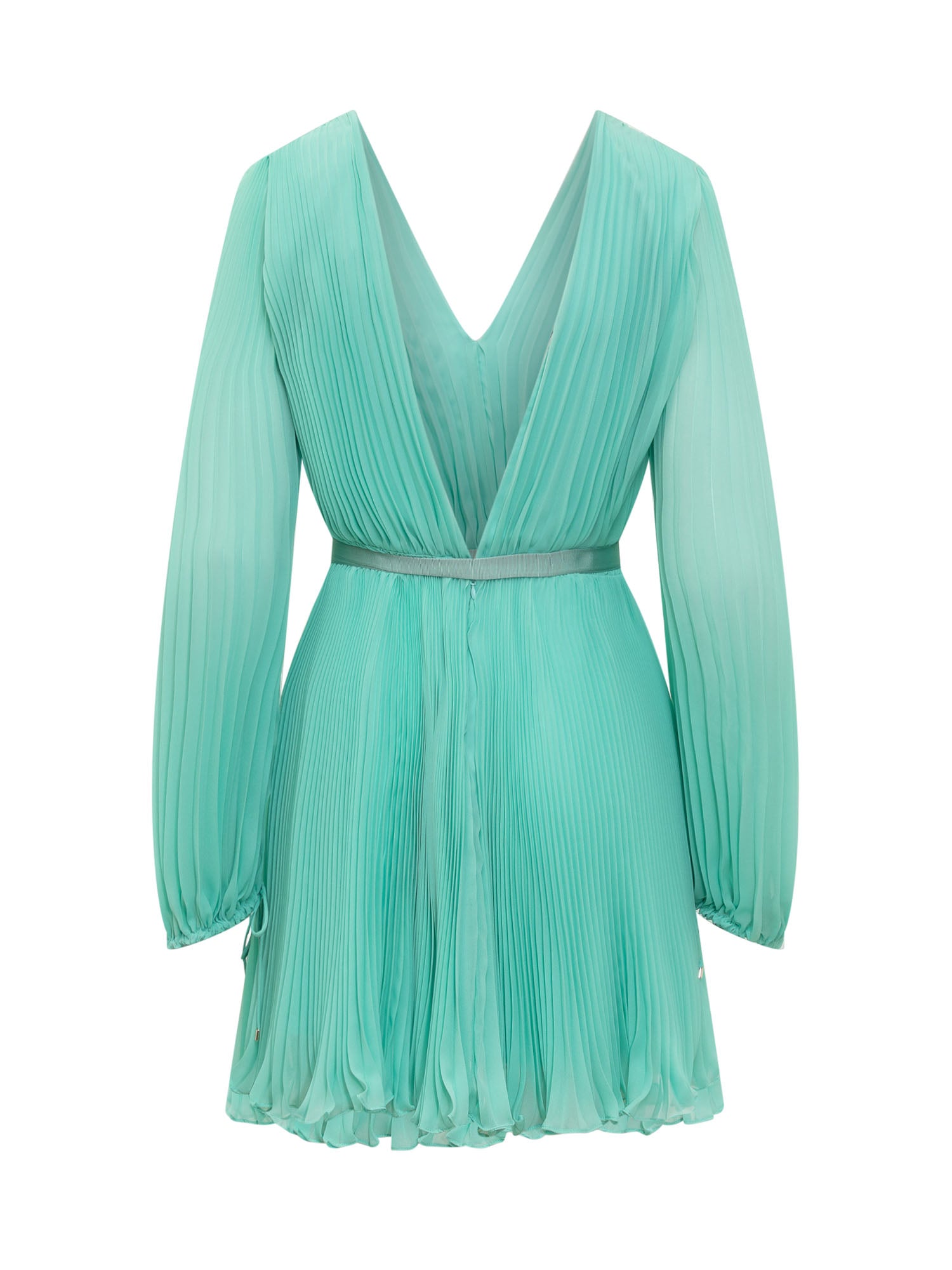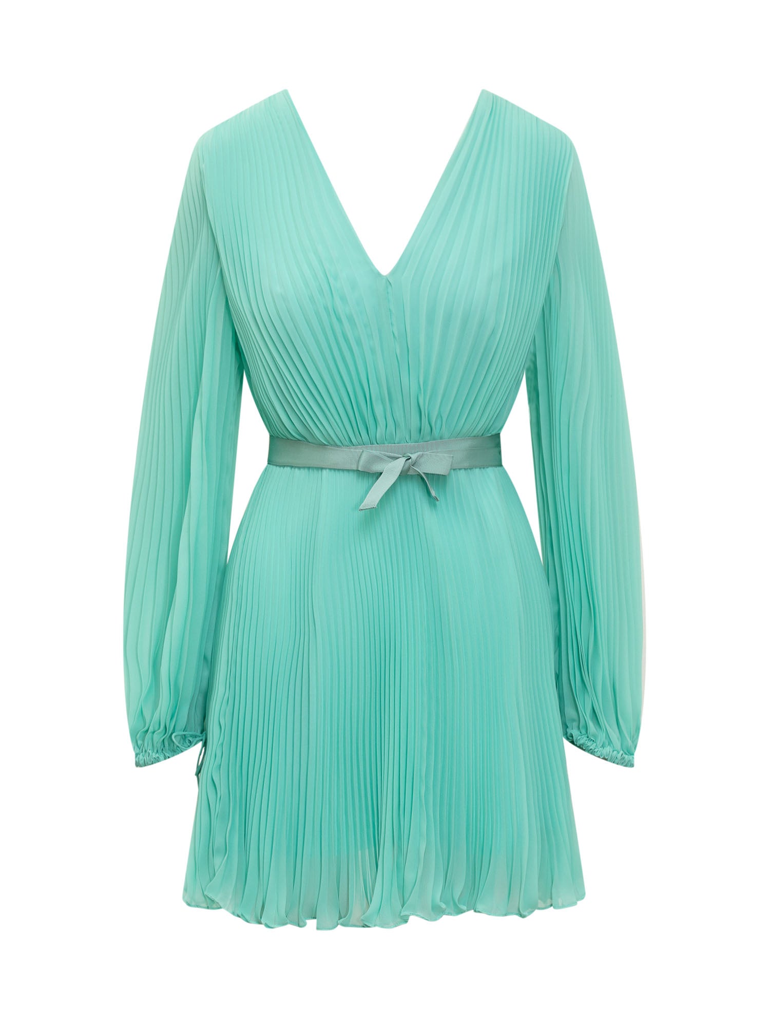 Pleated mini dress with long sleeves. V-neck. Closure with invisible zip on the back. Belt at the waist. Sleeve bottom with drawstring.