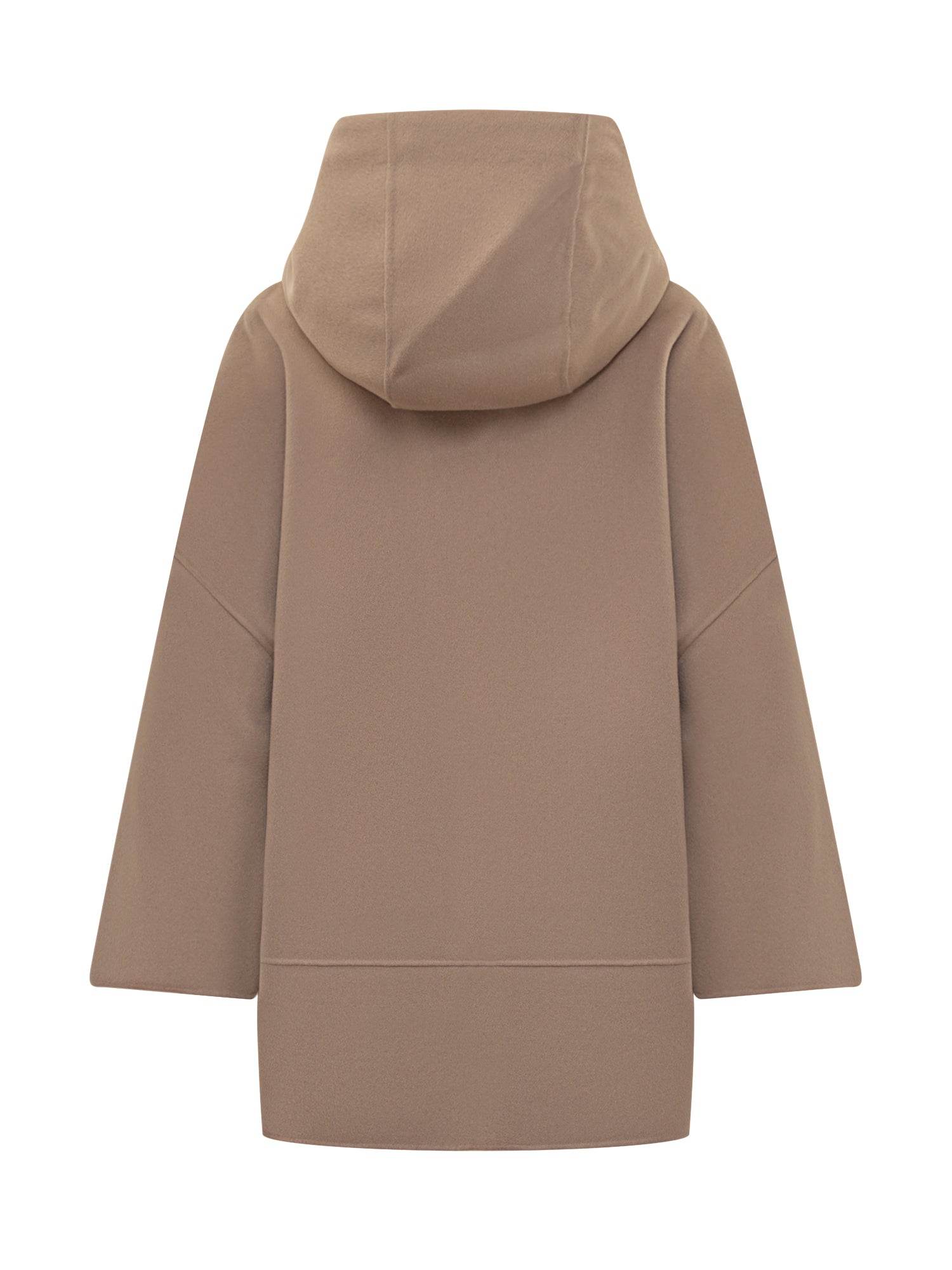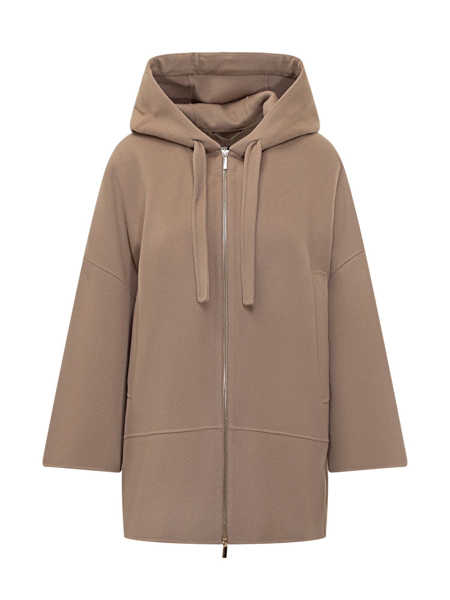 Max Mara S camel wool coat featuring a hood and zip closure.
