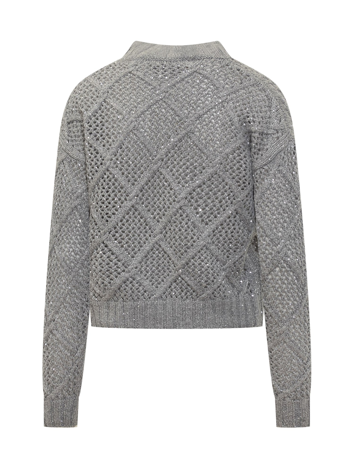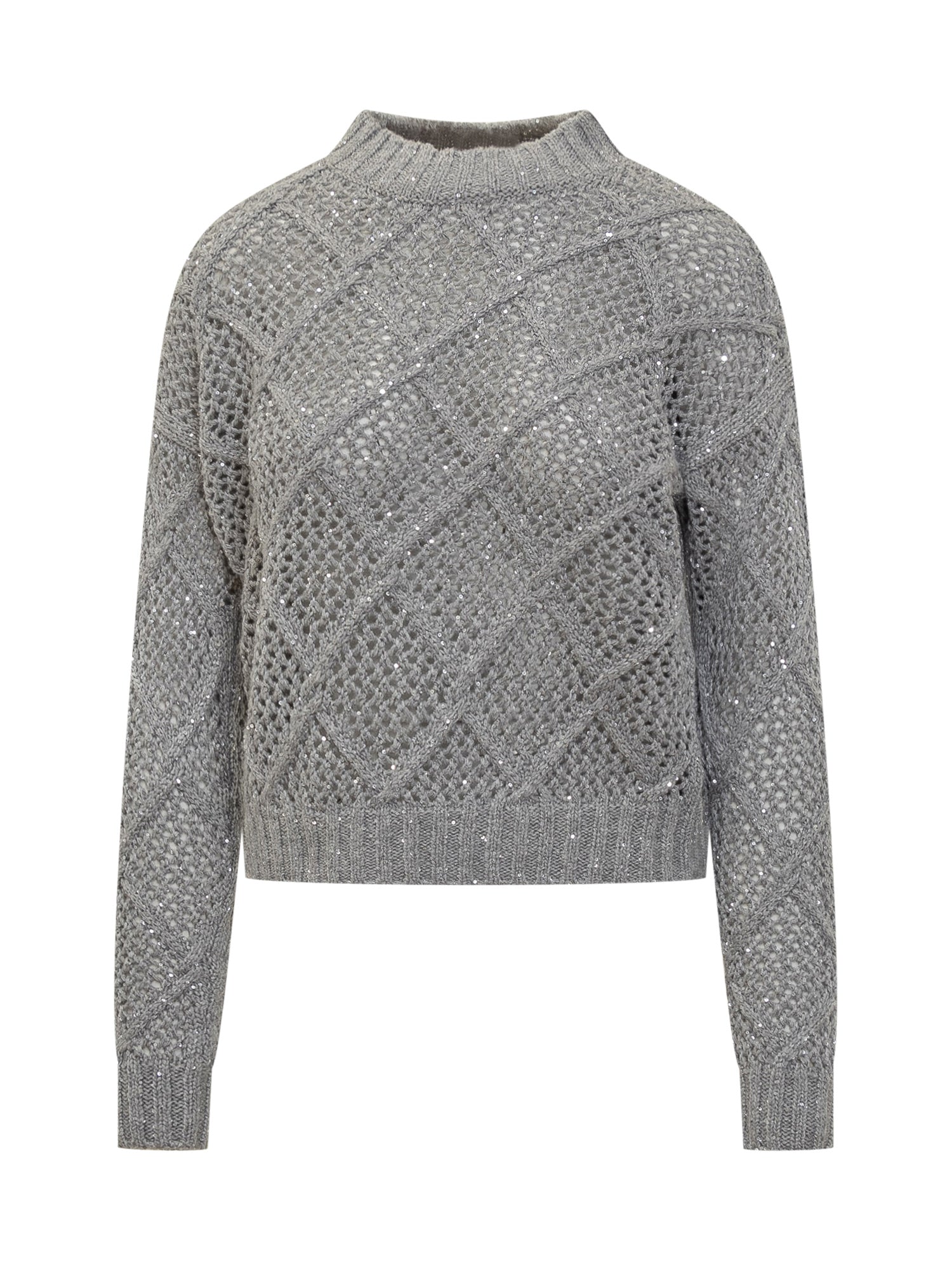 Max Mara Studio grey sweater featuring diamond knit pattern and lamé detailing. Crew neck, long sleeves and relaxed fit.