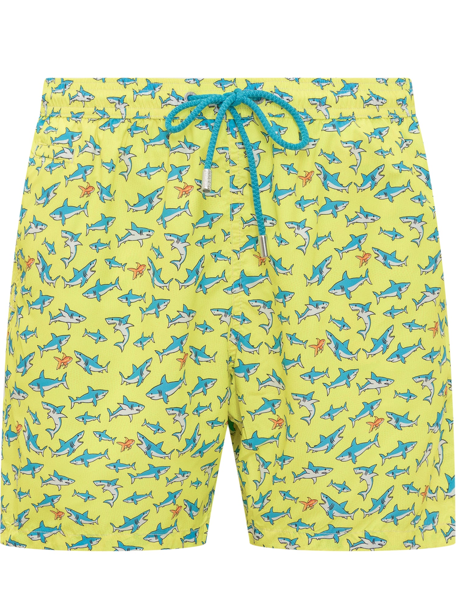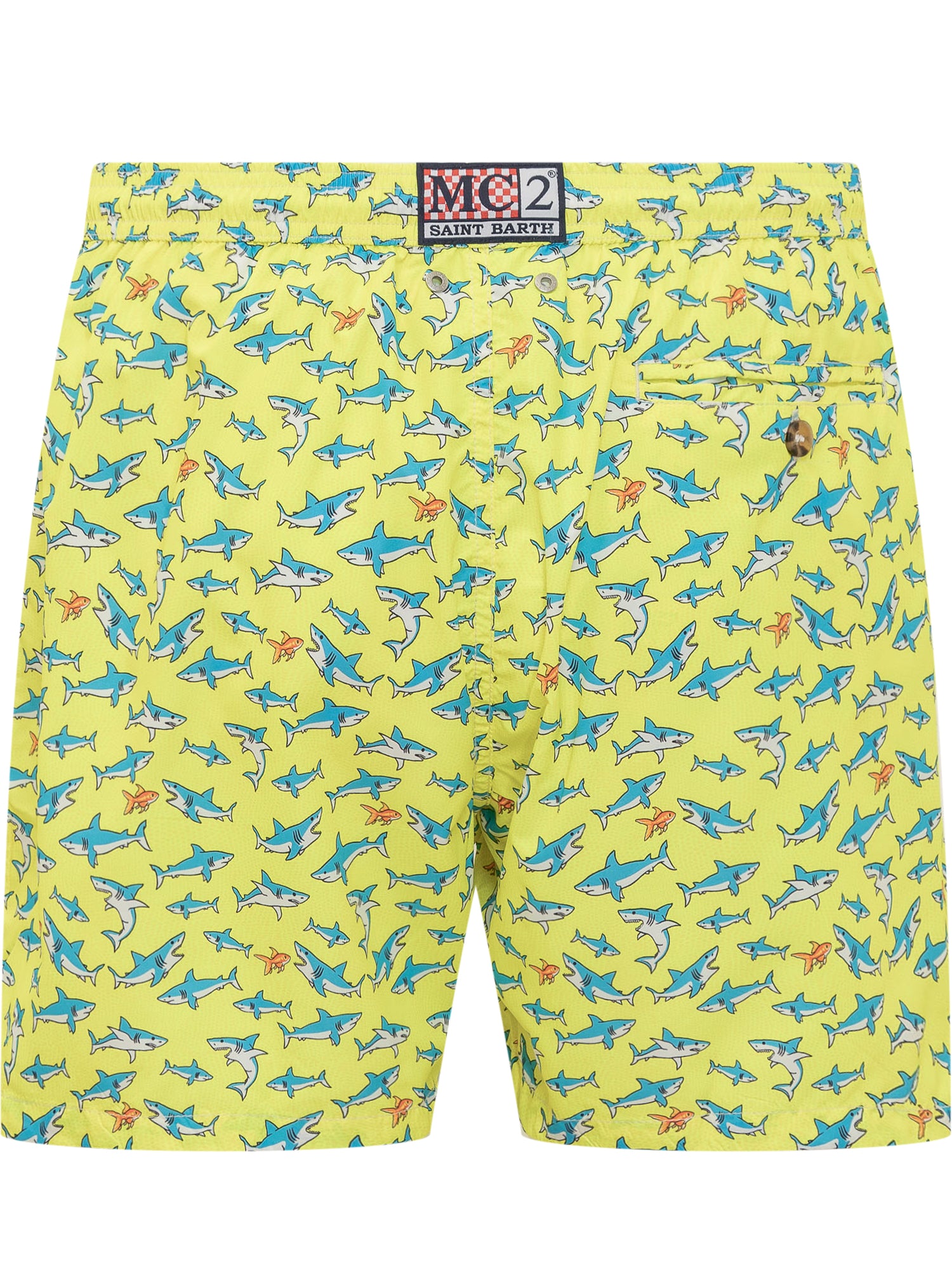Swimsuit. Internal mesh. Drawstring waist. Three pockets. Logo patch on the back. Shark all-over print.