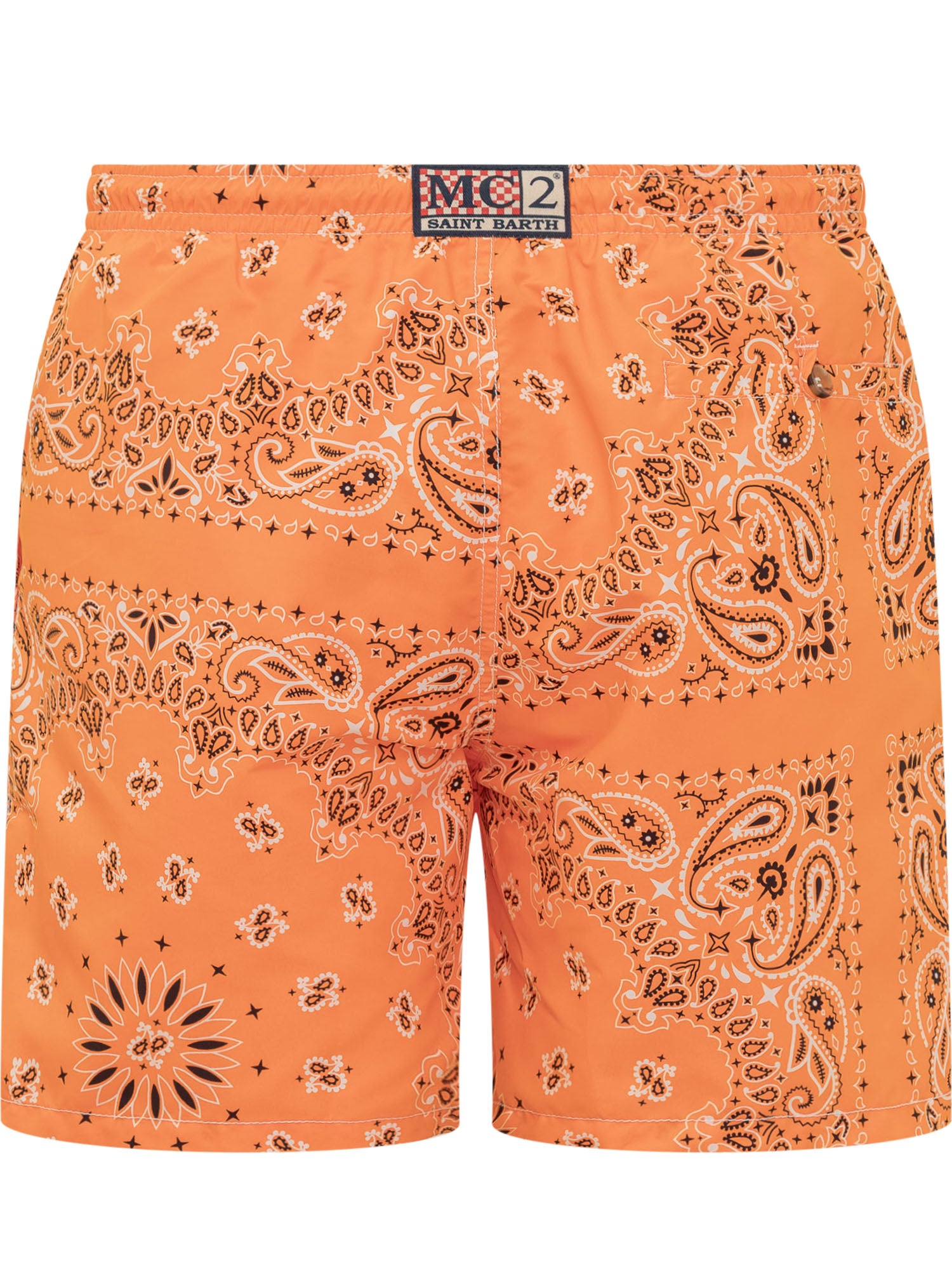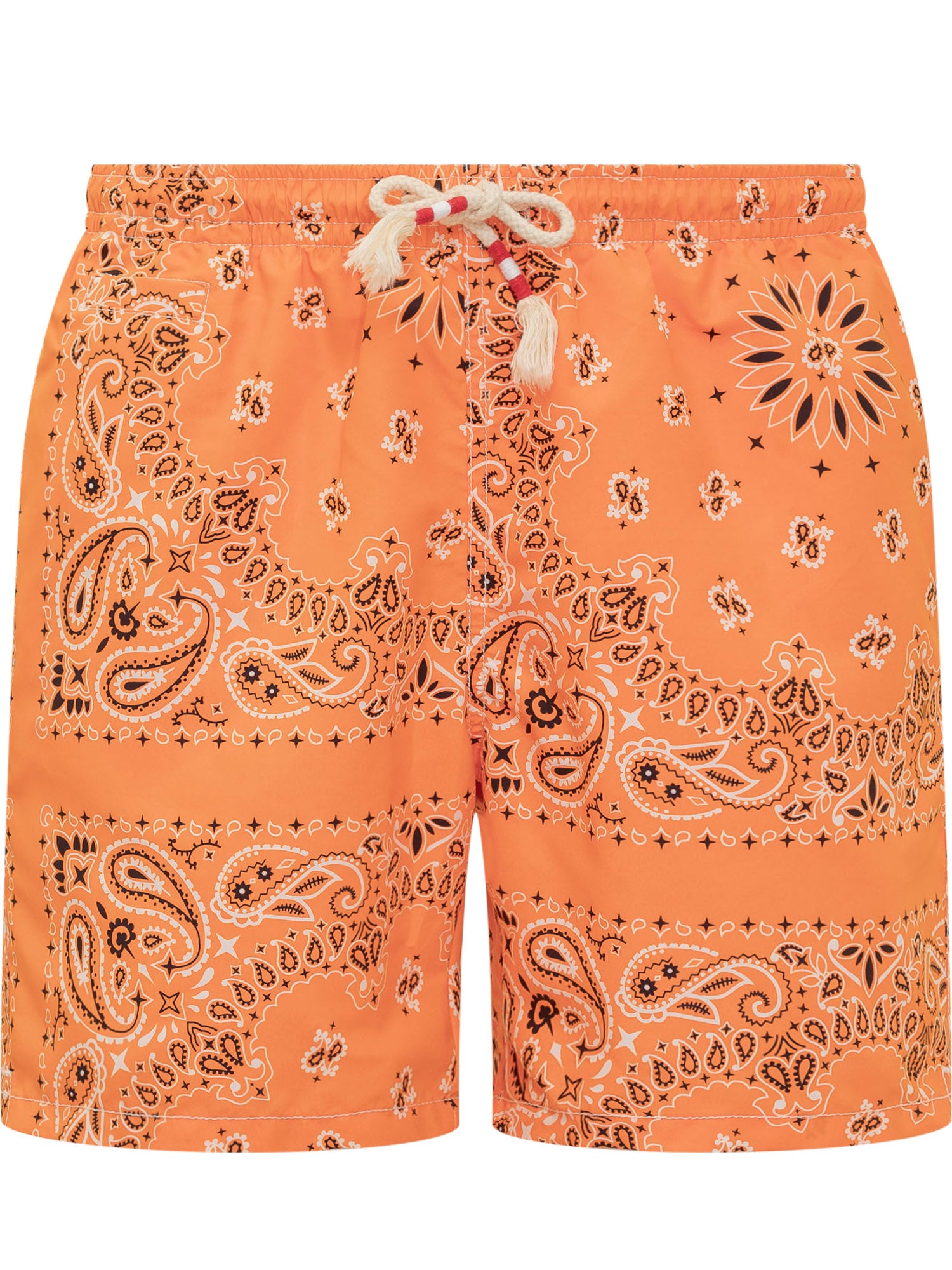 Internal mesh. Drawstring waist. Back pocket. All over bandana print