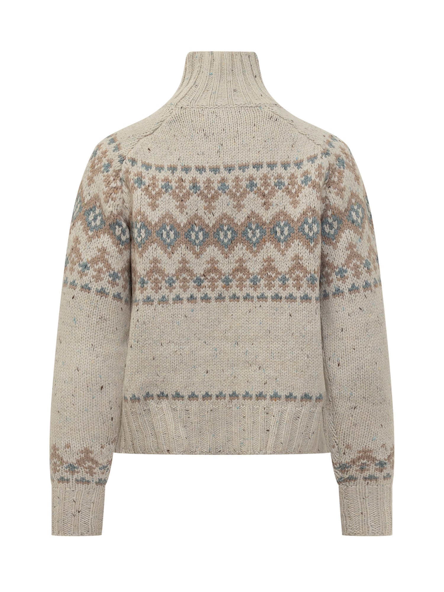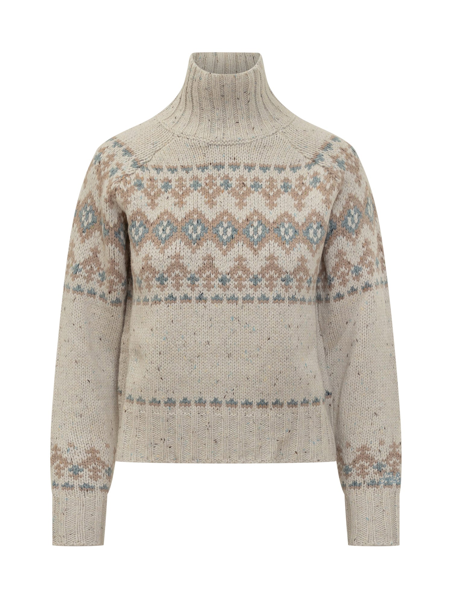 MC2 Saint Barth Myra Donegal wool sweater with jacquard pattern in natural beige and light blue tones. Ribbed high neck and relaxed fit.