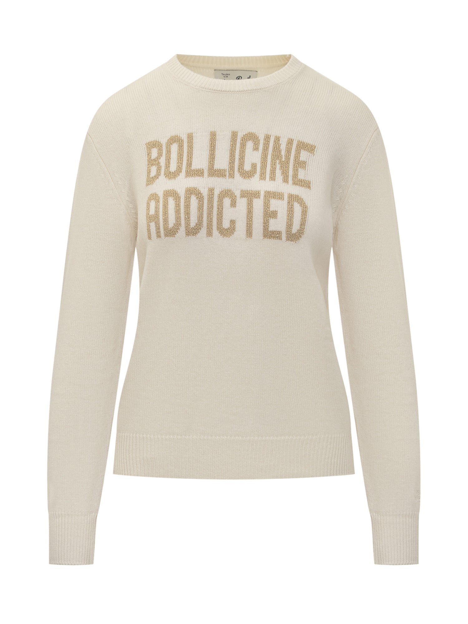 White crewneck sweater St. Barth featuring Bollicine Addicted lettering in golden crystals.