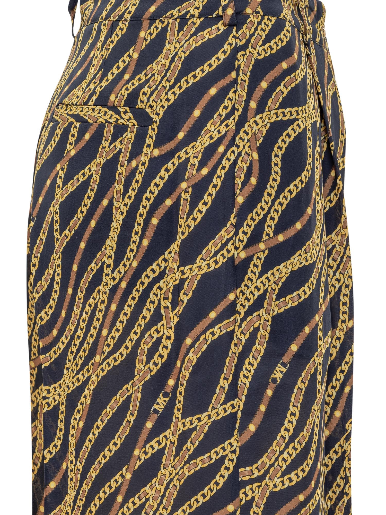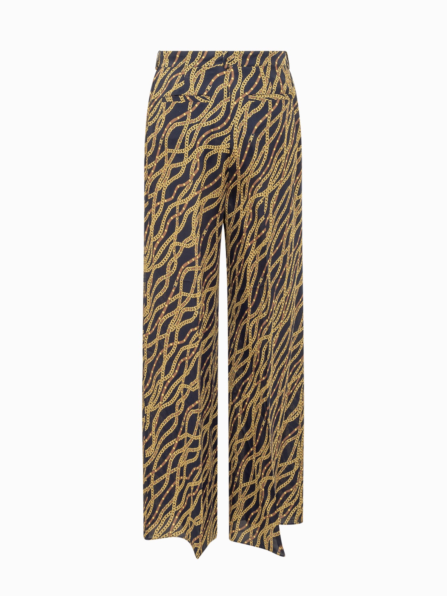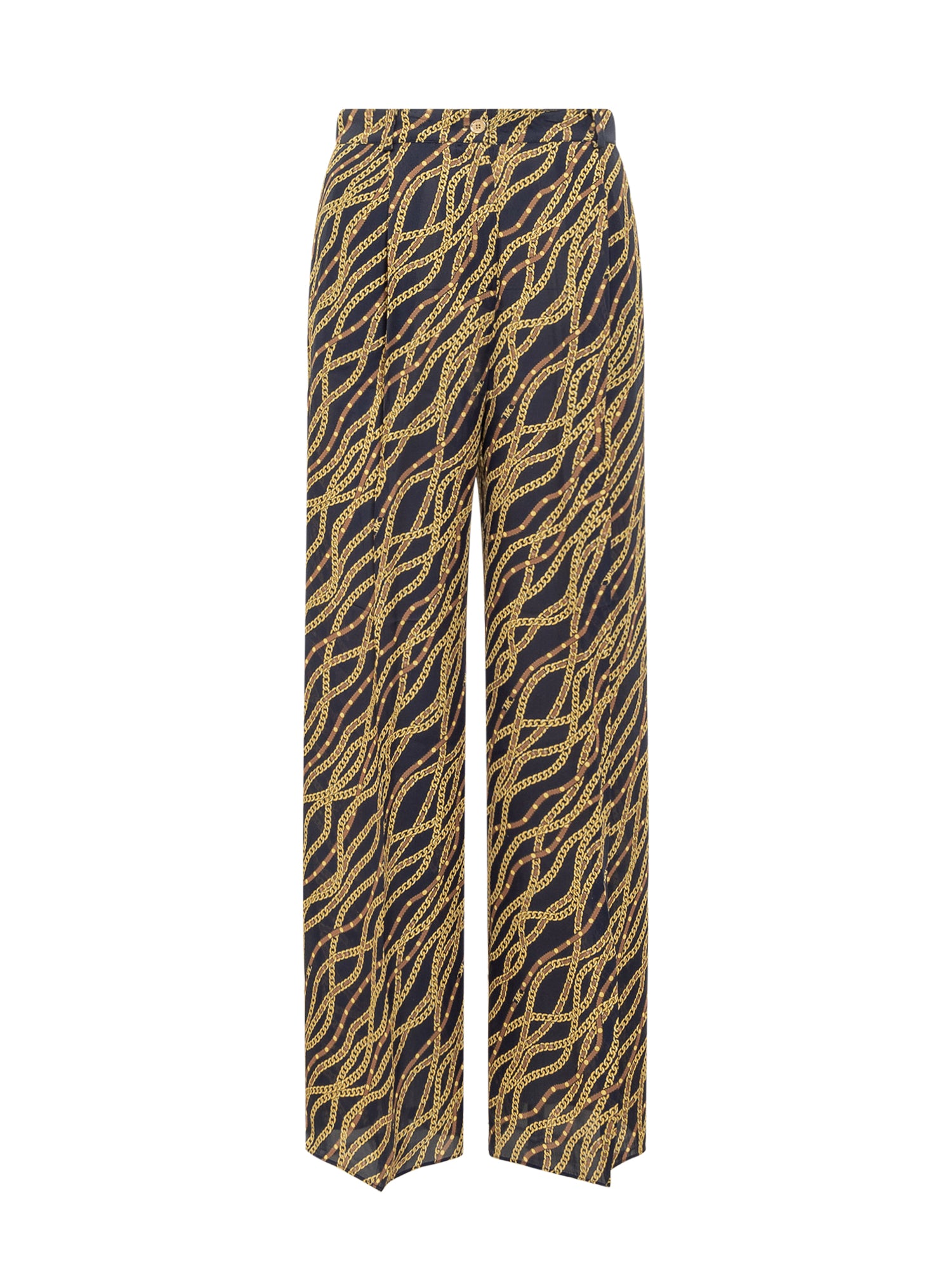 Long wide leg pants. Four pockets. Belt loops. All-over Chain pattern.