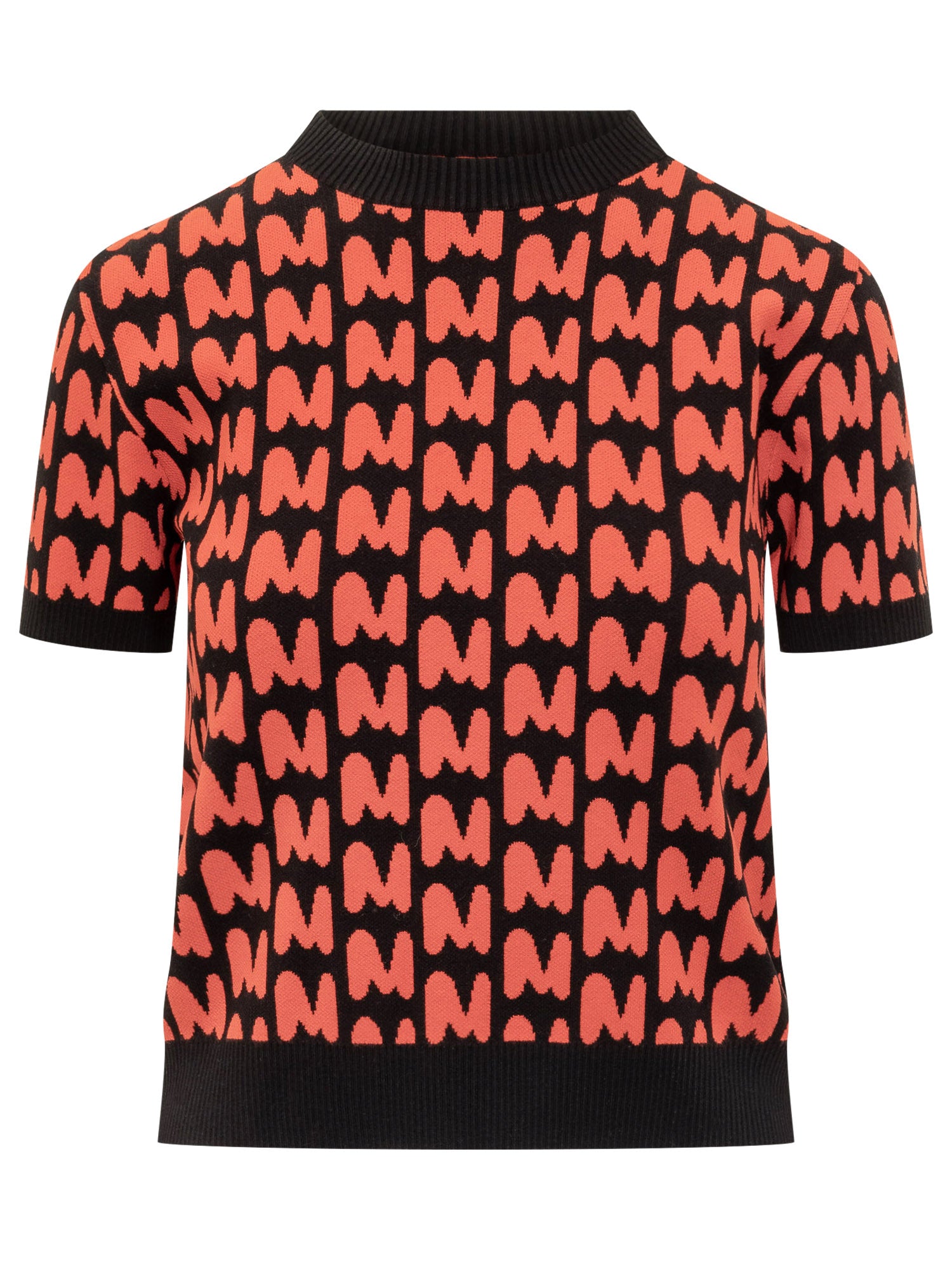 MSGM jacquard knit top with all-over pattern in black and orange. Short sleeves and ribbed crew neck.