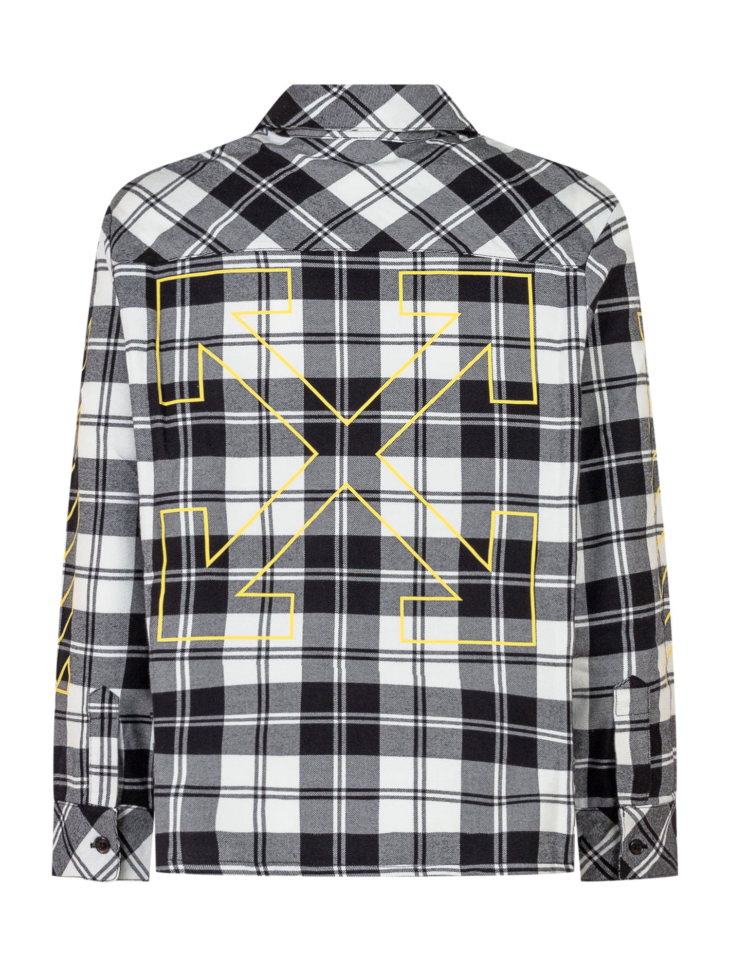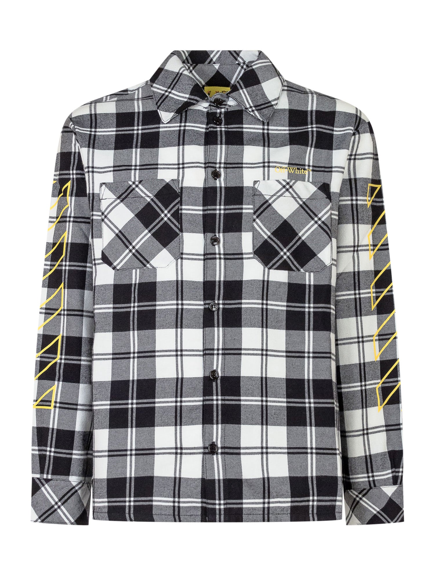 Off-White flannel checked shirt in black and white. Features chest pockets, embroidered yellow logo and iconic arrow print on the back.