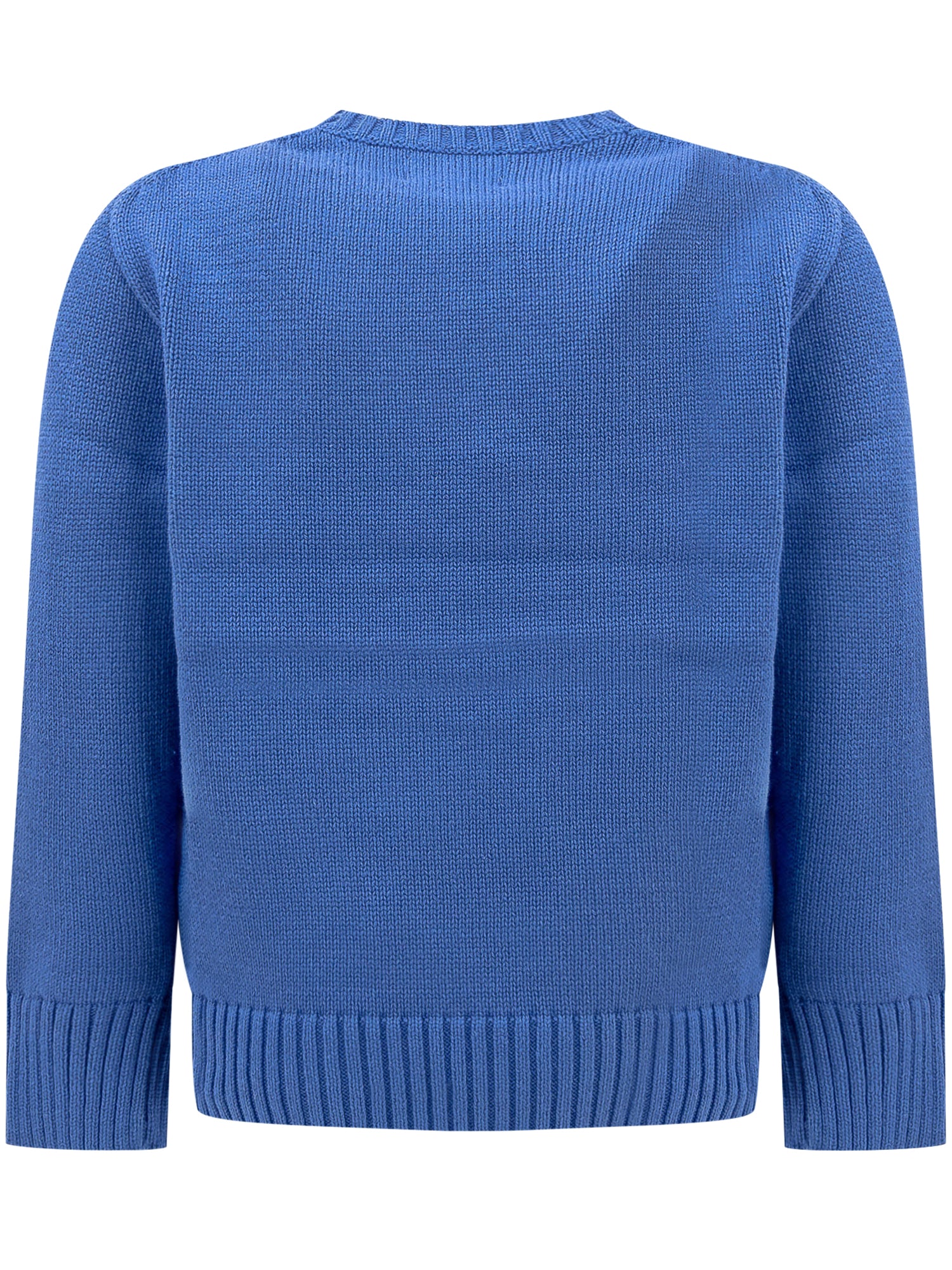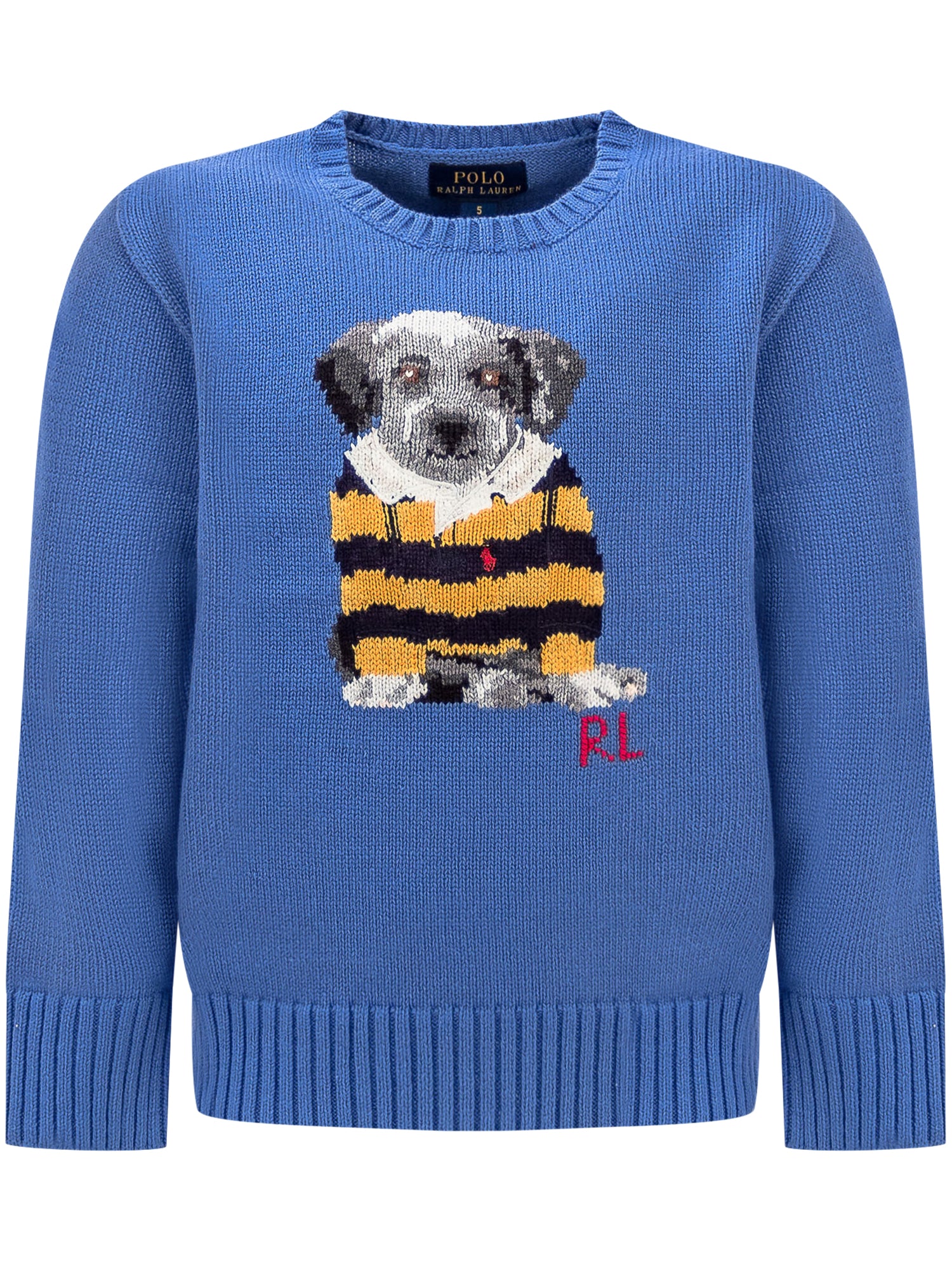 Blue long-sleeved sweater. Ribbed collar, cuffs and hem. Puppy embroidery on front.