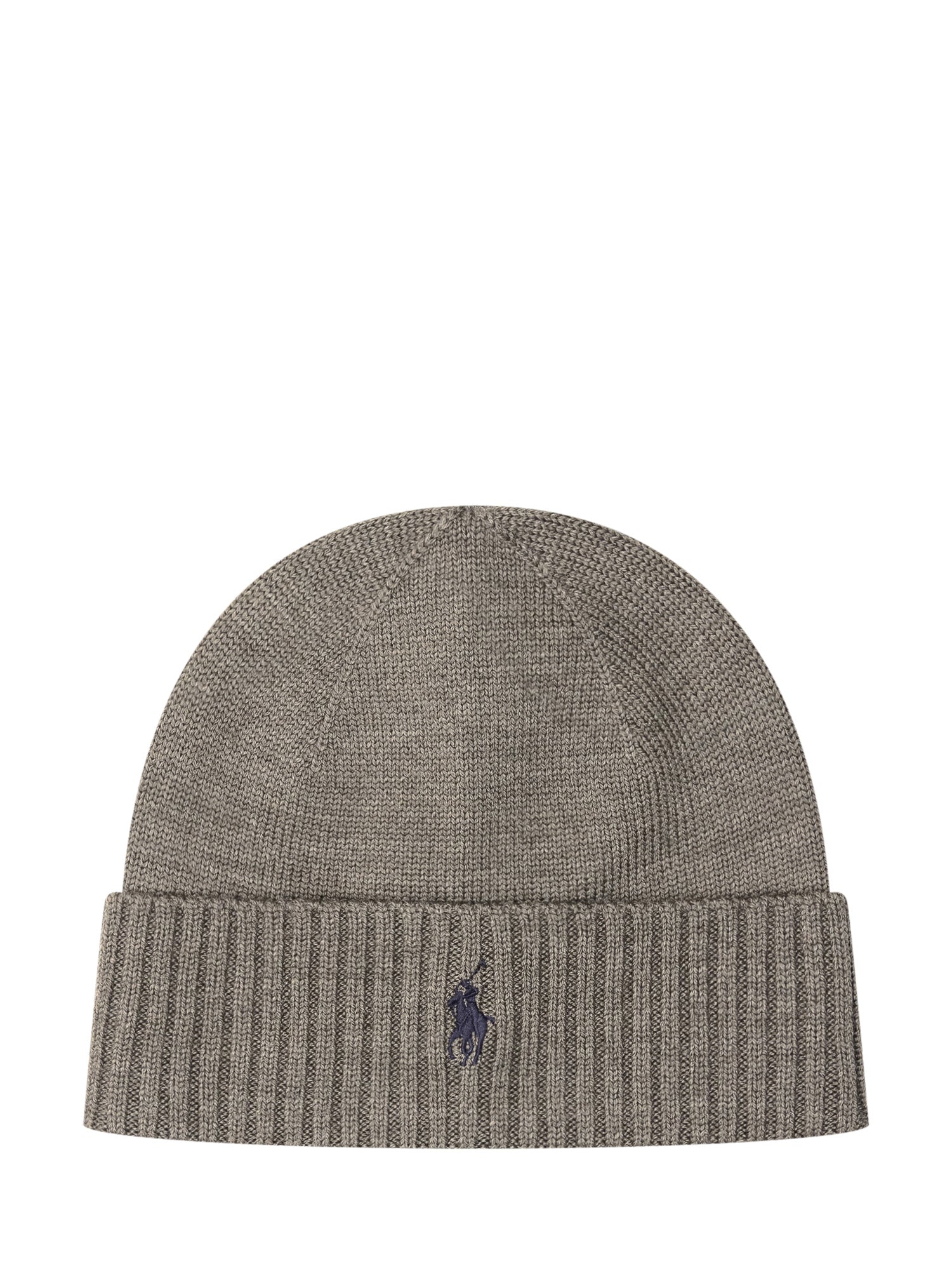Polo Ralph Lauren grey knit beanie featuring embroidered blue logo.