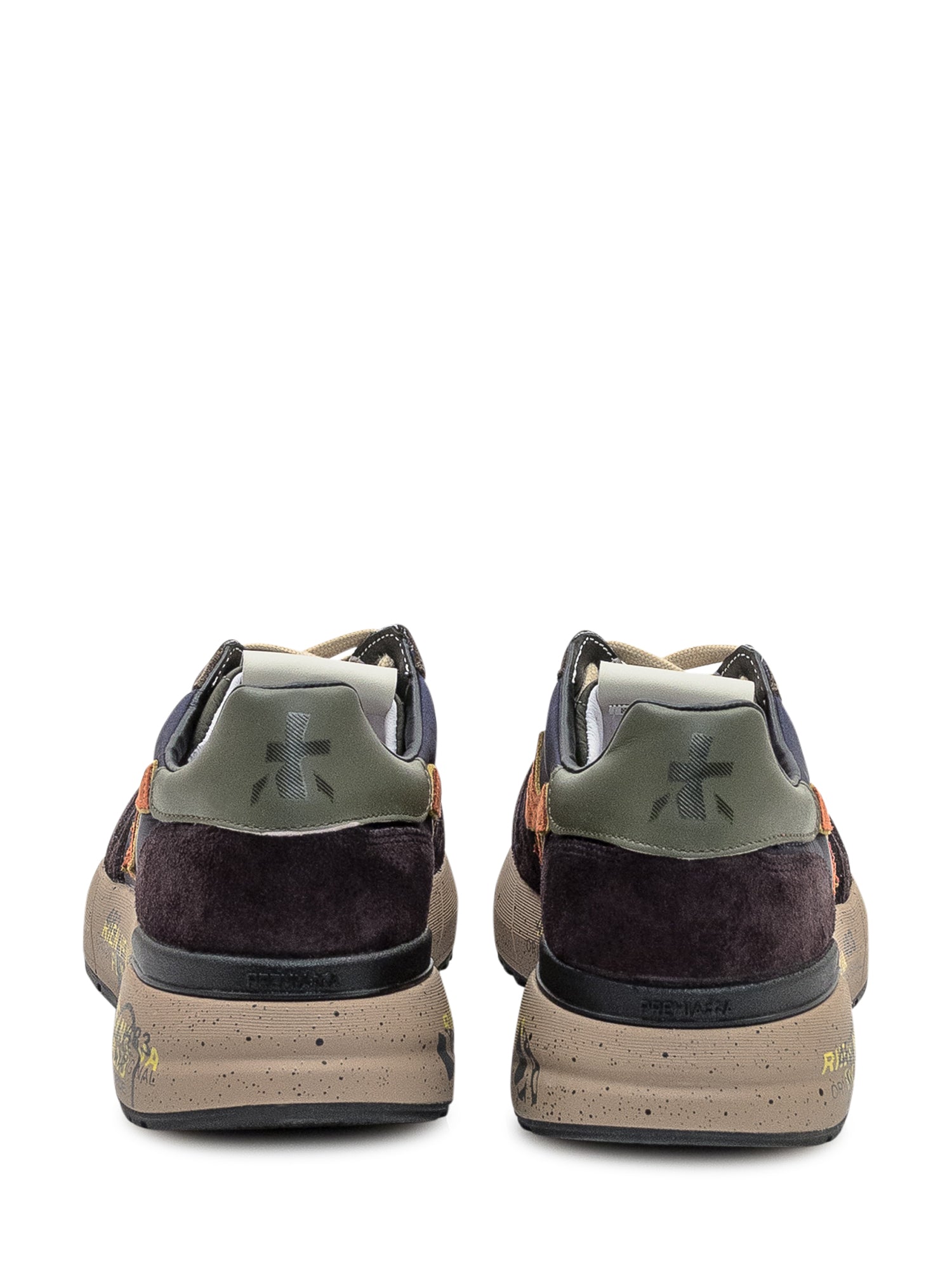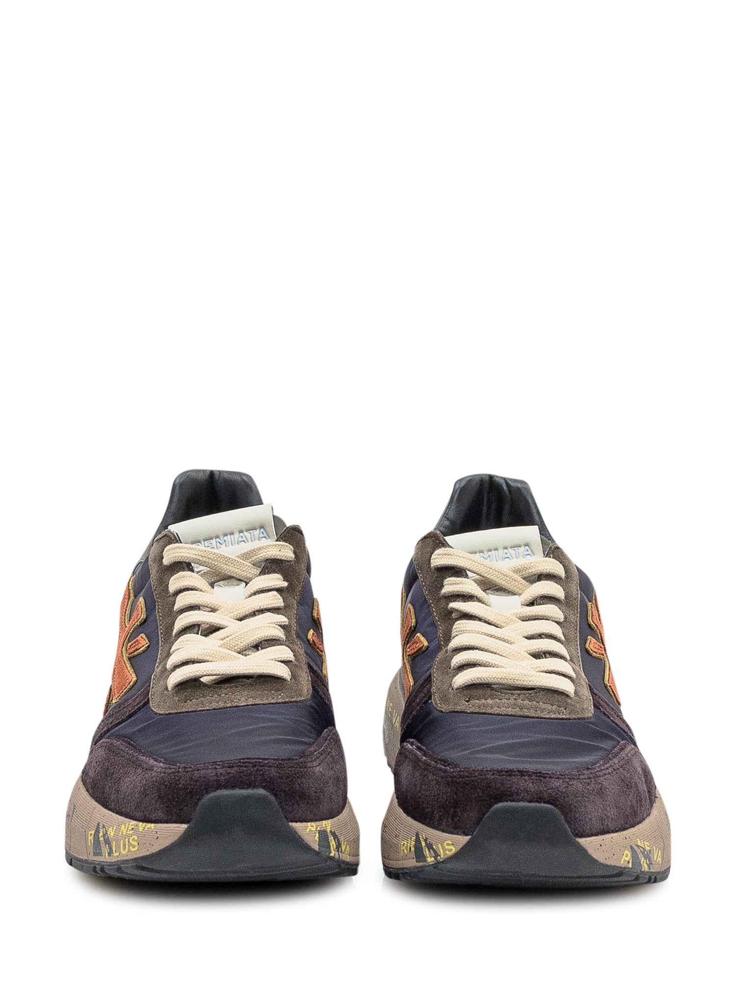 Premiata sneakers in leather and suede with blue fabric inserts and contrasting brown details.