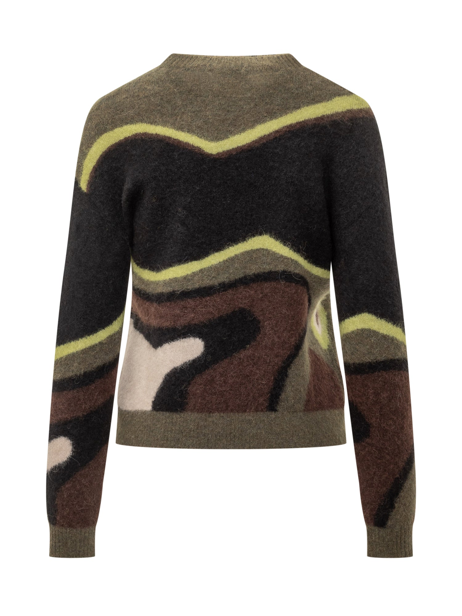 Quilisia wool sweater with abstract multicolor design in earthy tones.