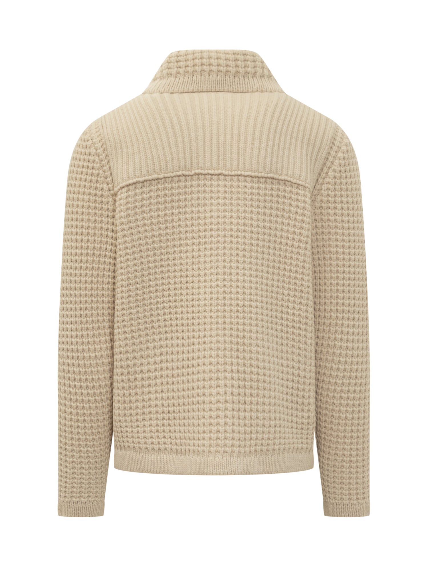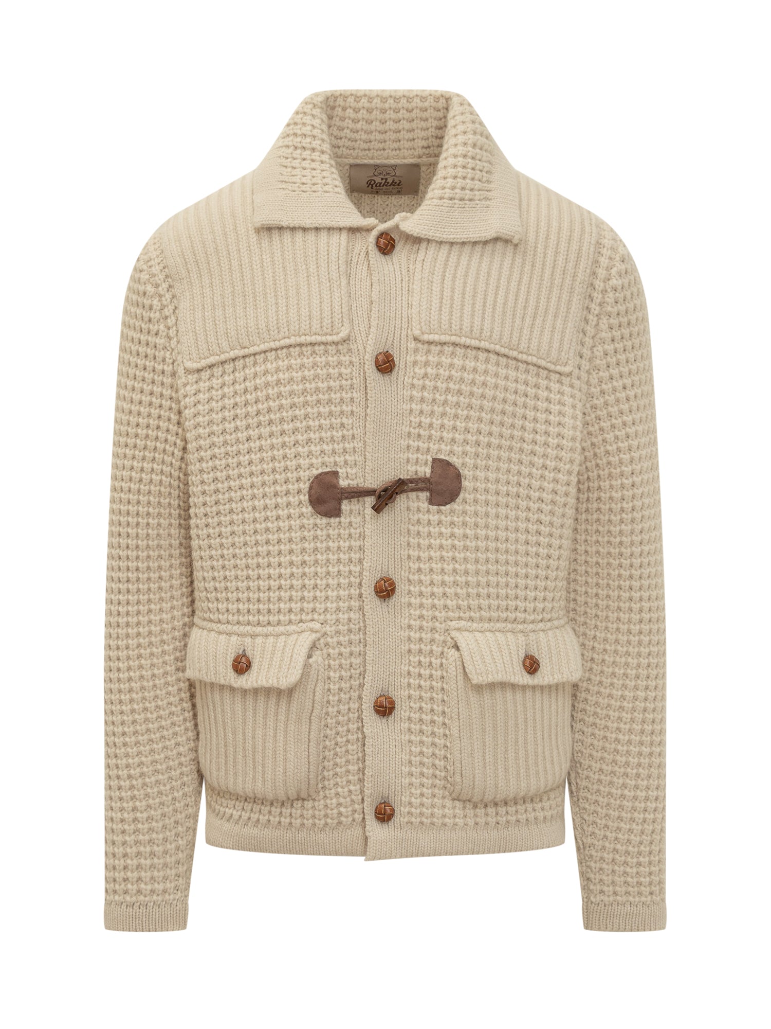 Rakkì beige knit cardigan with front pockets, button fastening and leather hook detail.