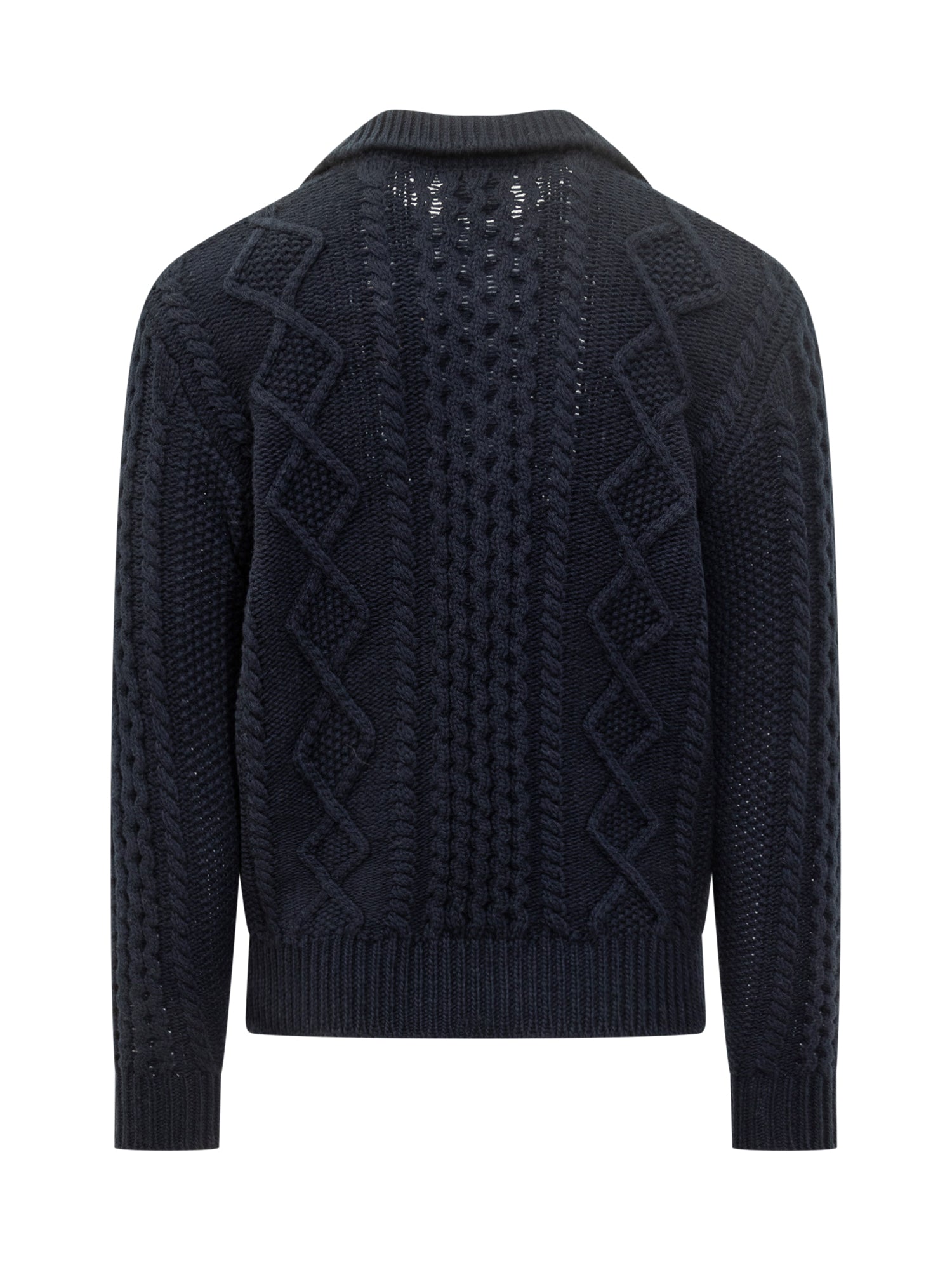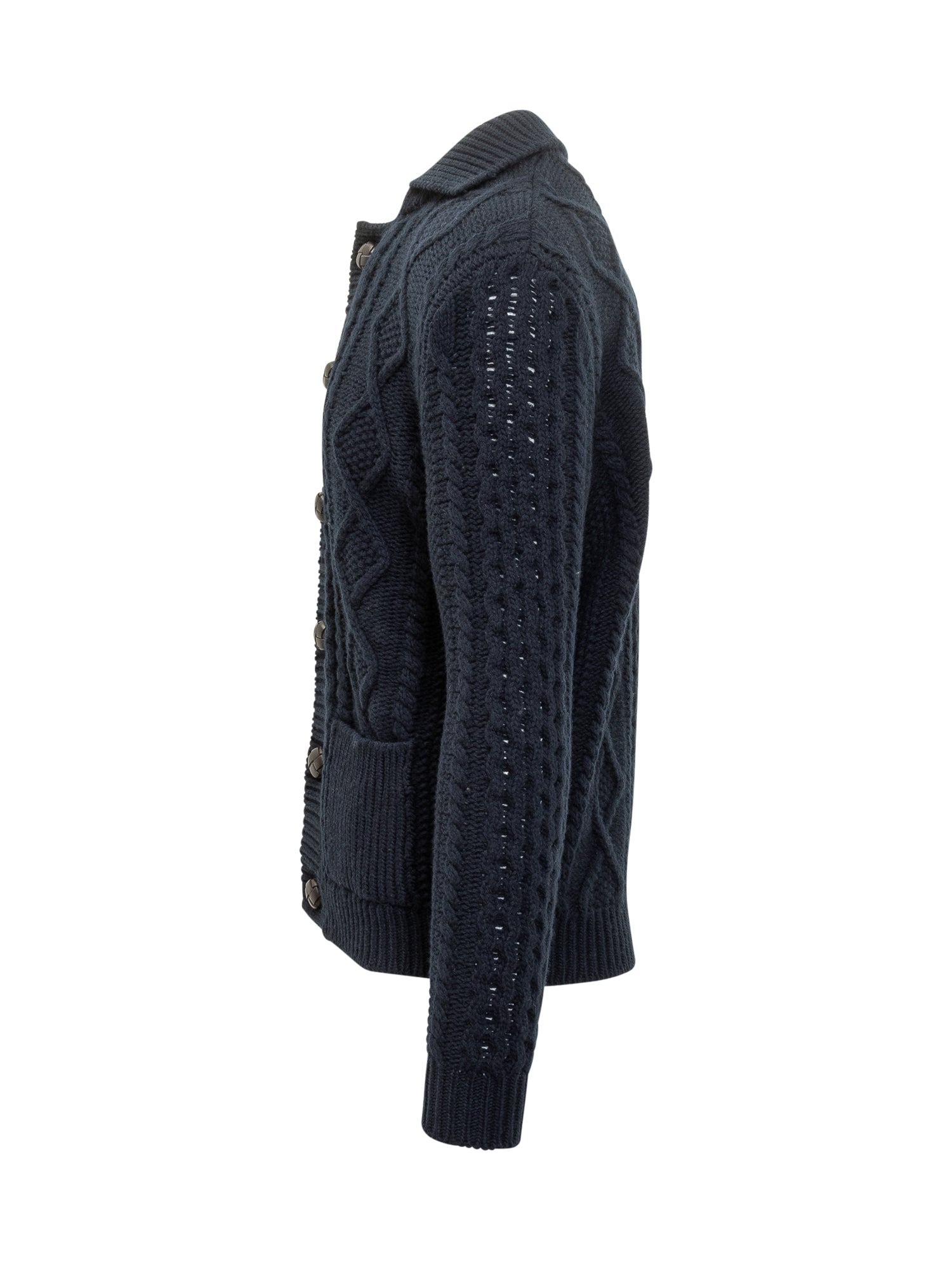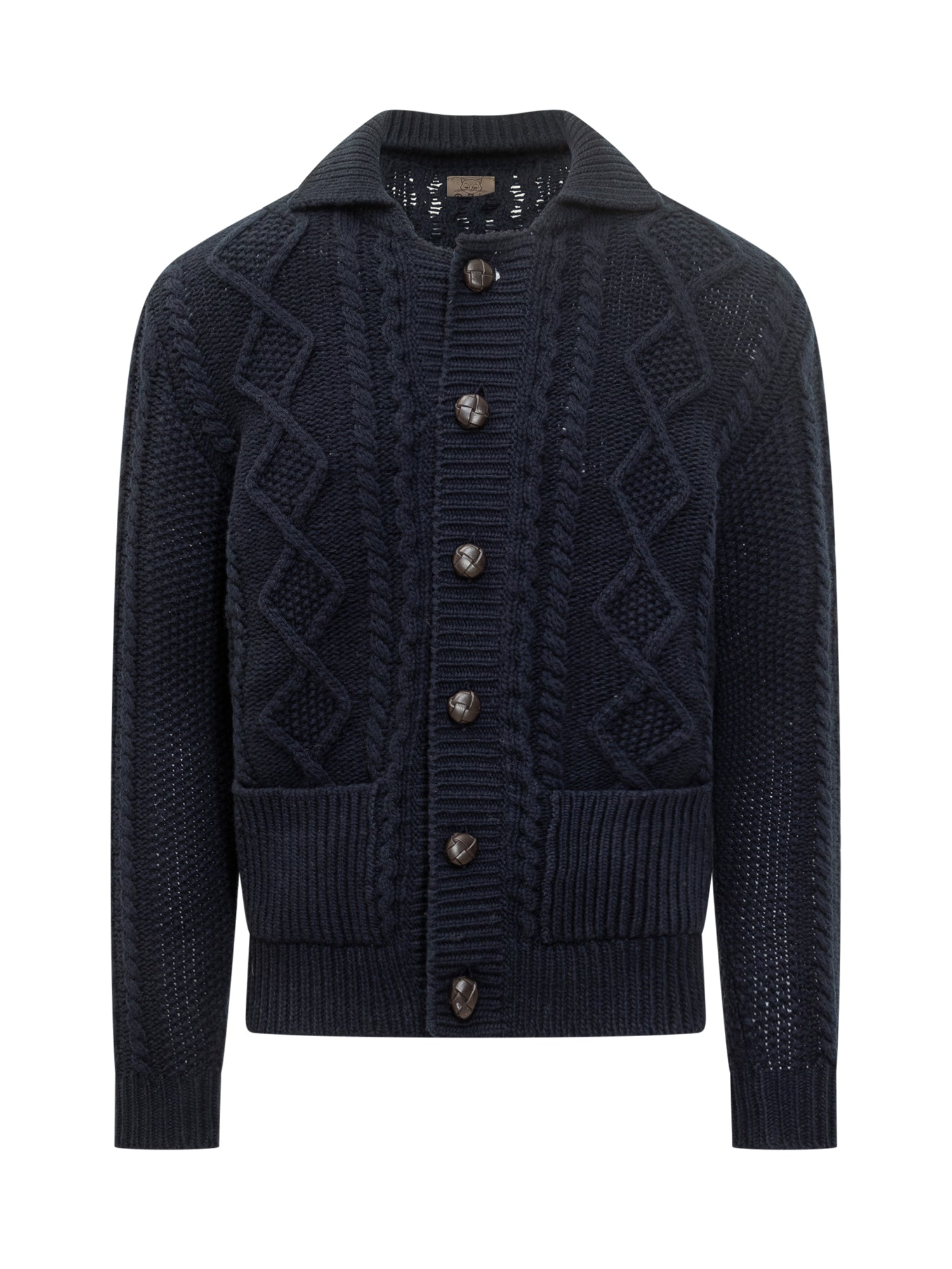 Rakki navy wool cardigan featuring cable-knit and diamond design. Shirt collar, front pockets and contrasting buttons.