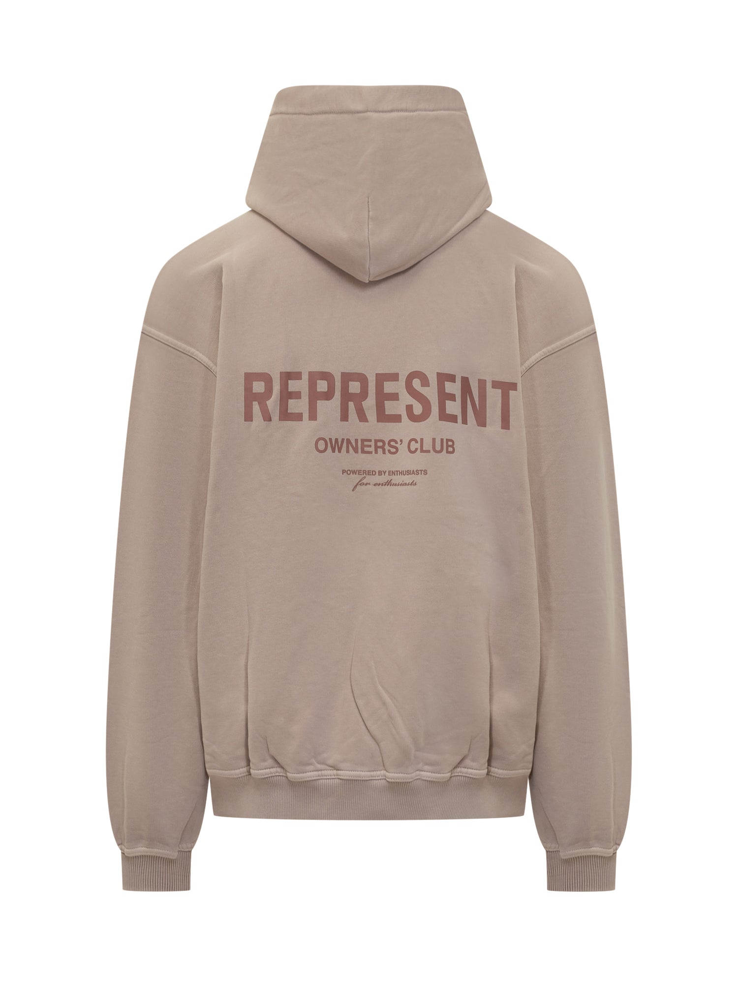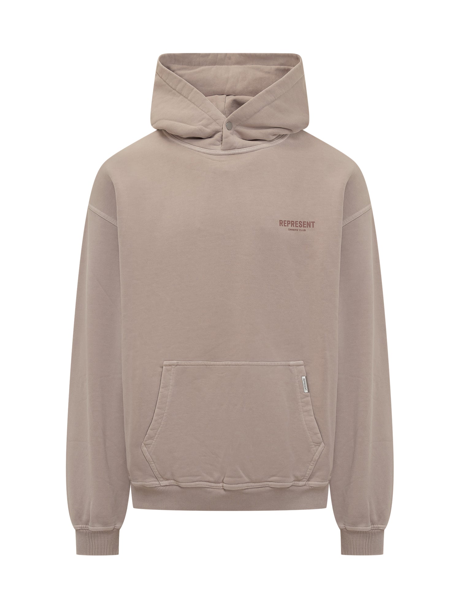 Represent beige cotton hoodie featuring a kangaroo pocket and small chest logo.