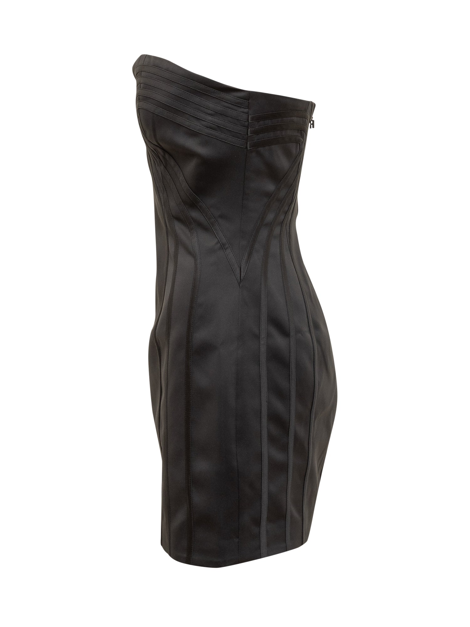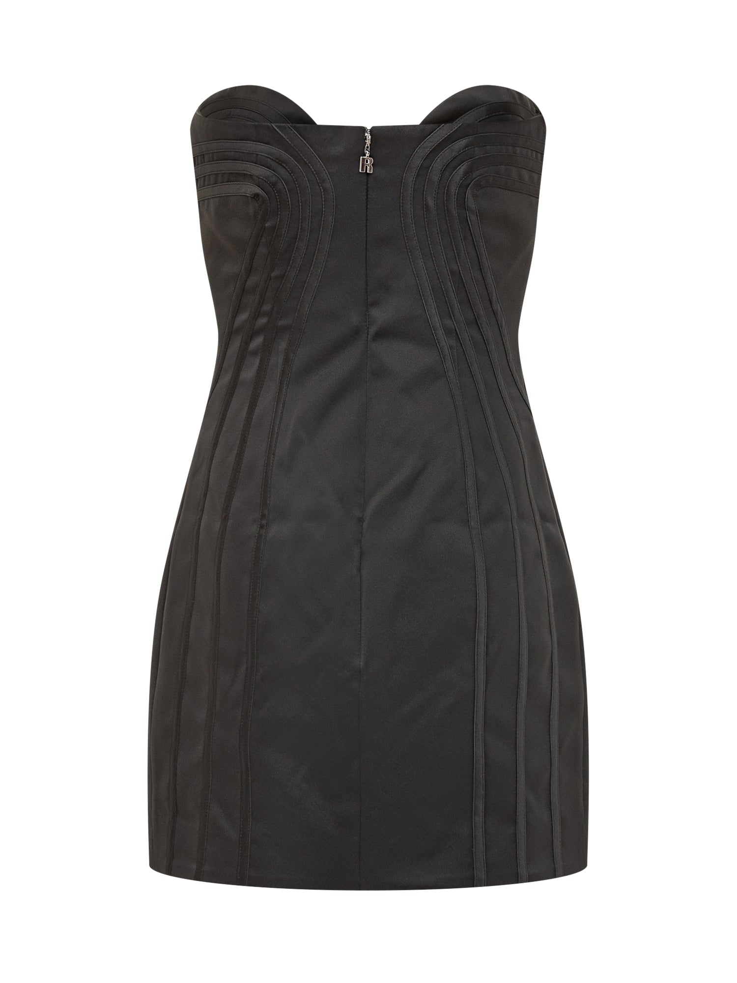 Black satin mini dress by ROTATE, featuring a sweetheart neckline and structured seam details.