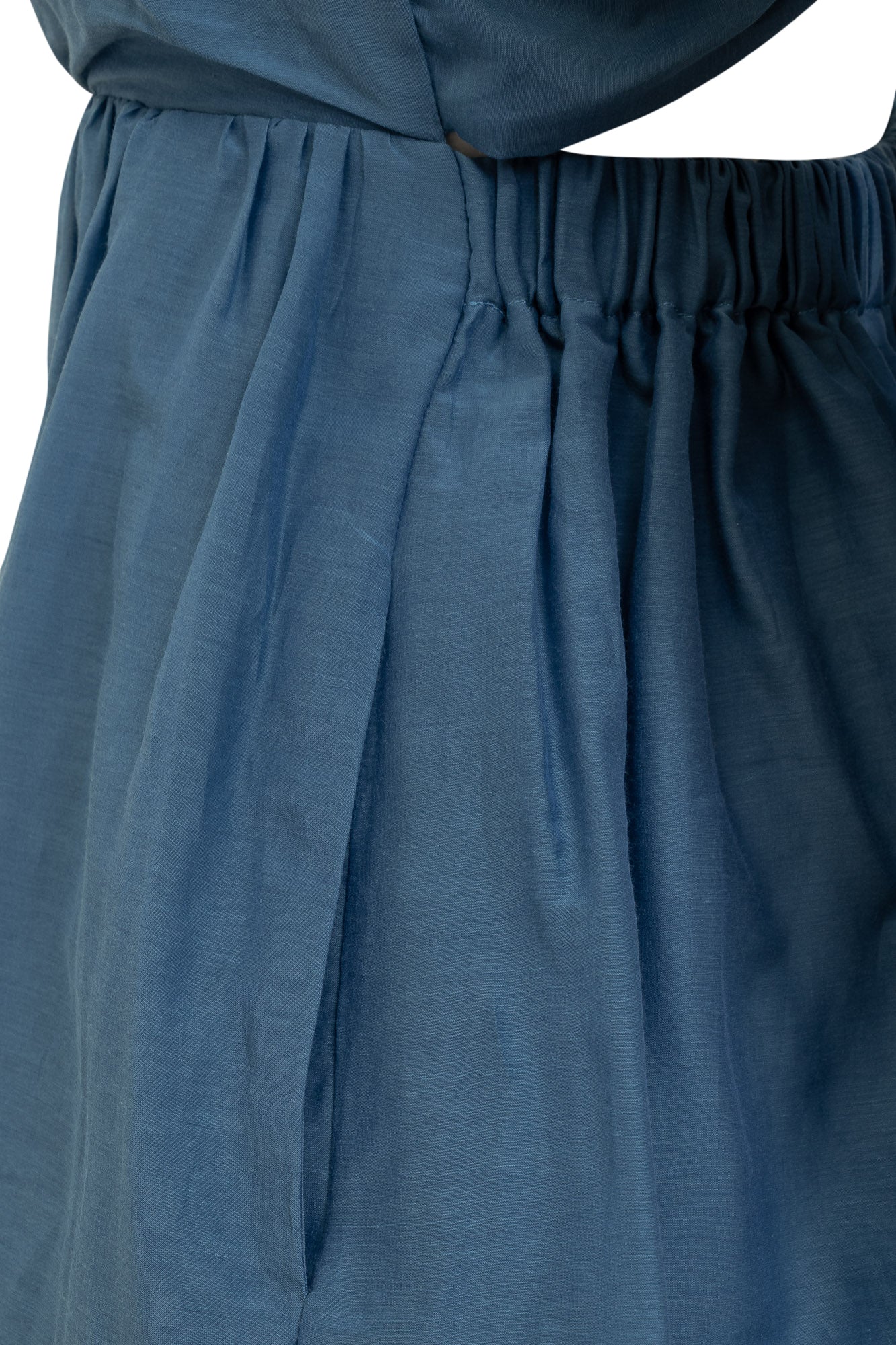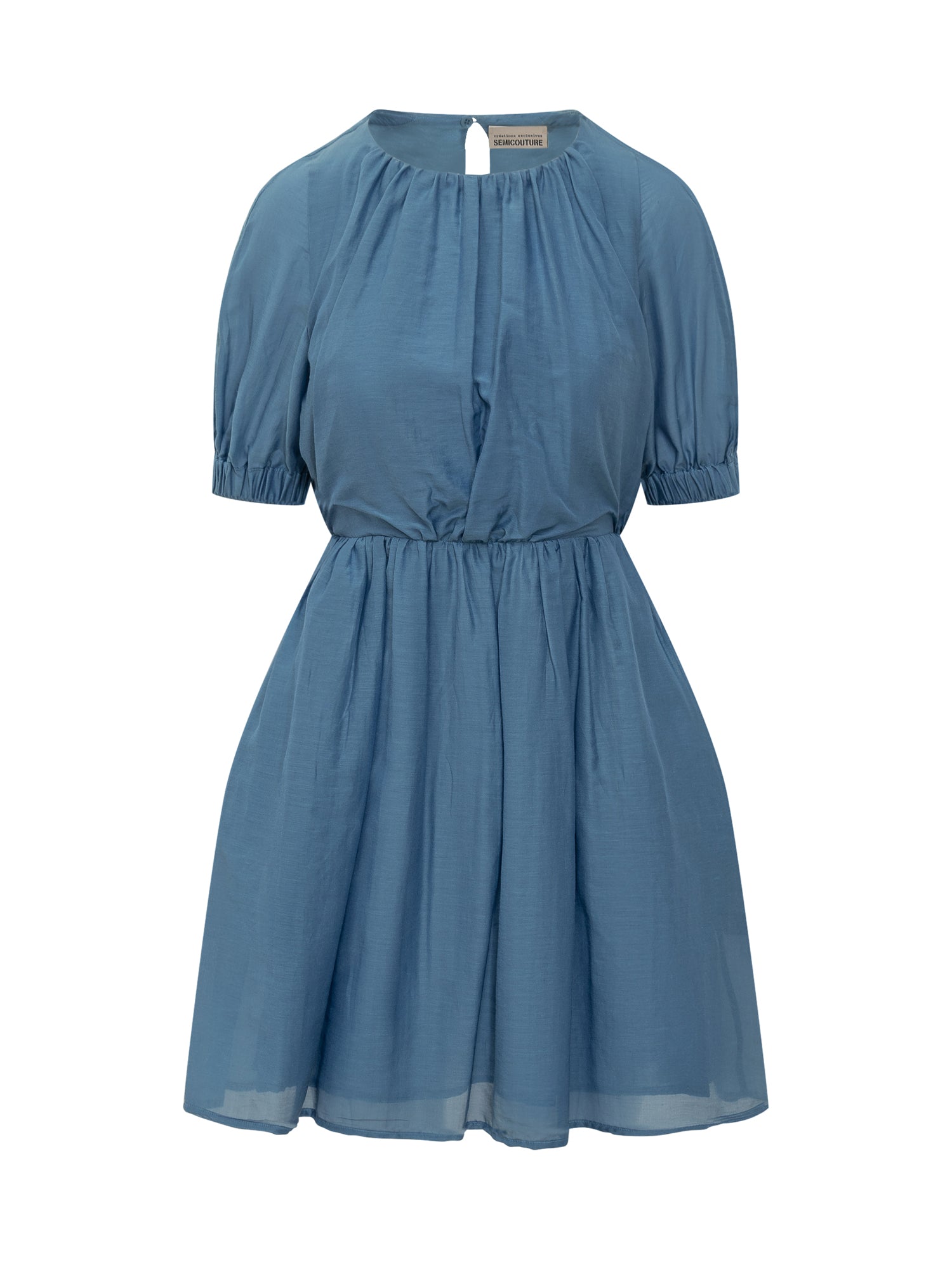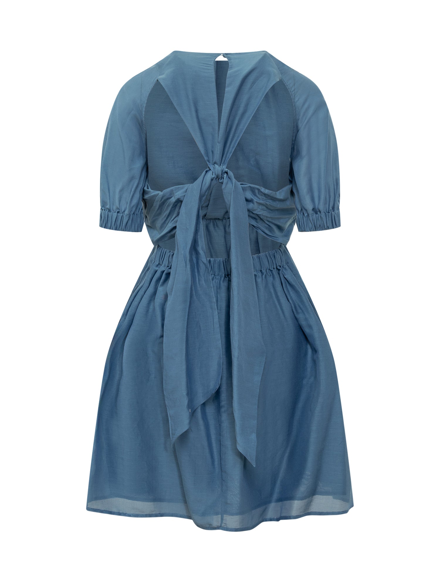 Mini dress with short sleeves in cotton and silk blend. Round neck. Button closure on the back. Back opening with bow. Elasticated hems. Curling at the waist. Two oblique side pockets.