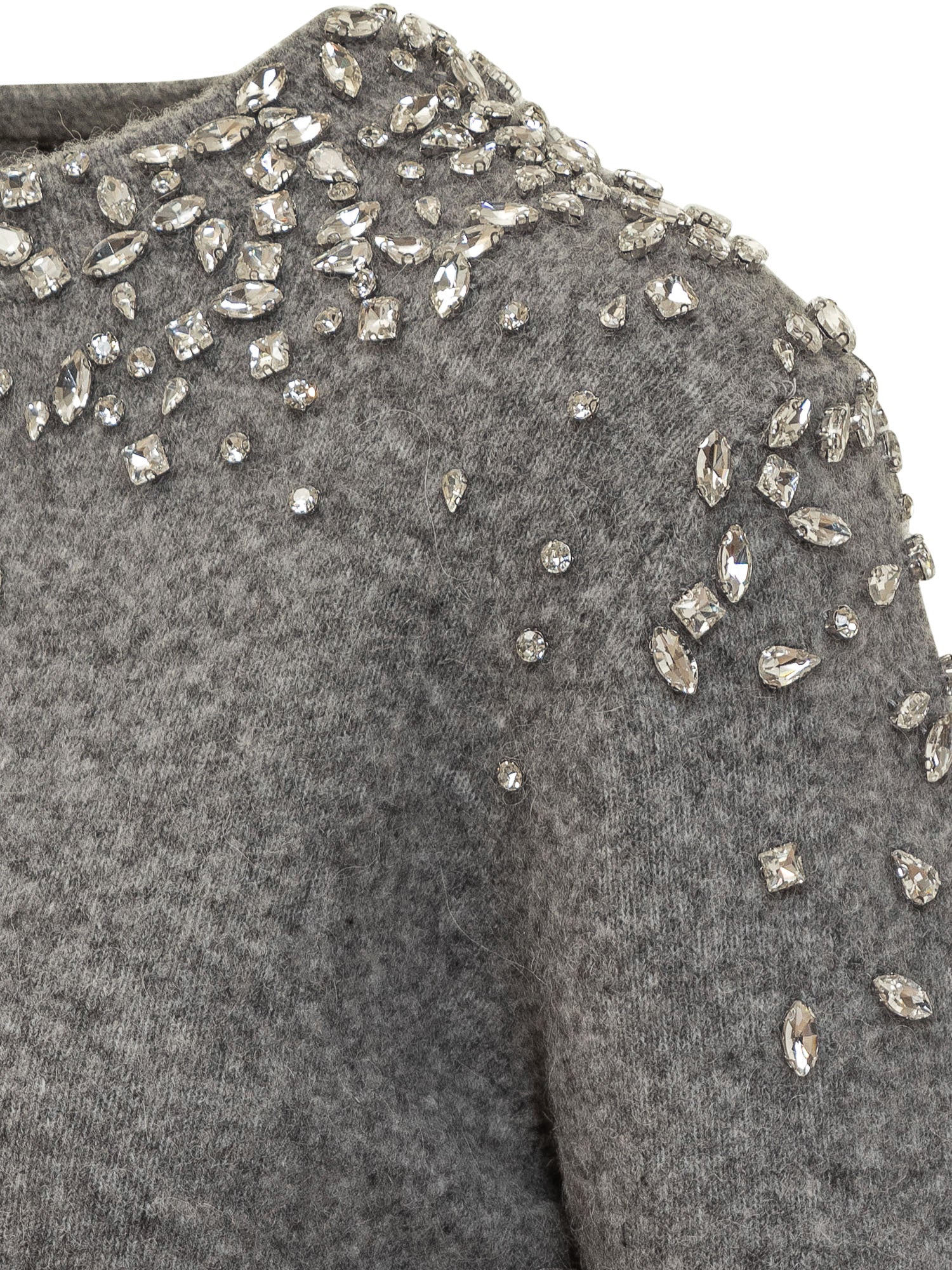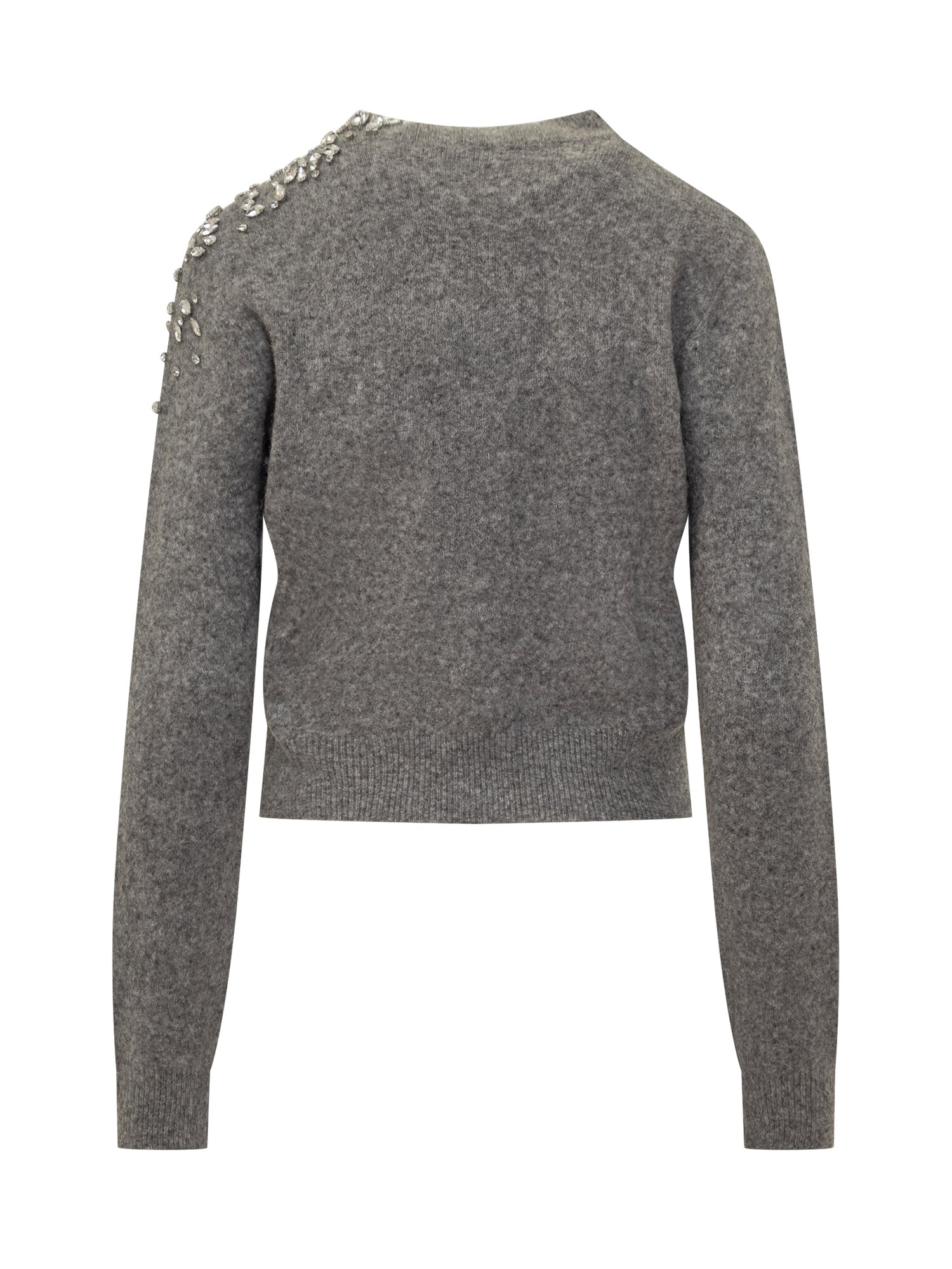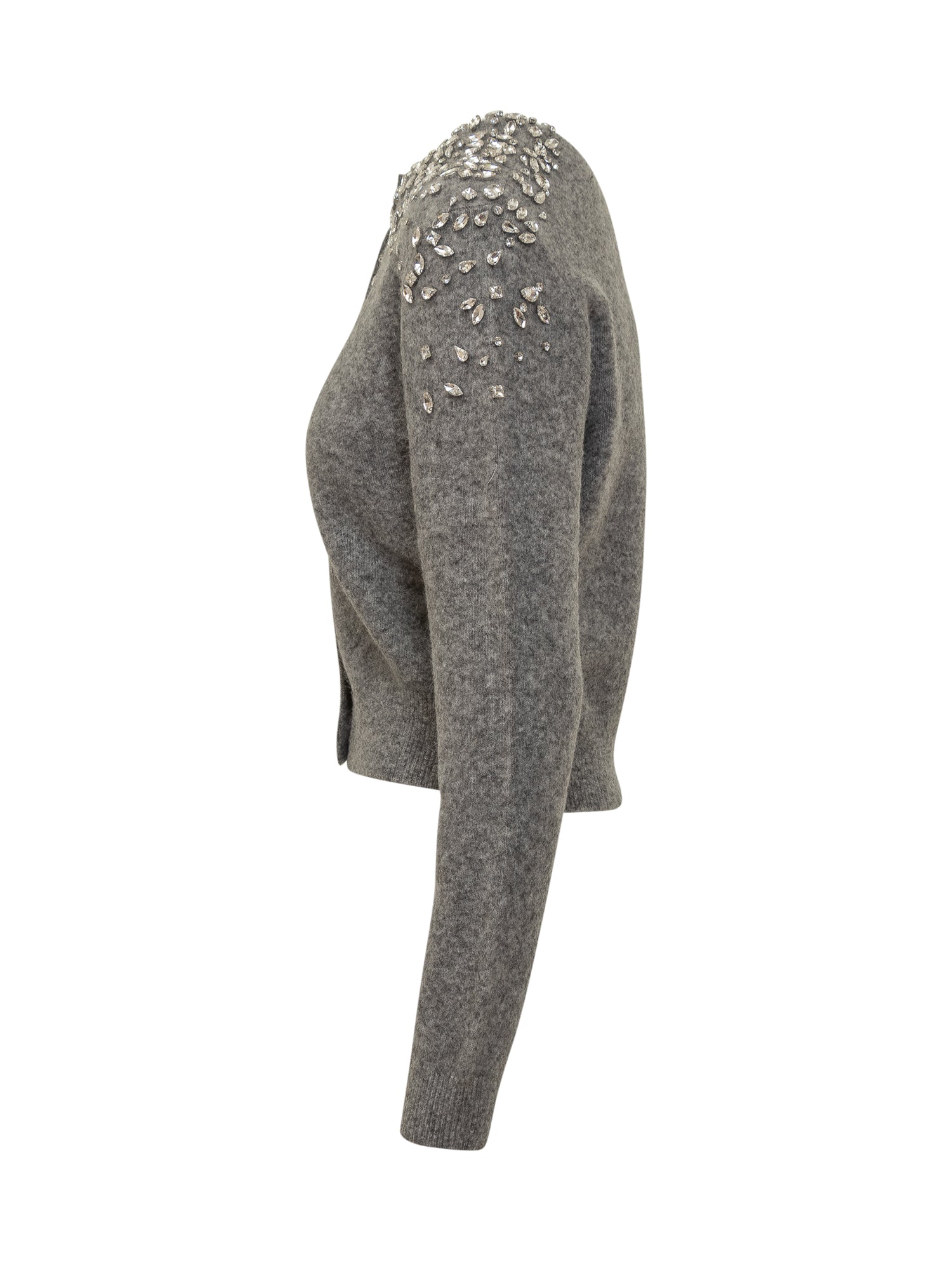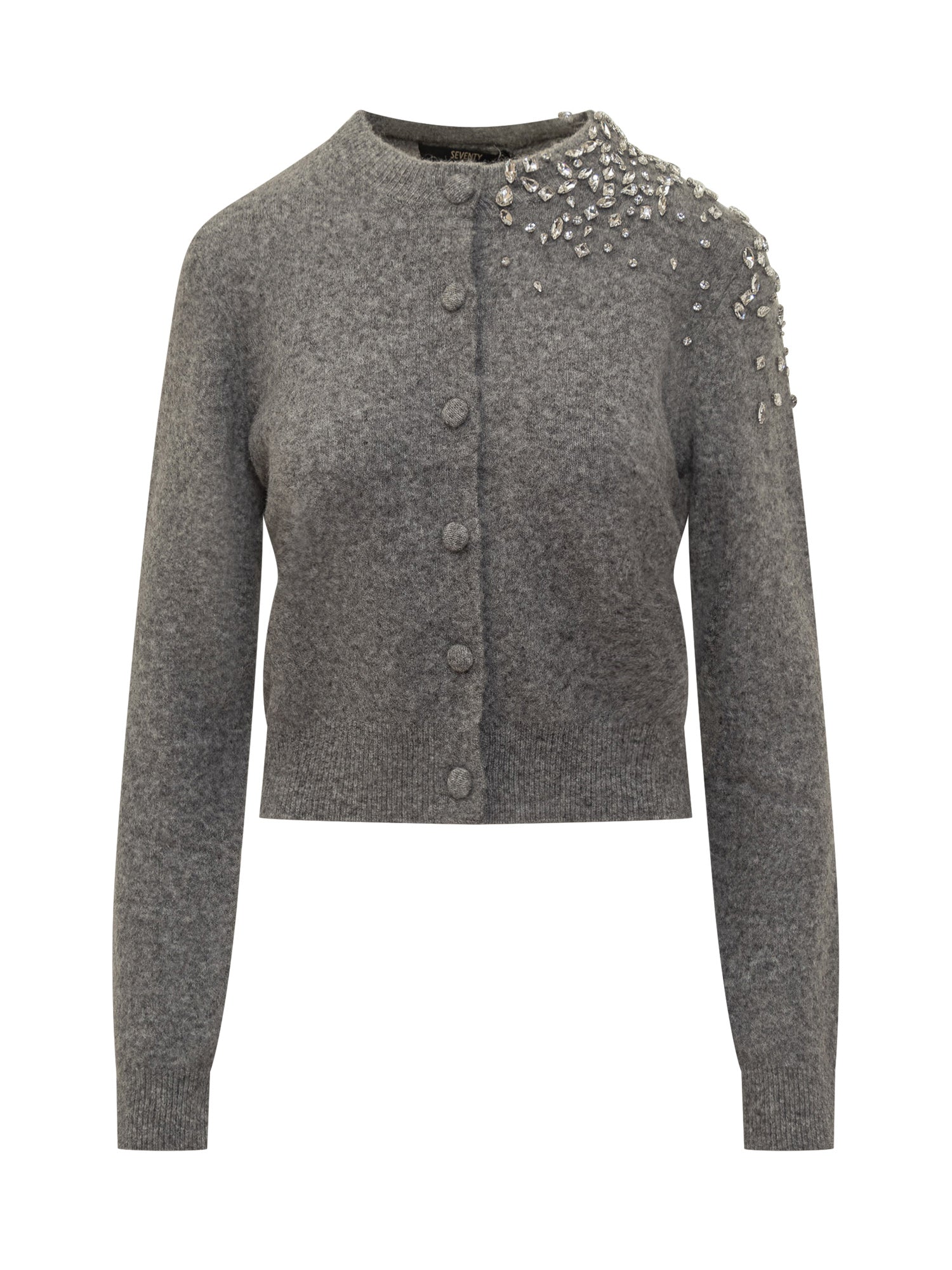 Seventy 19.70 grey wool cardigan with covered buttons and jeweled shoulder details.