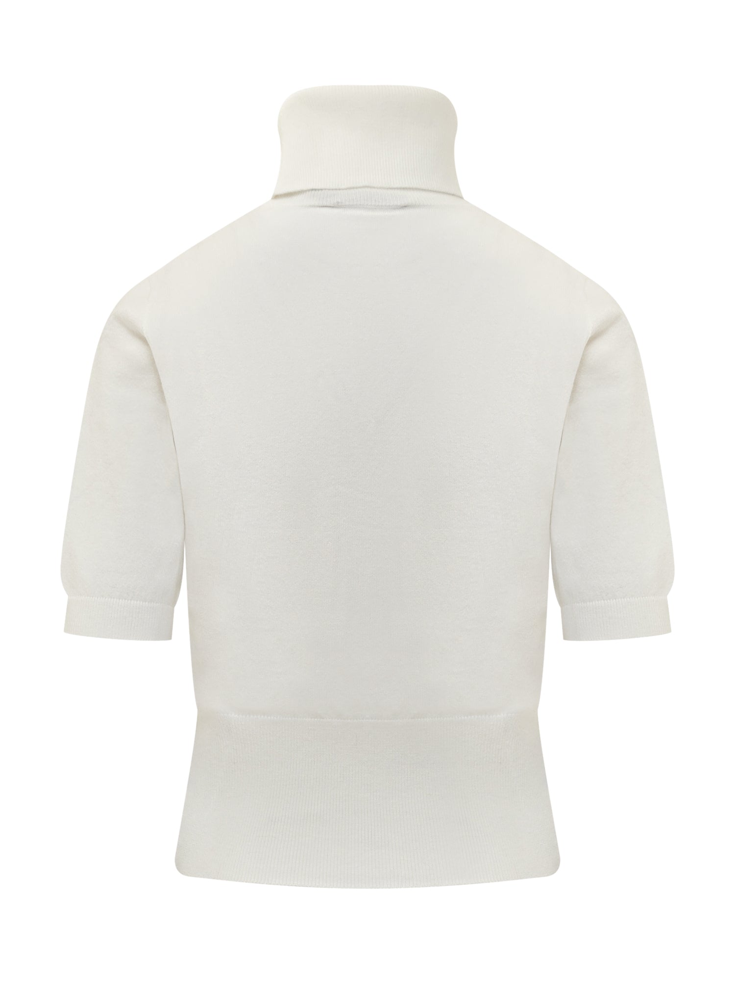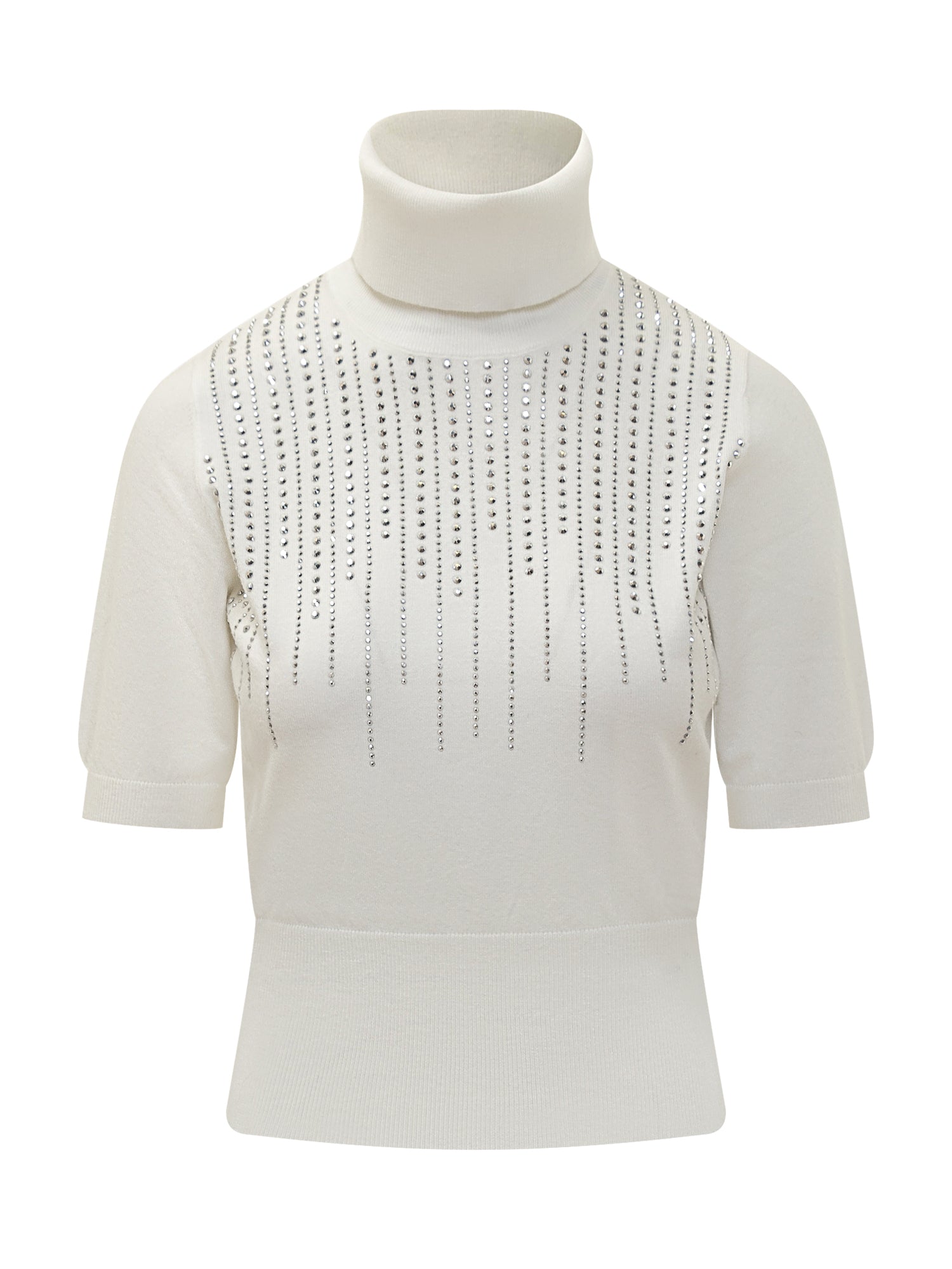 Seventy 19.70 ivory knit turtleneck with short sleeves and front rhinestone details. Slim fit and shimmering finish.