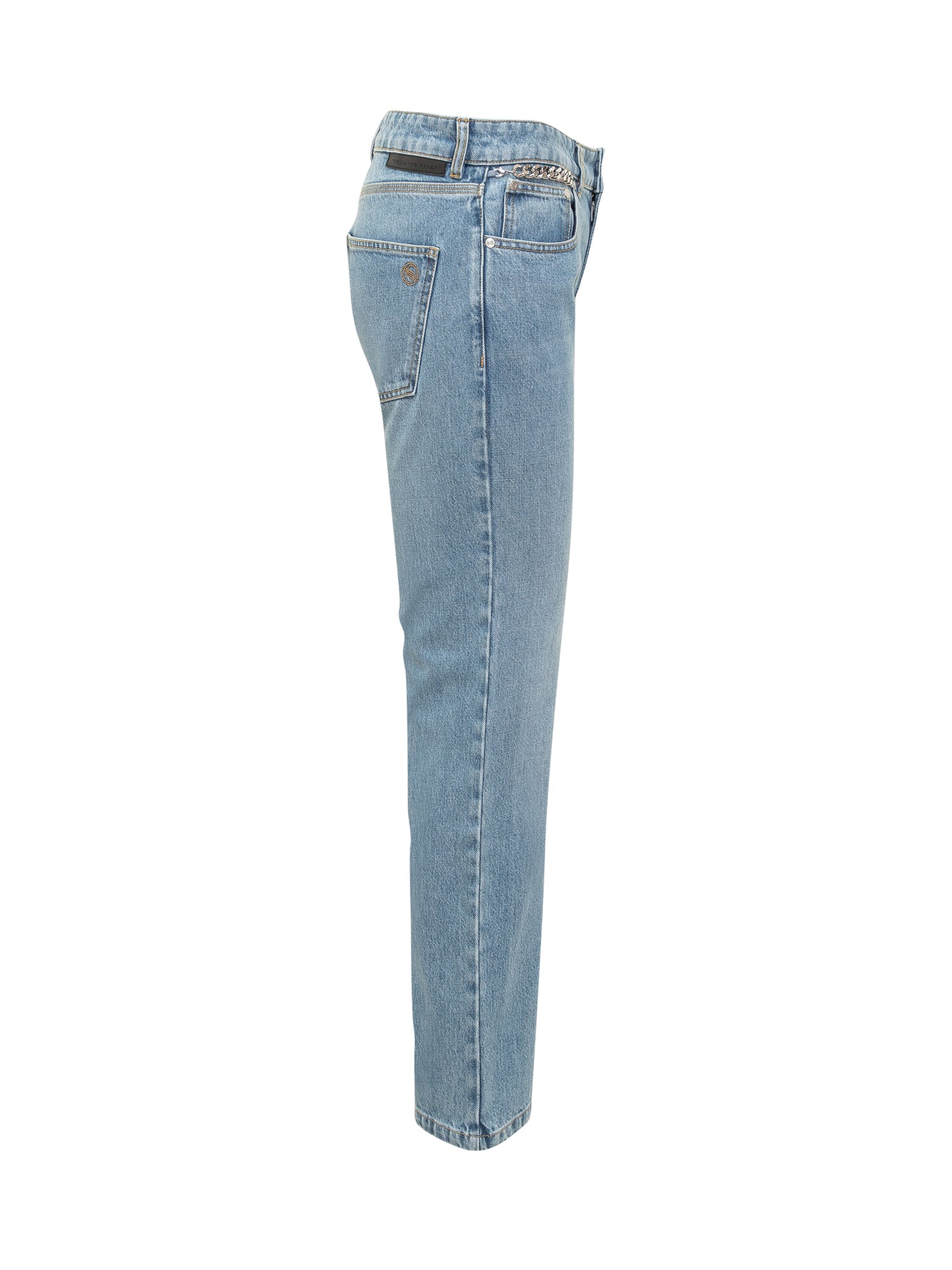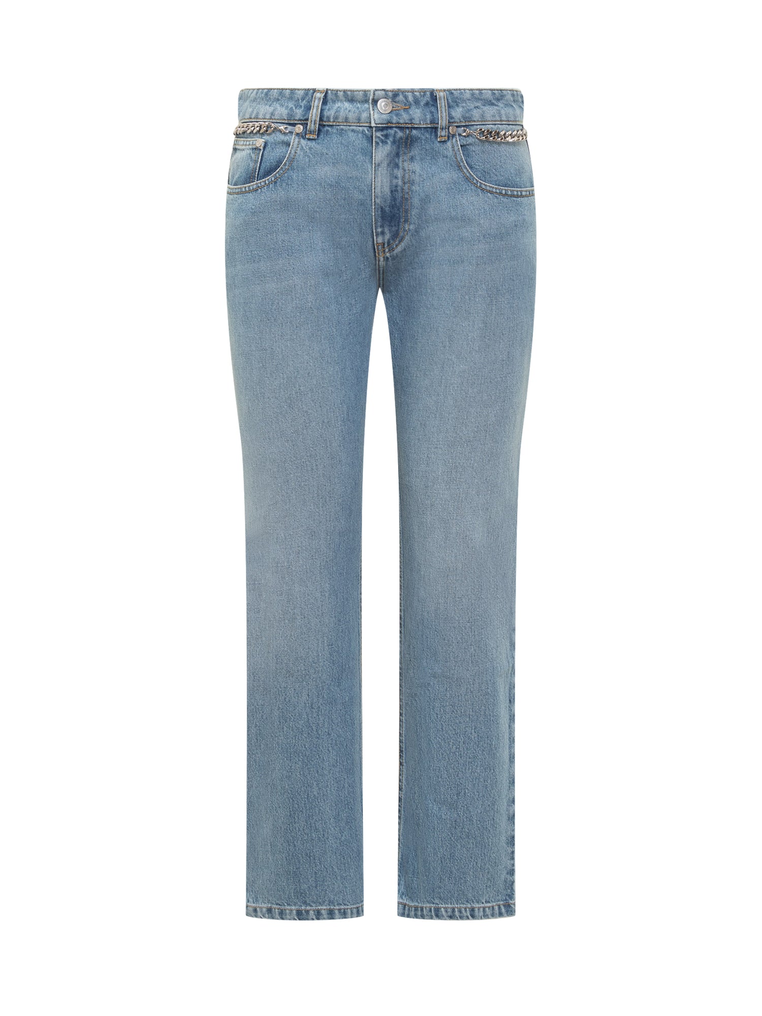 Long slim fit jeans. Zipper and button closure. Belt loops. Five pockets. Chain detail on front.