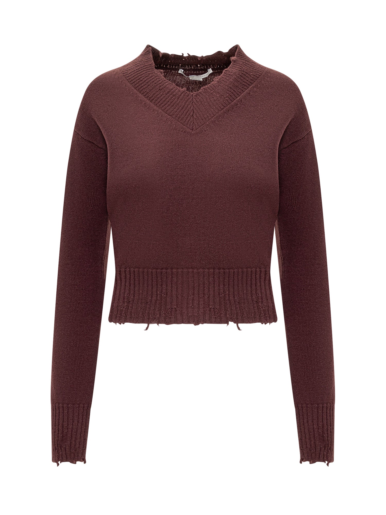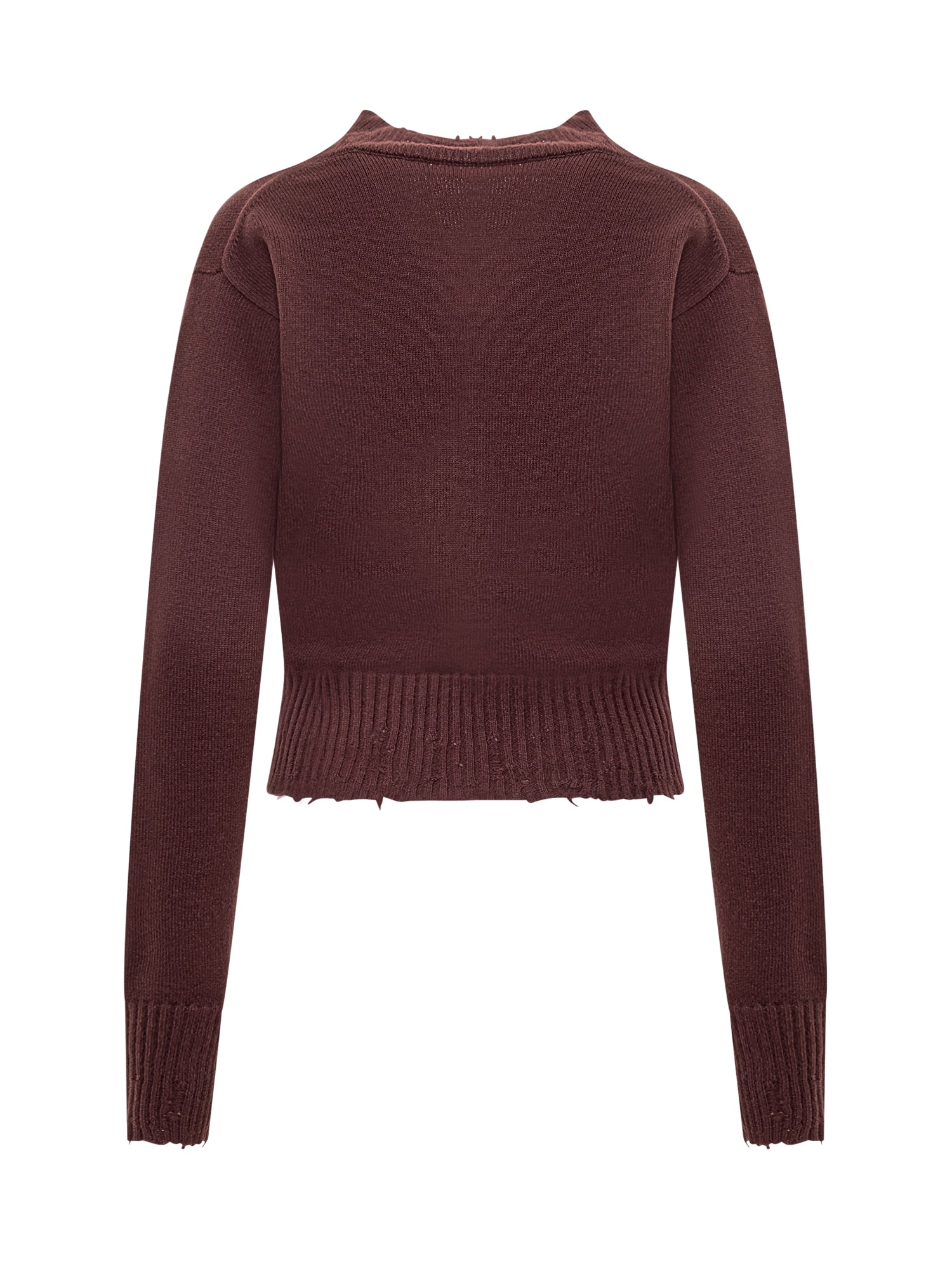 Burgundy wool sweater. Cropped fit. Neck, cuffs and ribbed bottom with a worn-out effect.