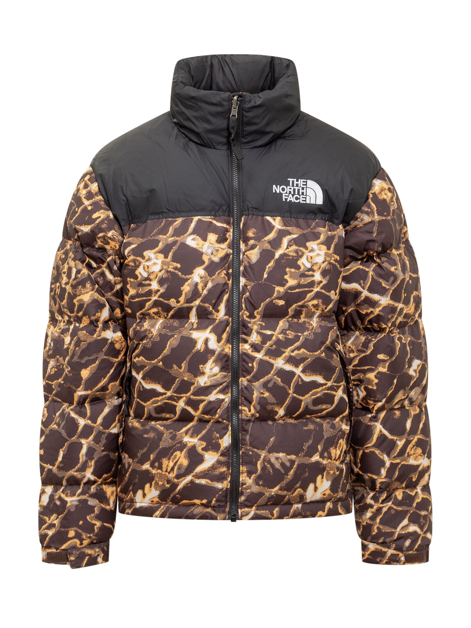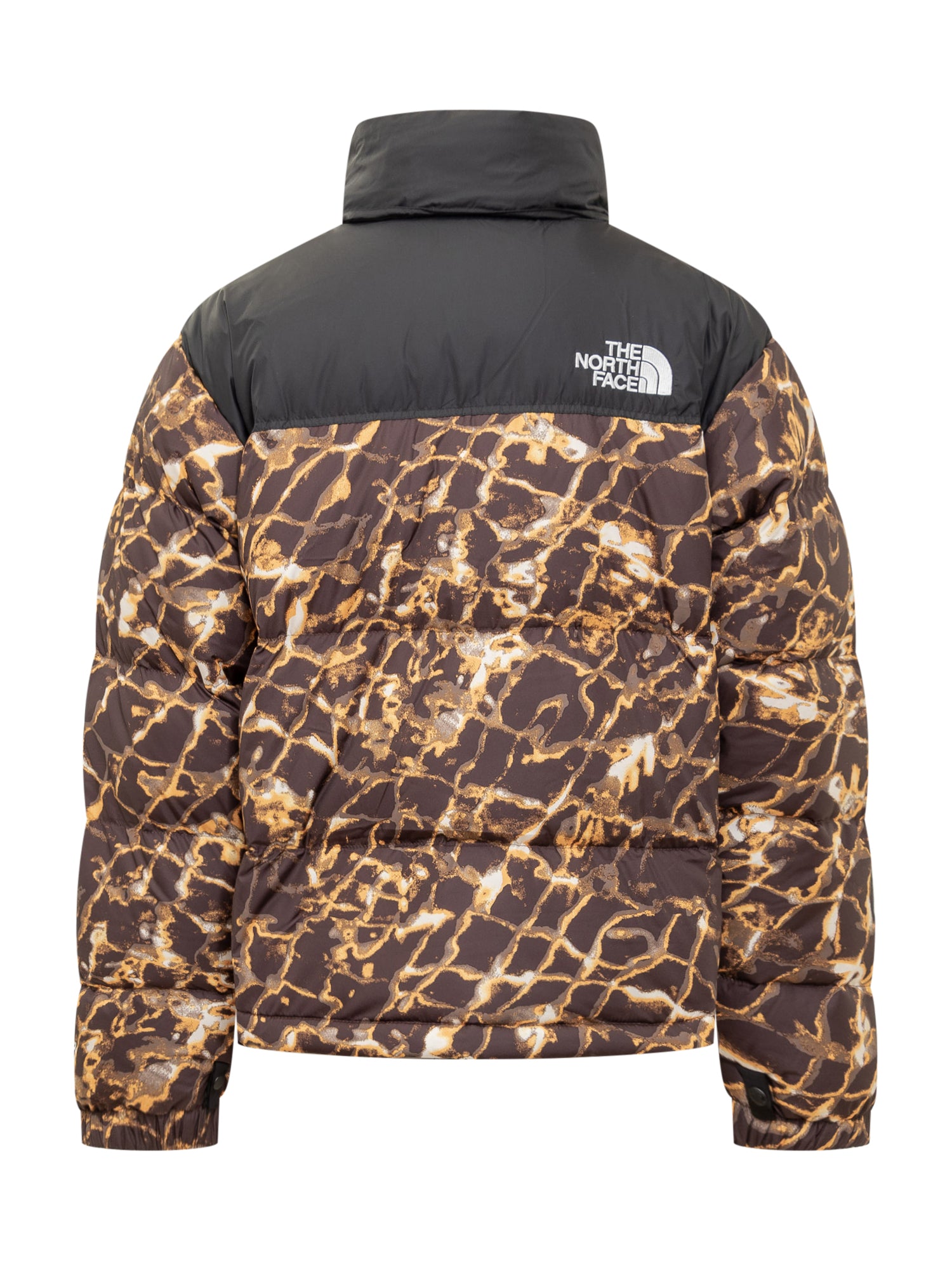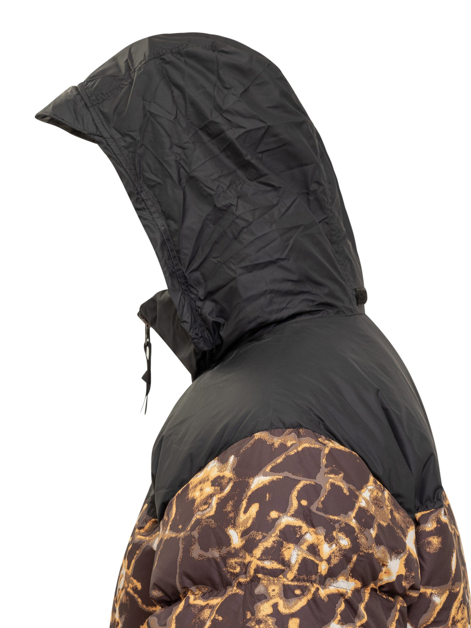 Brown down jacket with long sleeves. High collar. Zipper front closure. Side pockets with zippers. Hood in collar. Embroidered logo on chest and back. Strap at wrists. Inside pocket.
