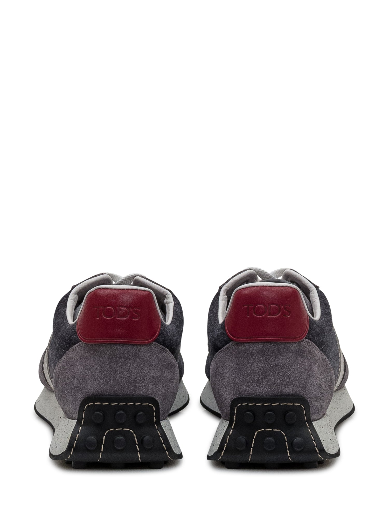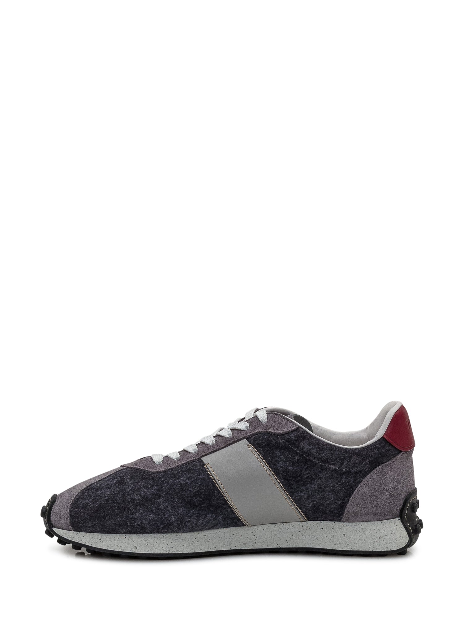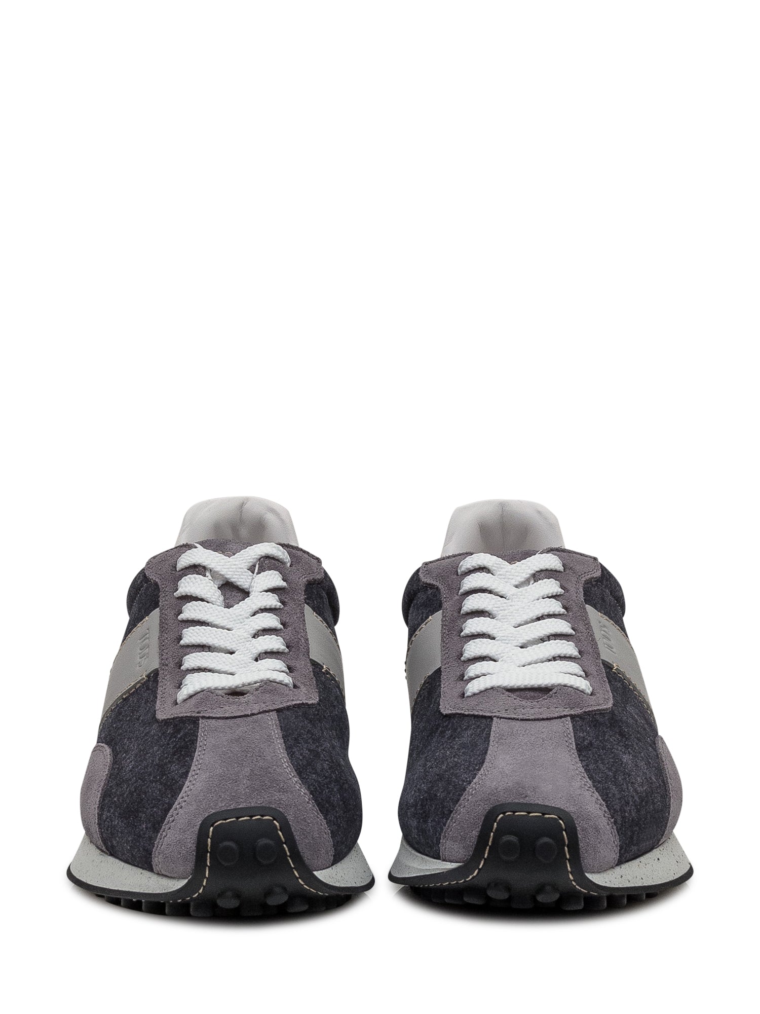 in grey suede and fabric with smooth leather details and bordeaux heel tab. Speckled-effect sole and retro running design