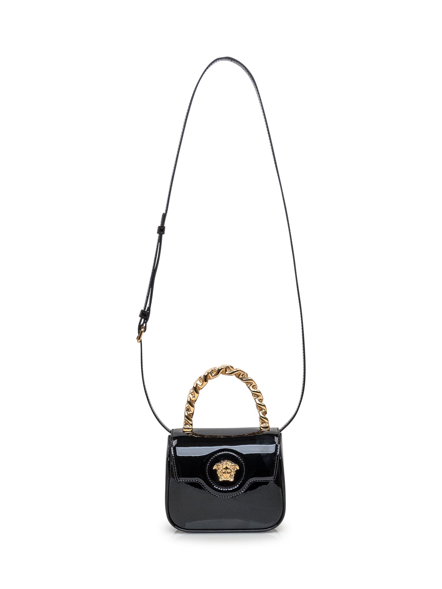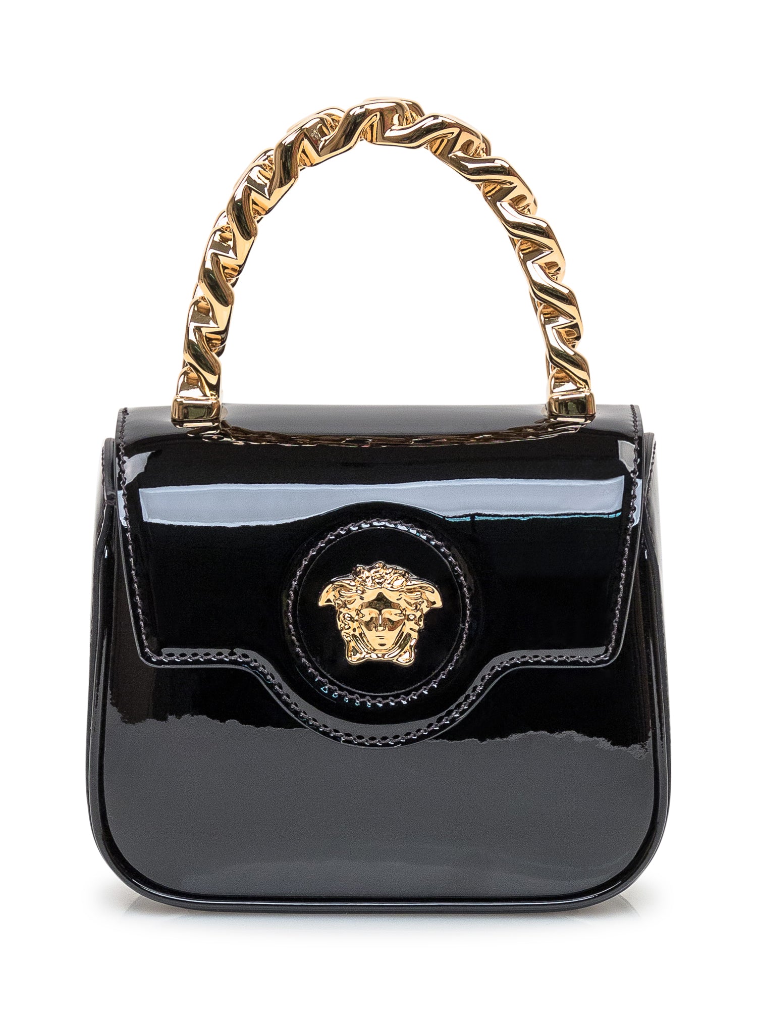 Black mini leather handbag. A rigid chain handle. Adjustable and removable shoulder strap. Internal compartments for credit cards. Flap closure with magnetic button. The Medusa logo in golden metal on the front.