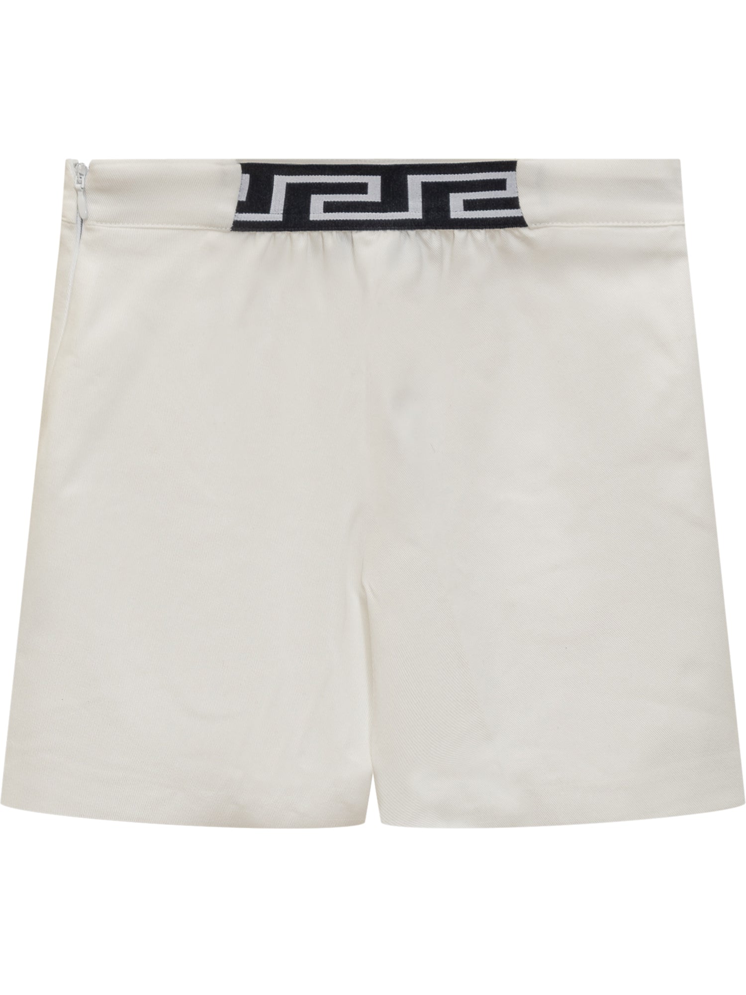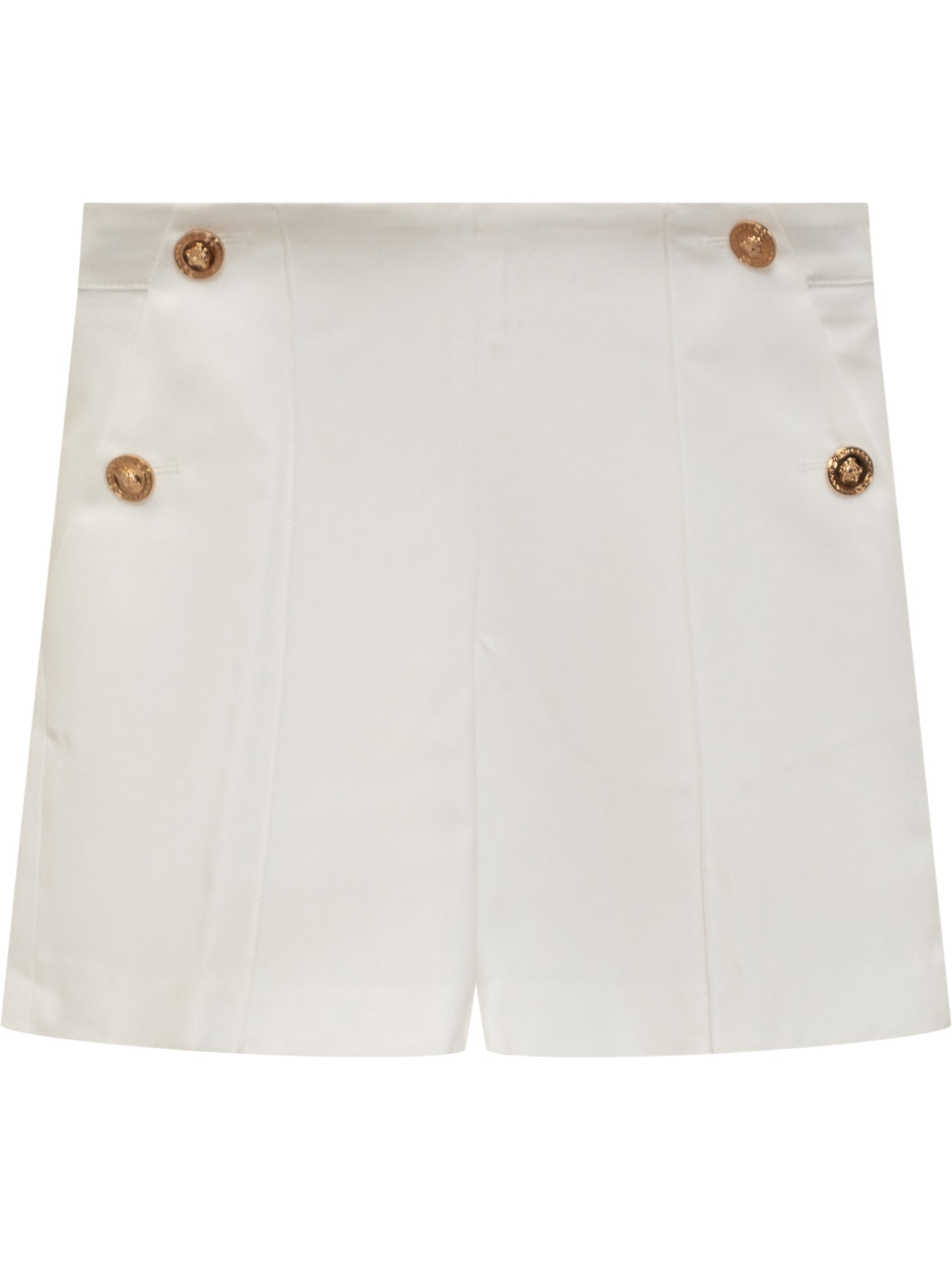 White shorts. Two front pockets. Zipper closure on the side. Medusa buttons on front. Greca elastic insert at back.