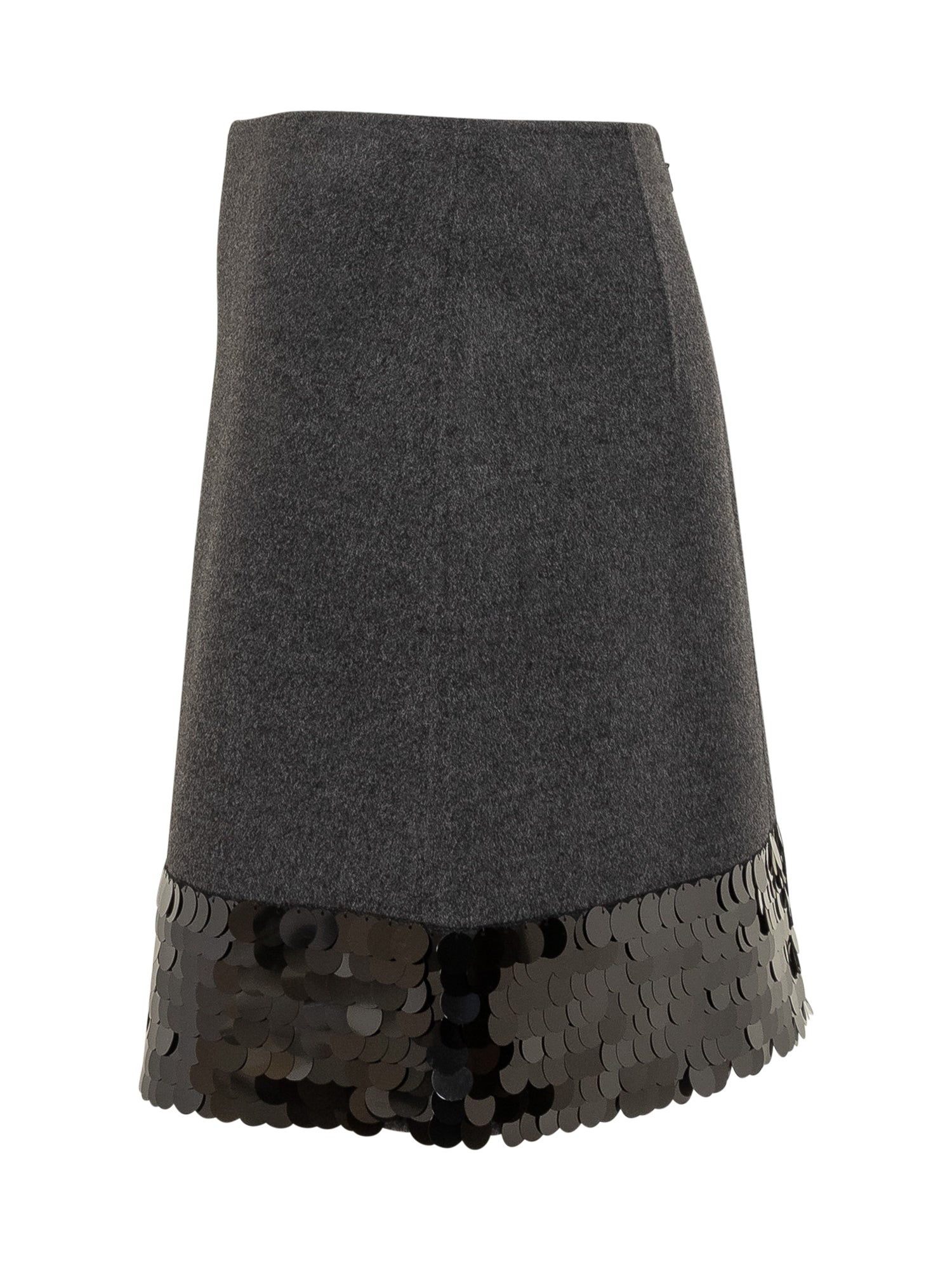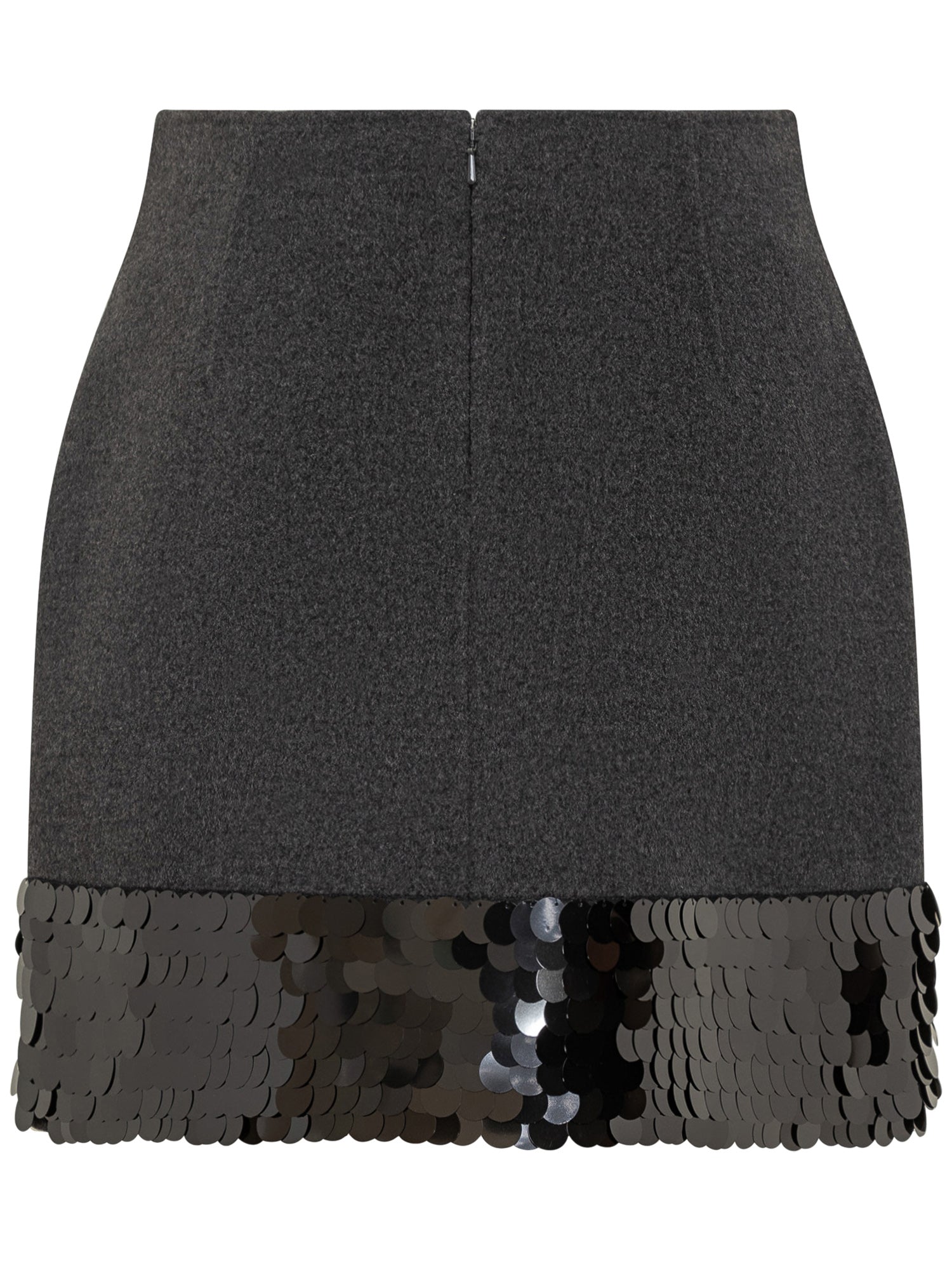Weekend Max Mara grey wool mini skirt featuring black sequin trim. High-waisted, fitted silhouette.