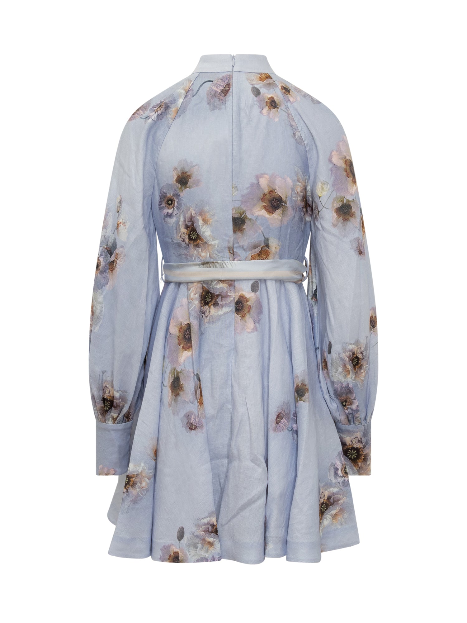 Zimmermann short dress in blue linen with floral print. Covered buttons, long sleeves and waist belt that enhances the silhouette.