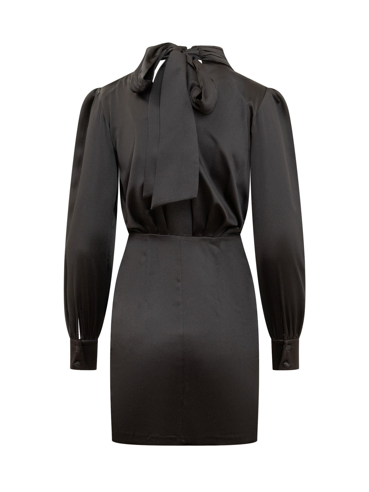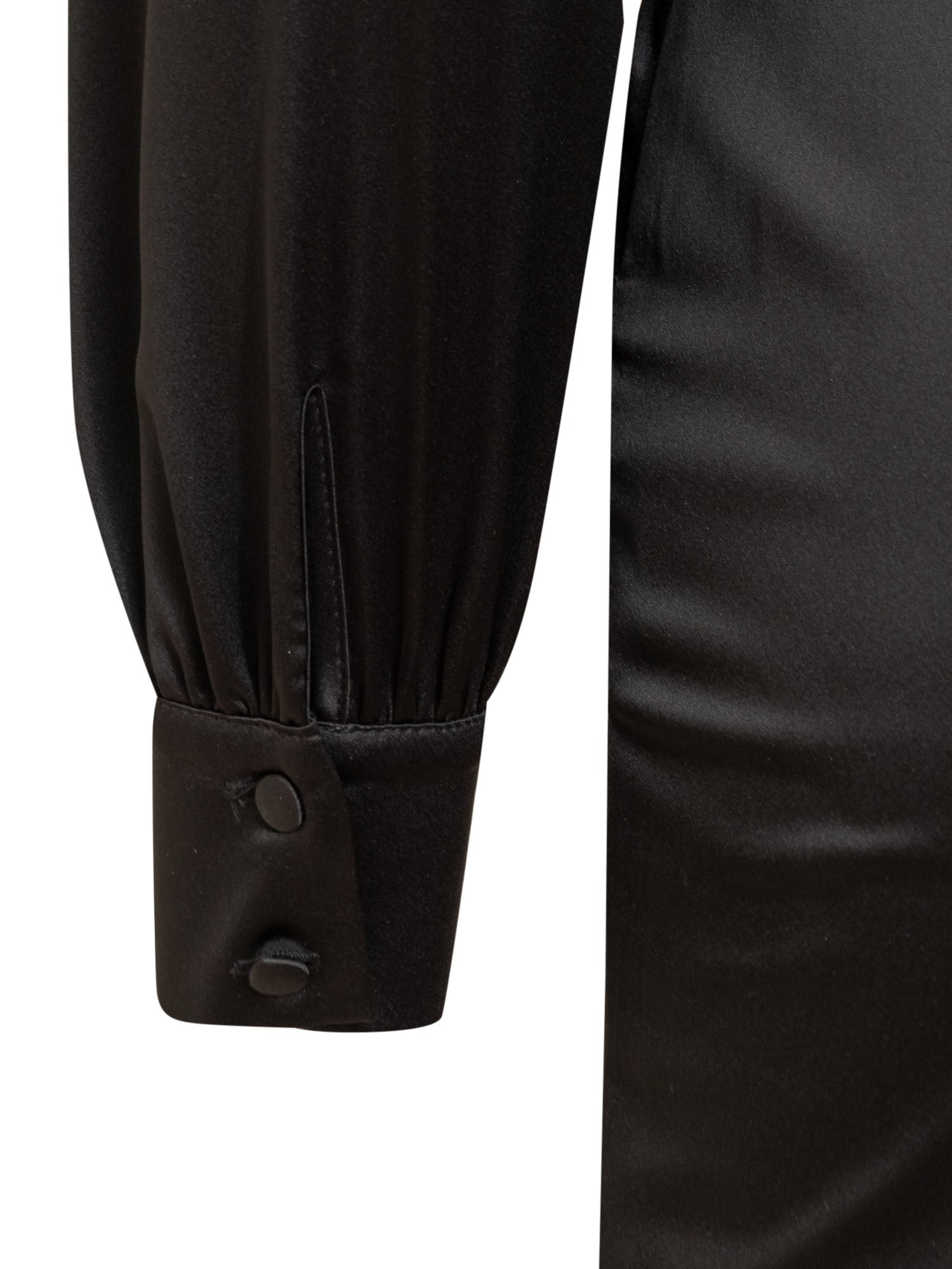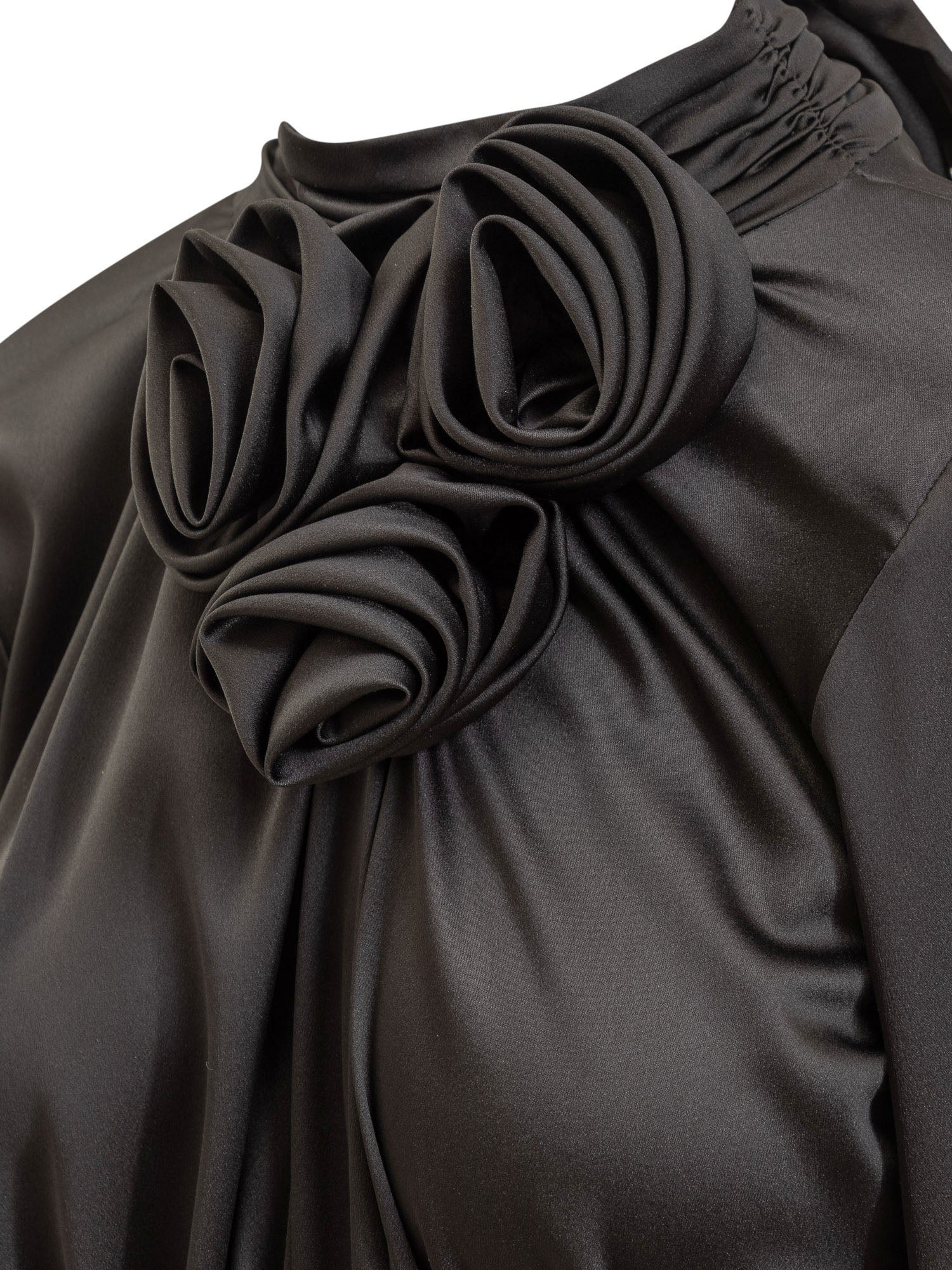 Black dress with long sleeves. High neck. Back closure with bow. Rose detail on the neck. Buttons at the cuffs.