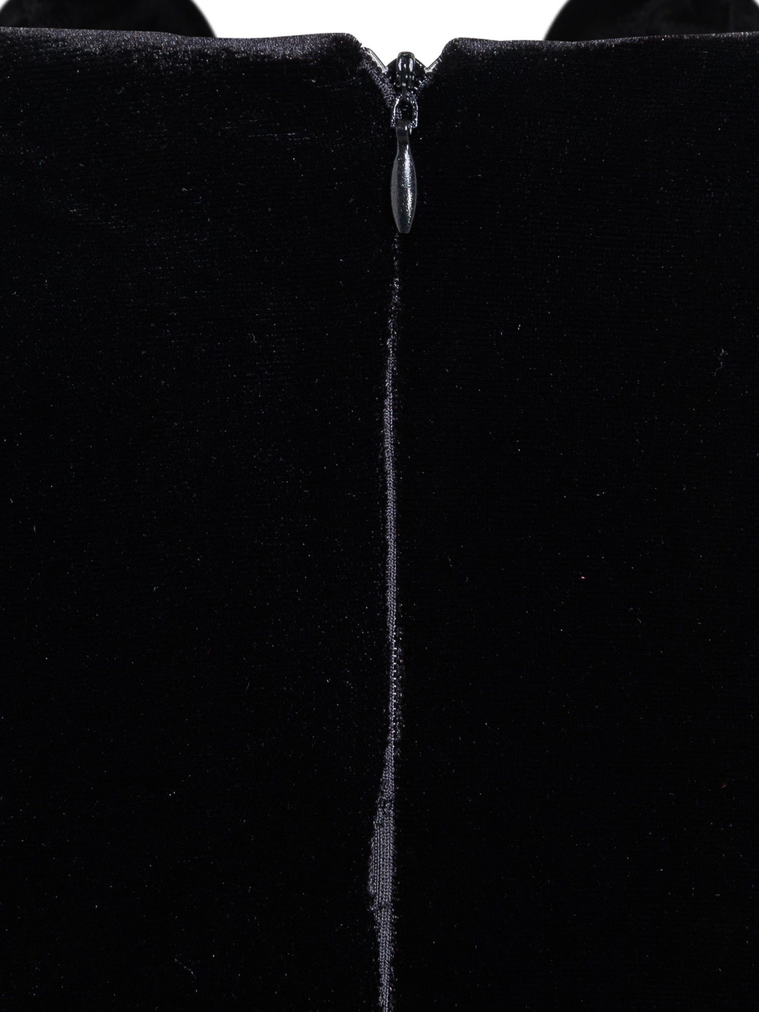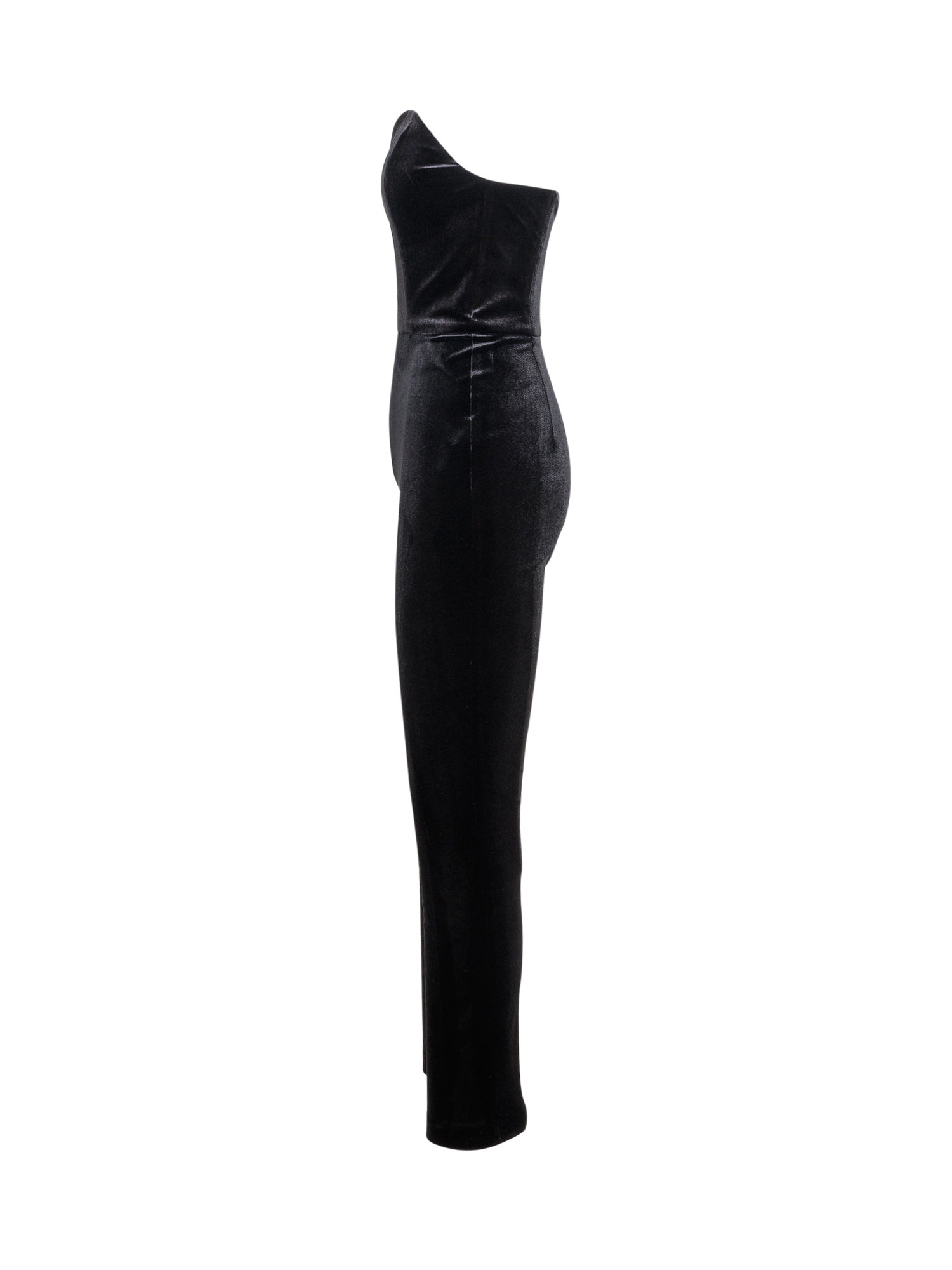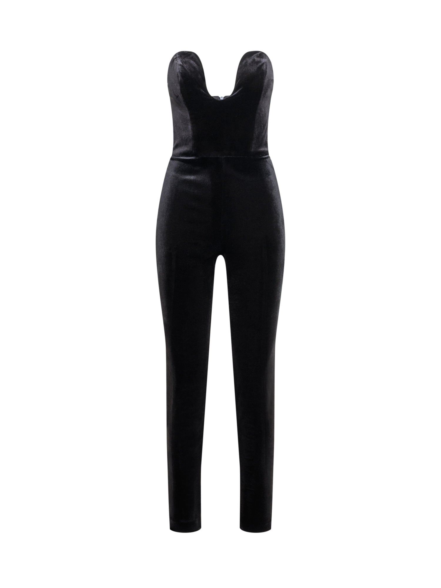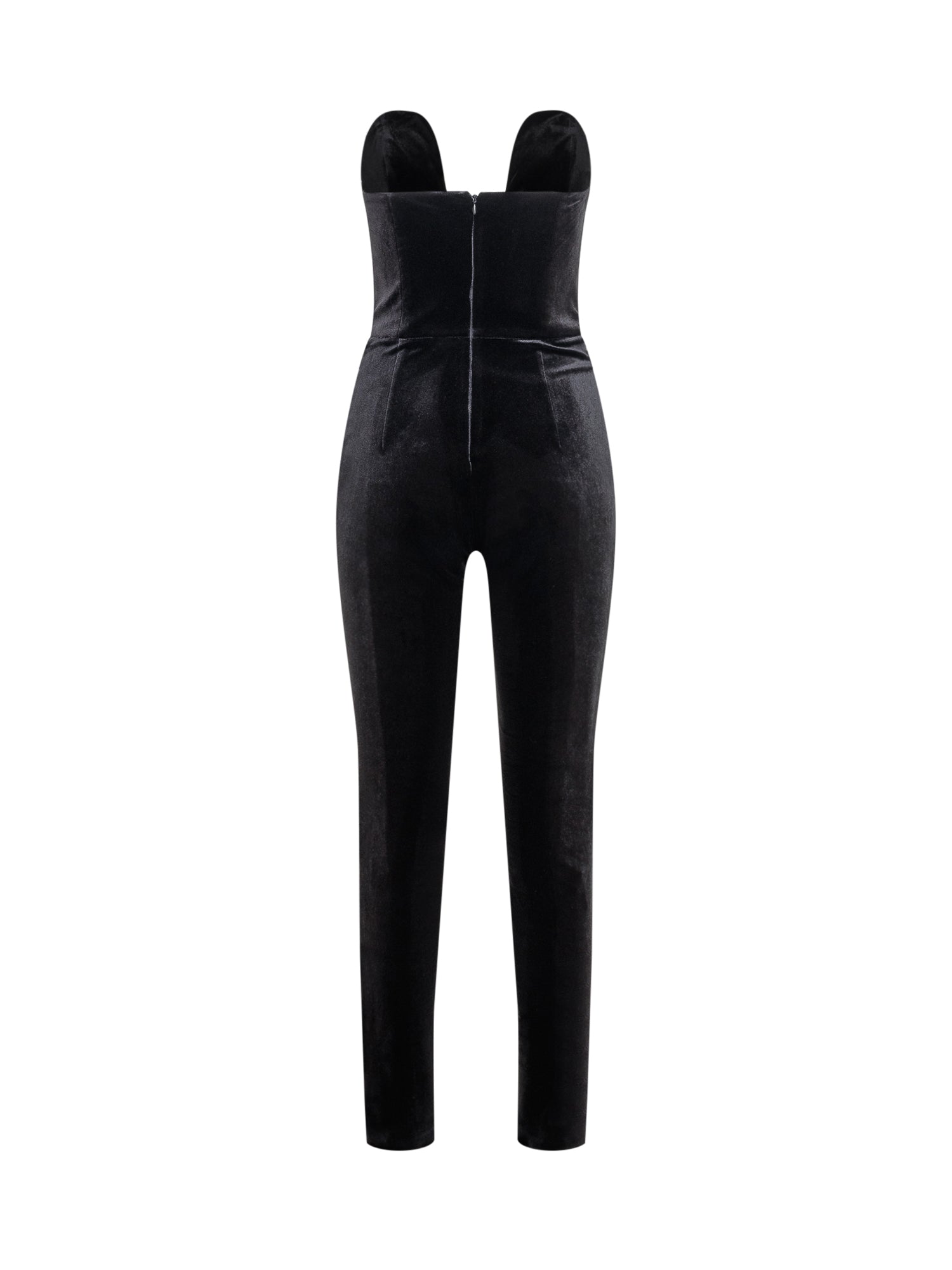Long sleeveless jumpsuit. Neckline on the chest. Back zip closure. Tight leg.
