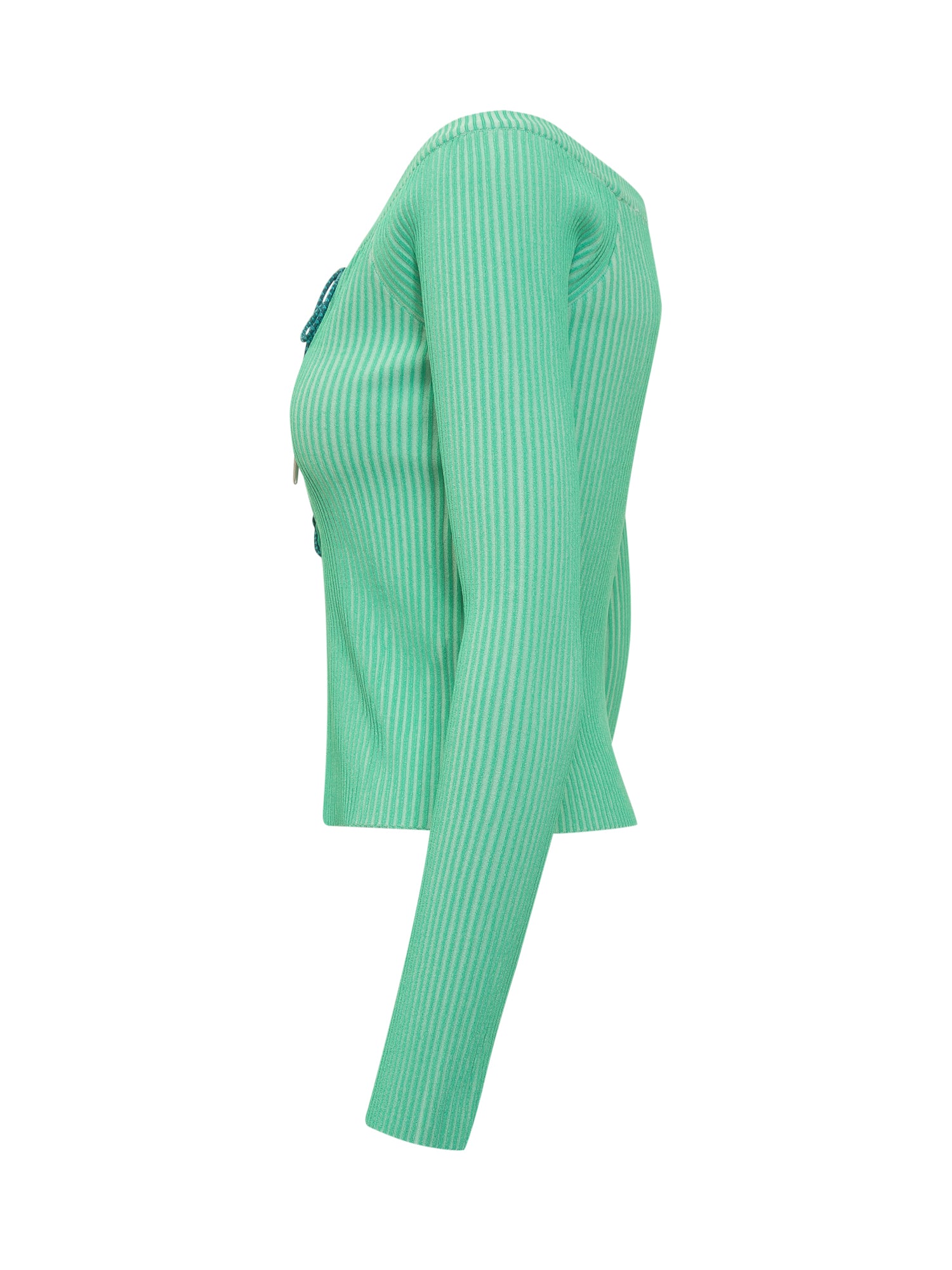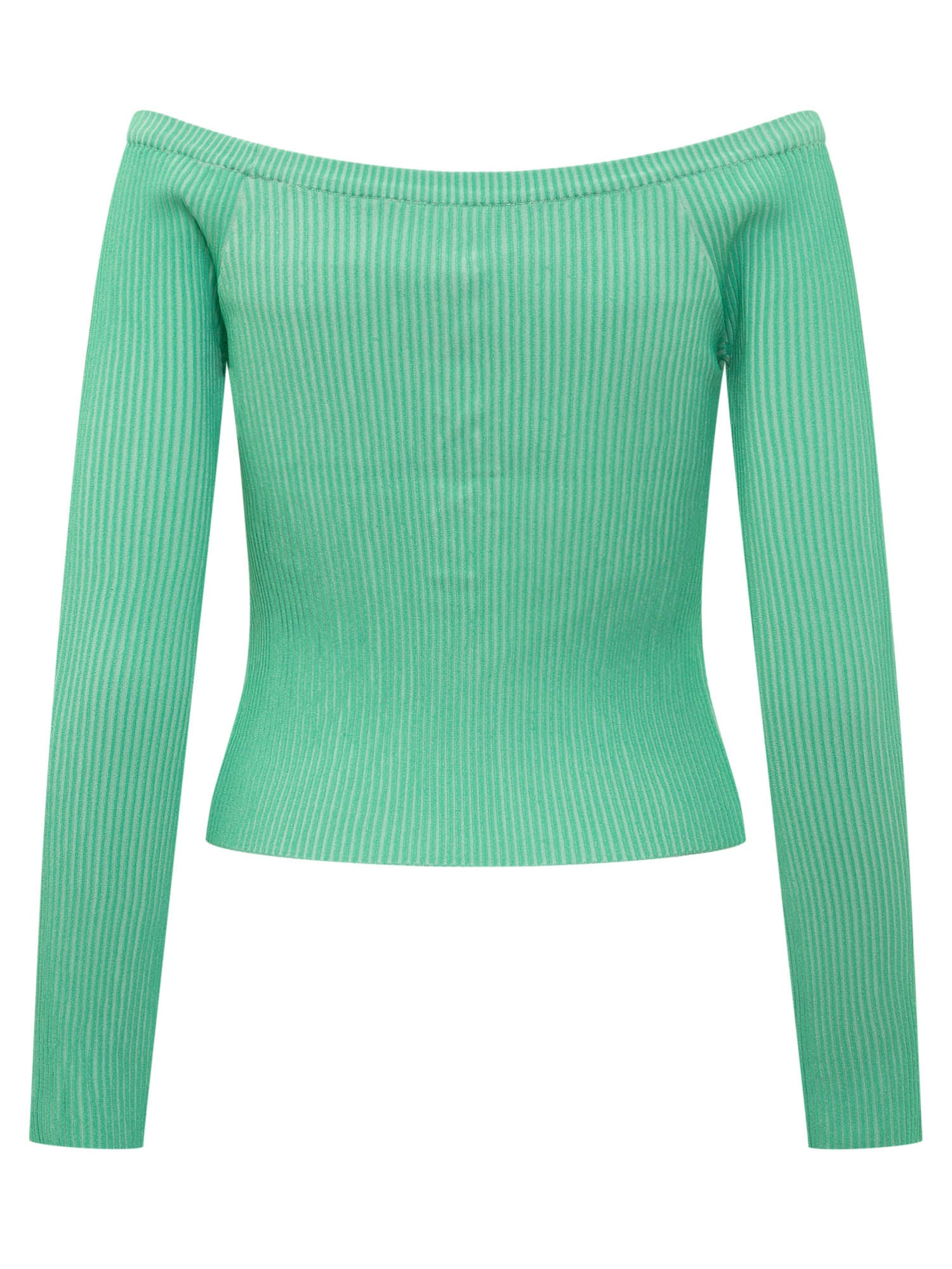 Top with off-shoulder boat neckline. Closure with drawstring. Corset on the front. Opening on the front. All-over striped pattern.