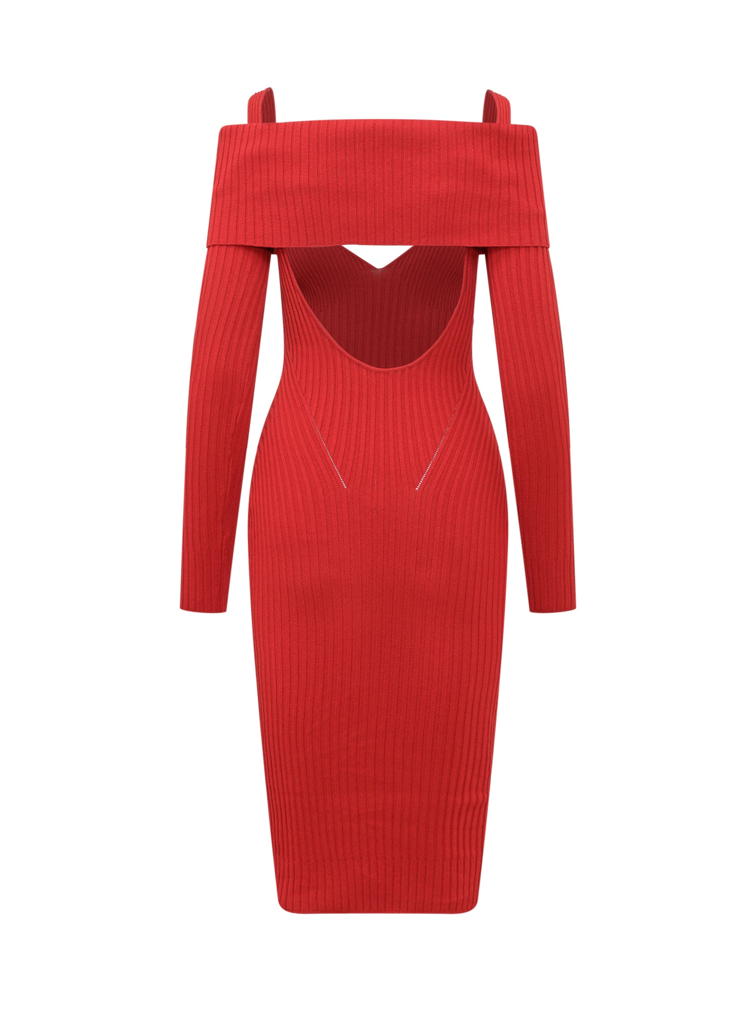 Red midi dress with long sleeves. Back neckline. Open shoulders. Fitted.