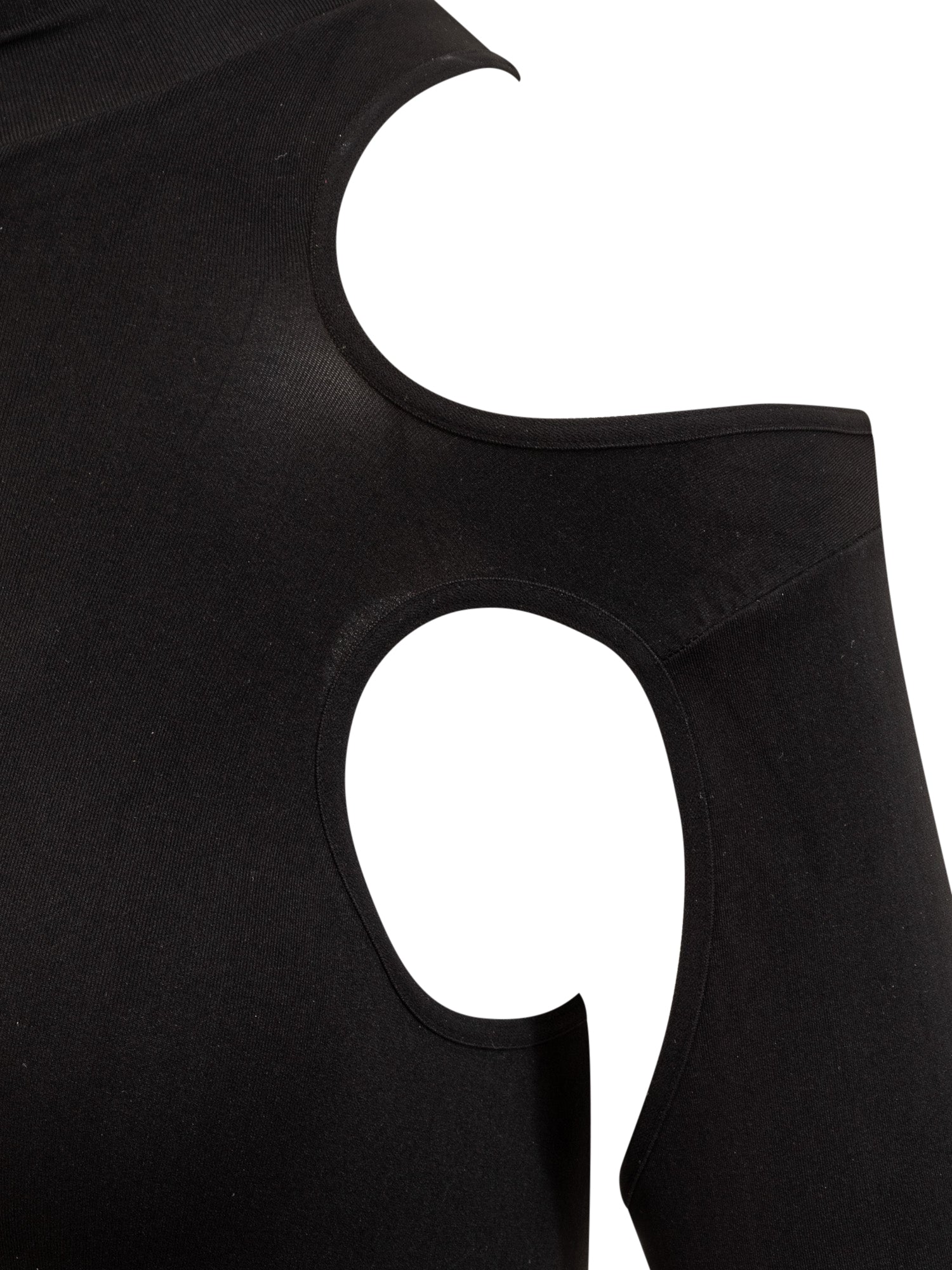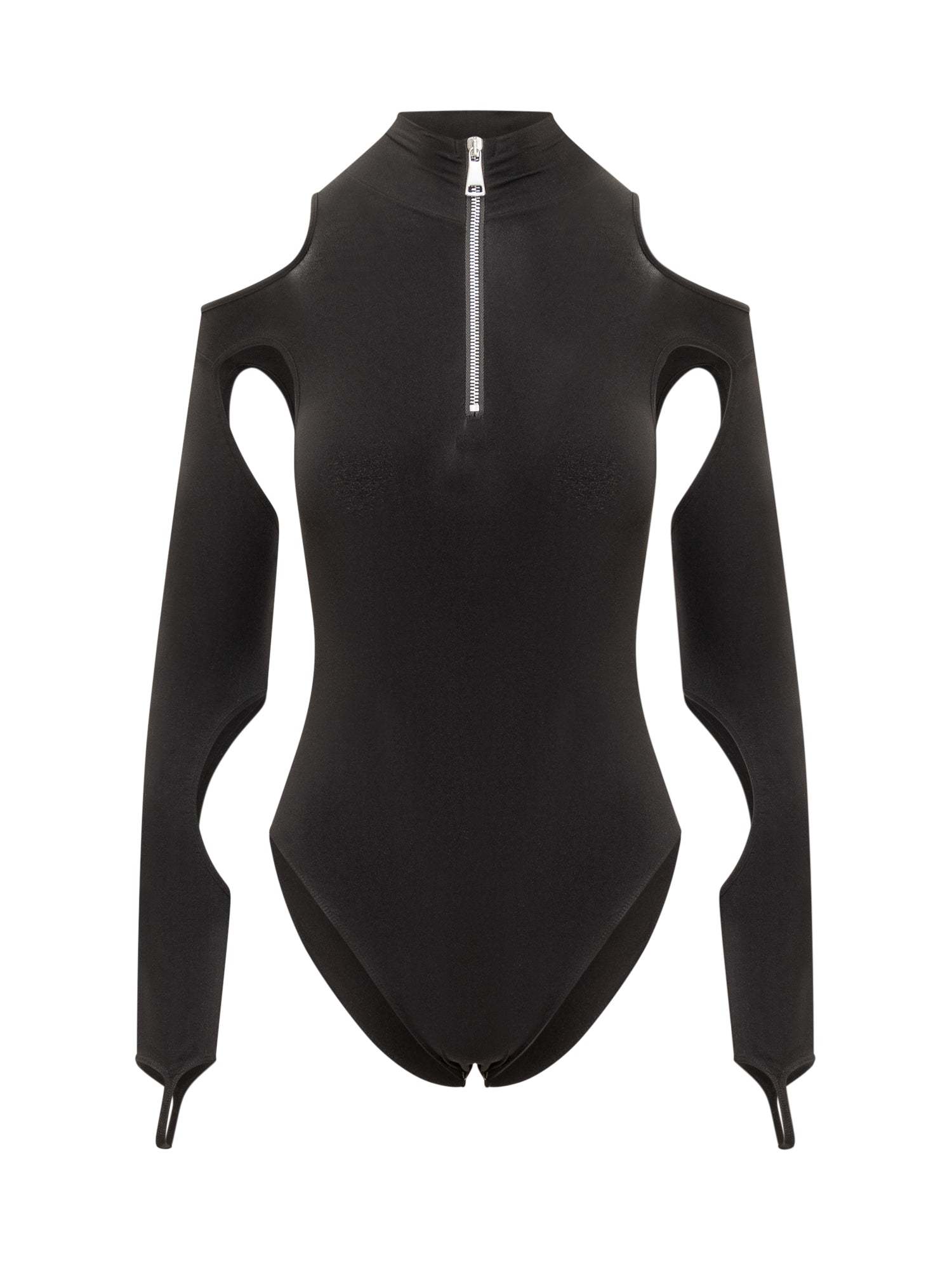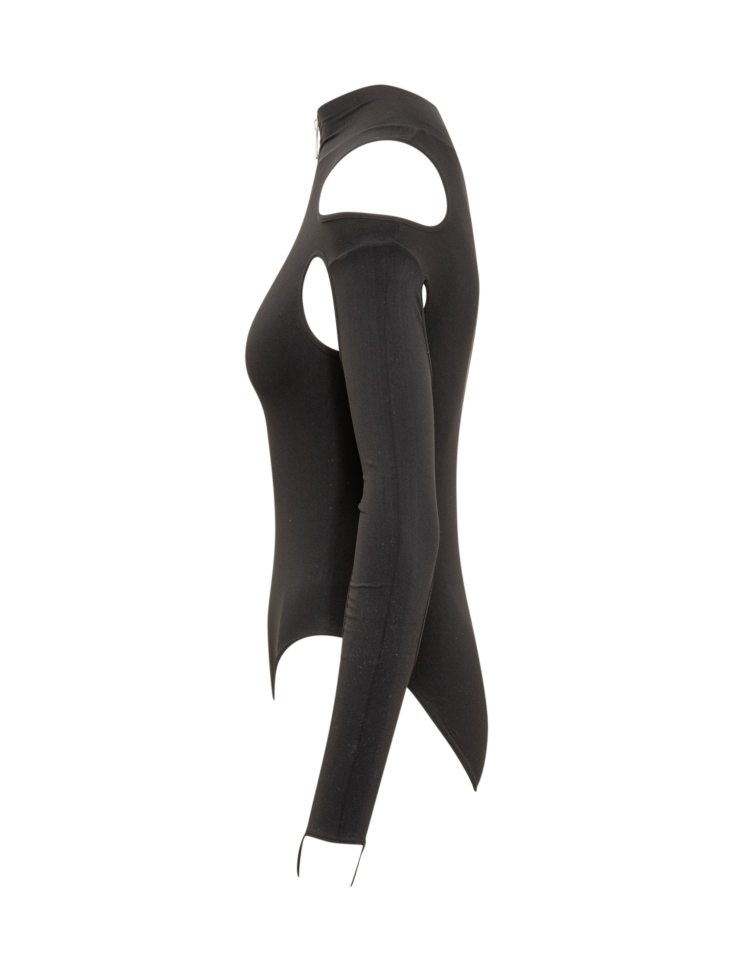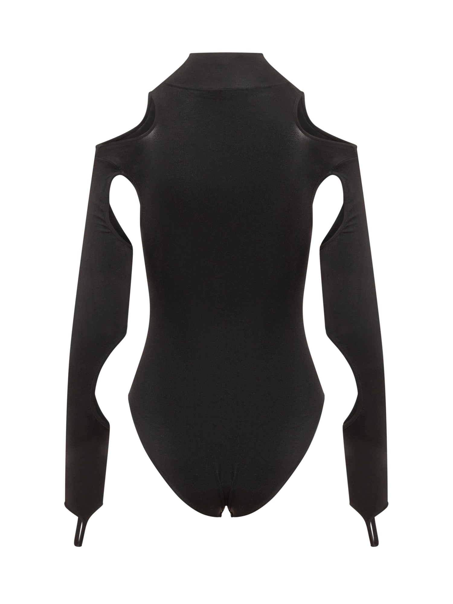 Long-sleeved bodysuit. High collar. Zipper closure. elastic cuffs. Cut-out on sleeves and shoulders.