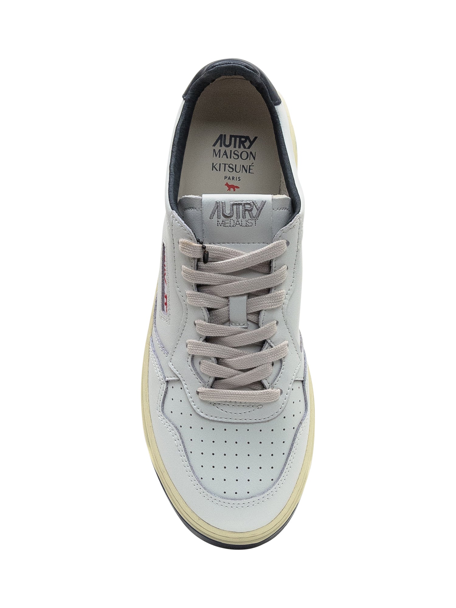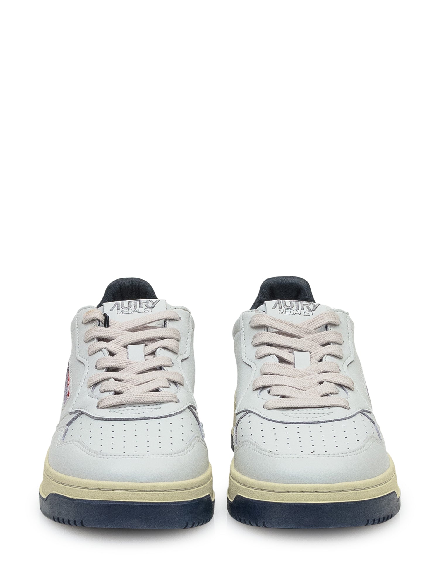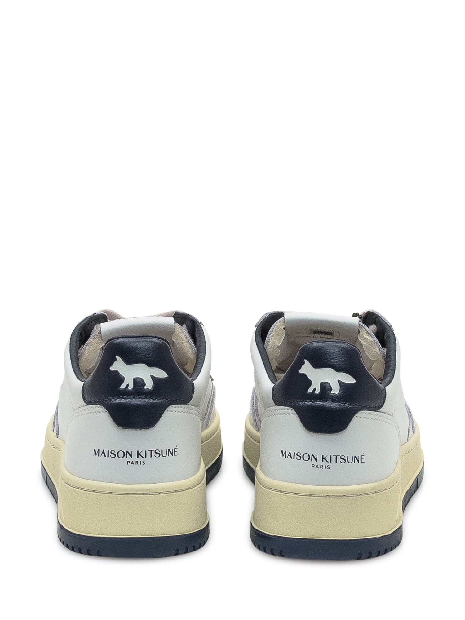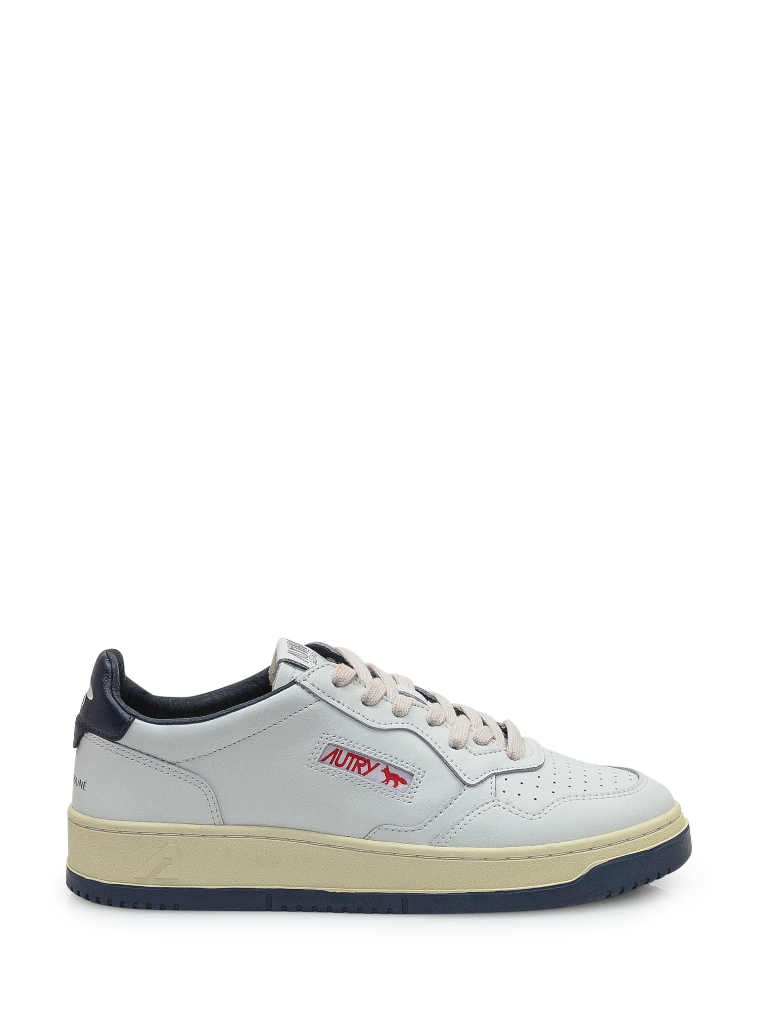 White leather sneakers with navy details and red fox logo embroidery.