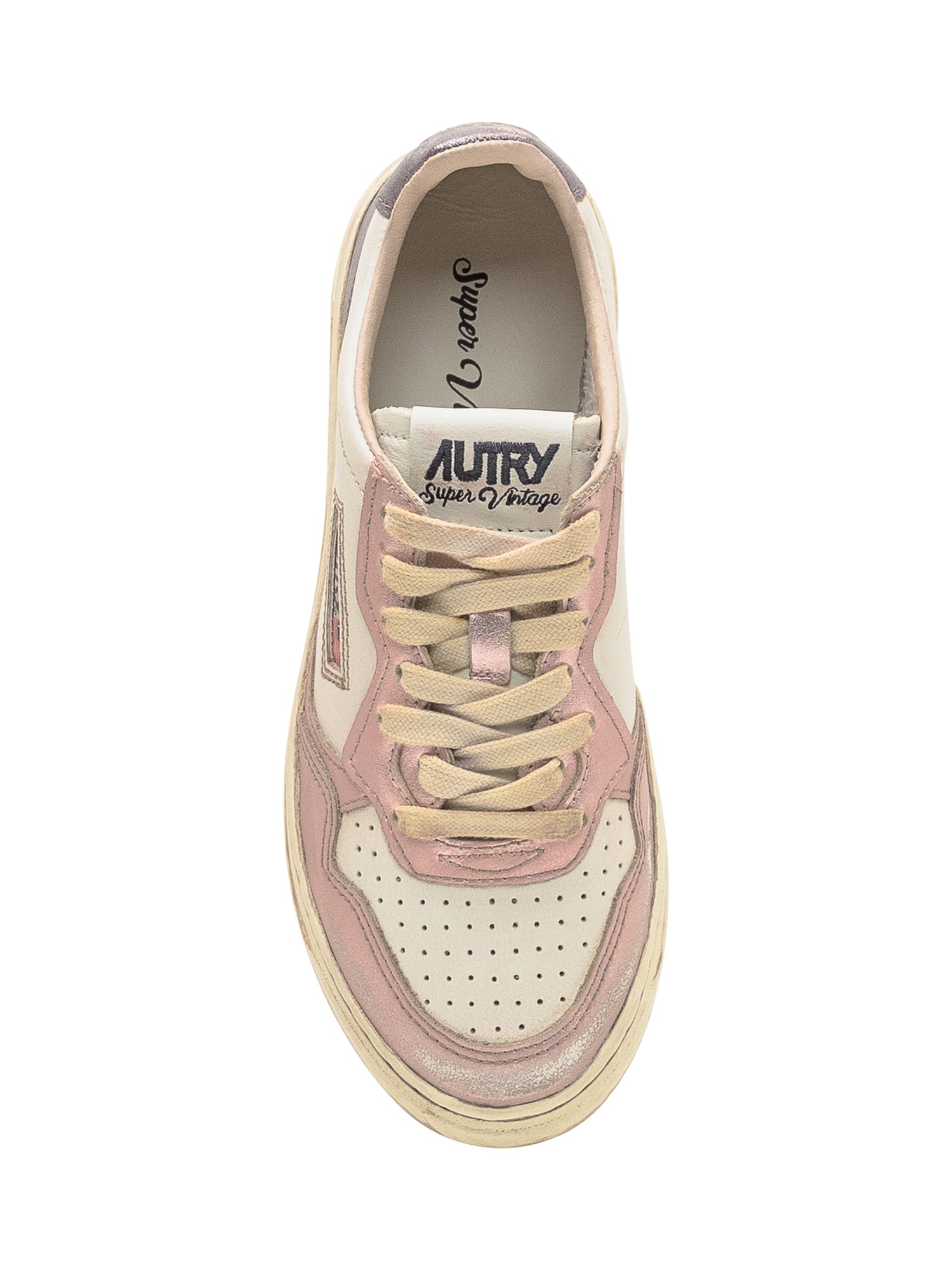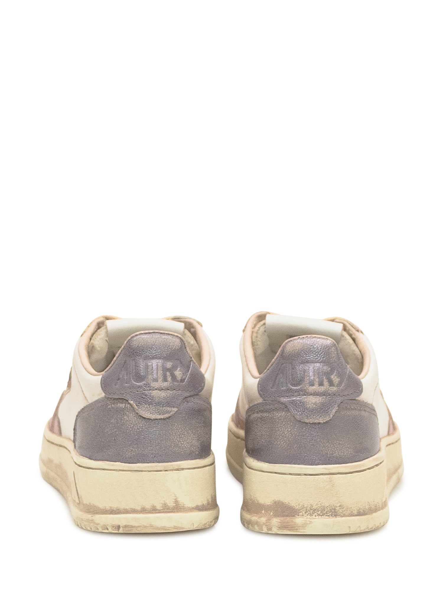 Autry Medalist sneakers with vintage effect, pearl pink accents and lilac heel. Distressed look, leather upper, and USA flag logo.