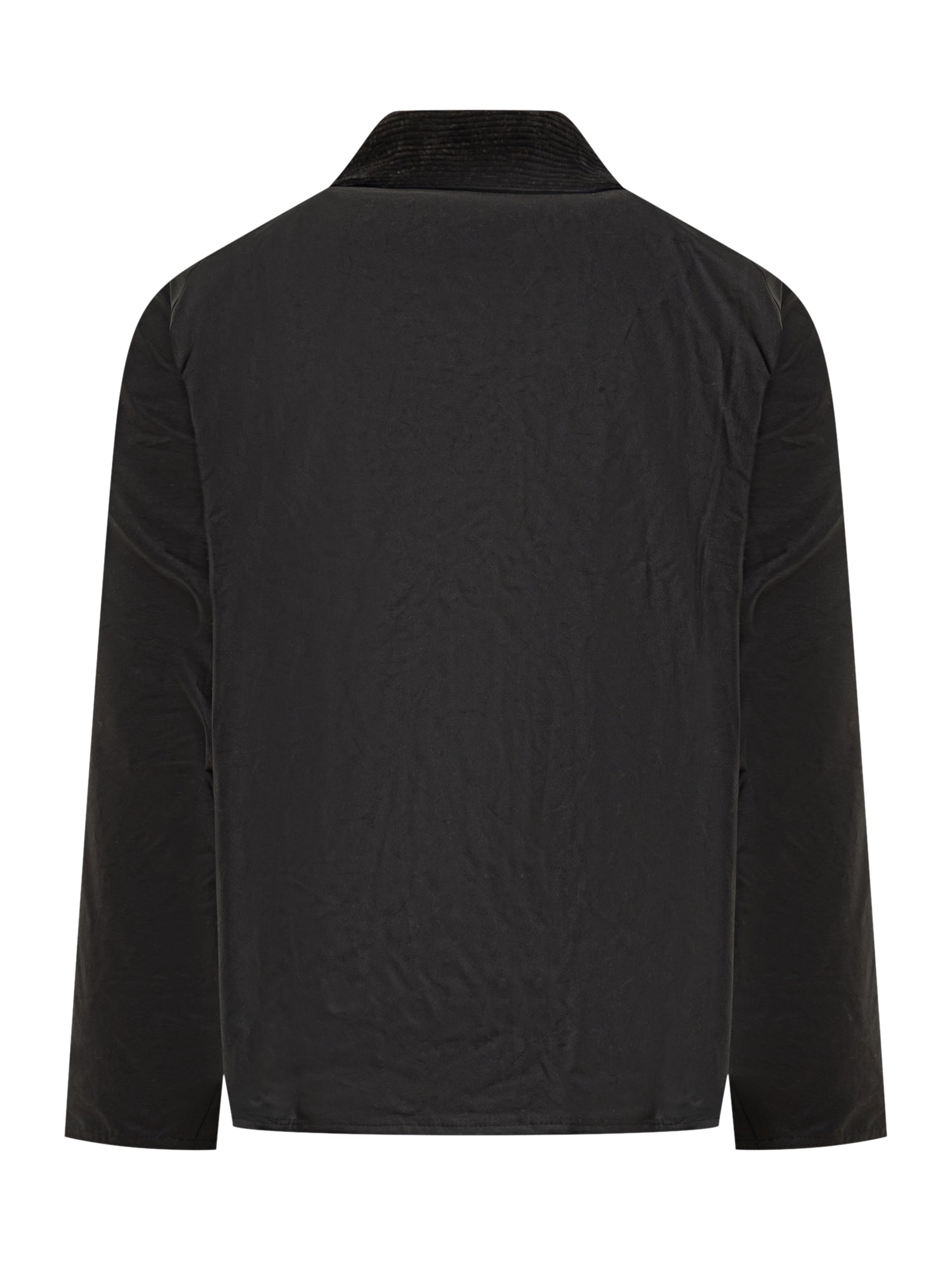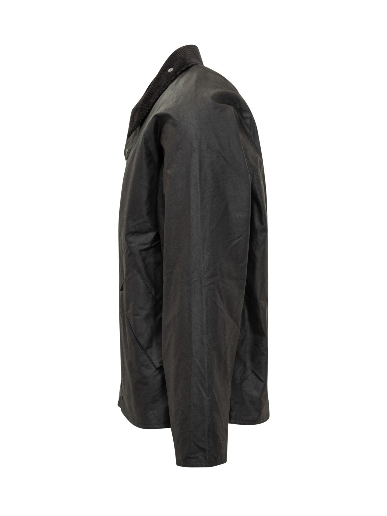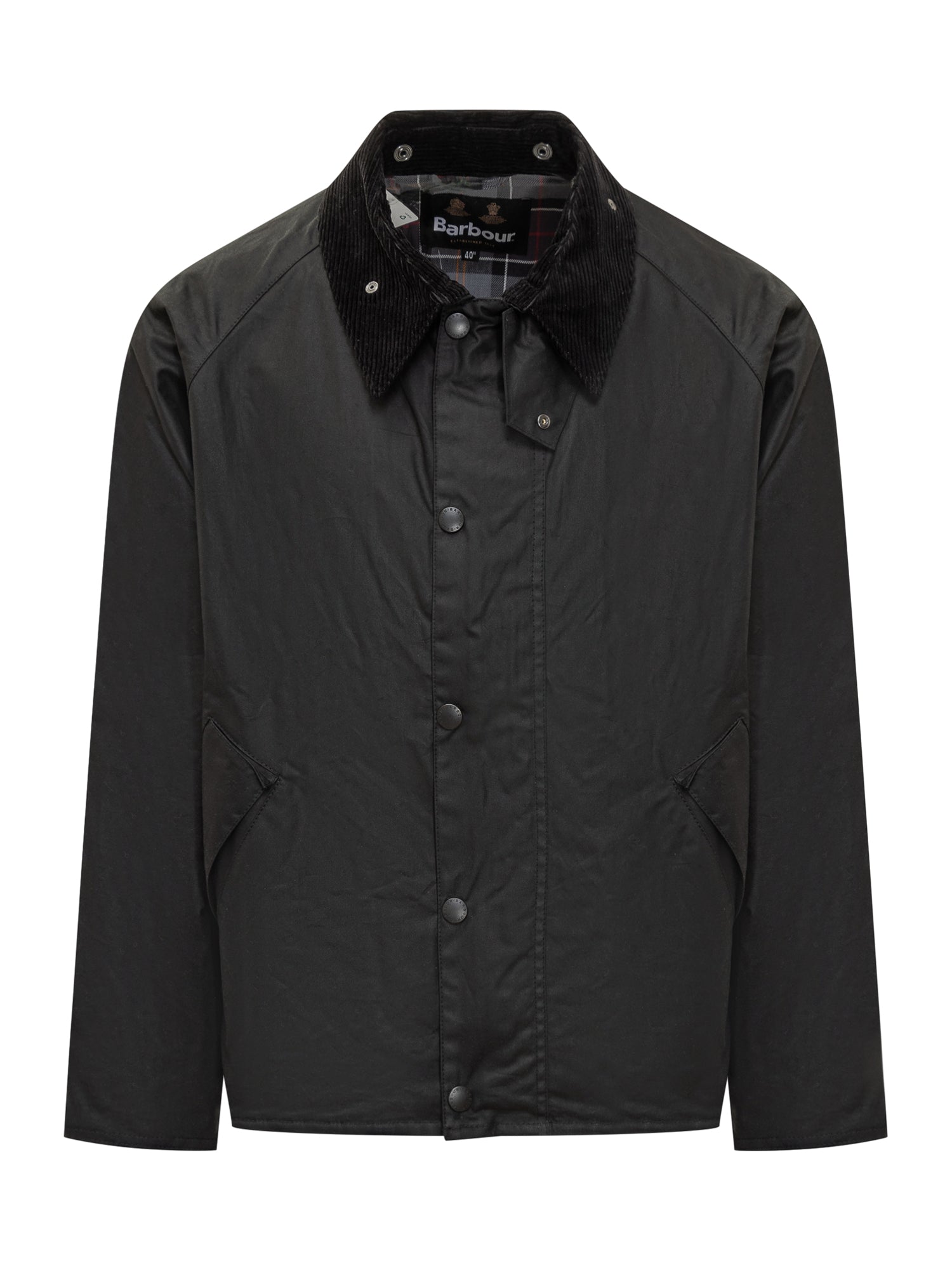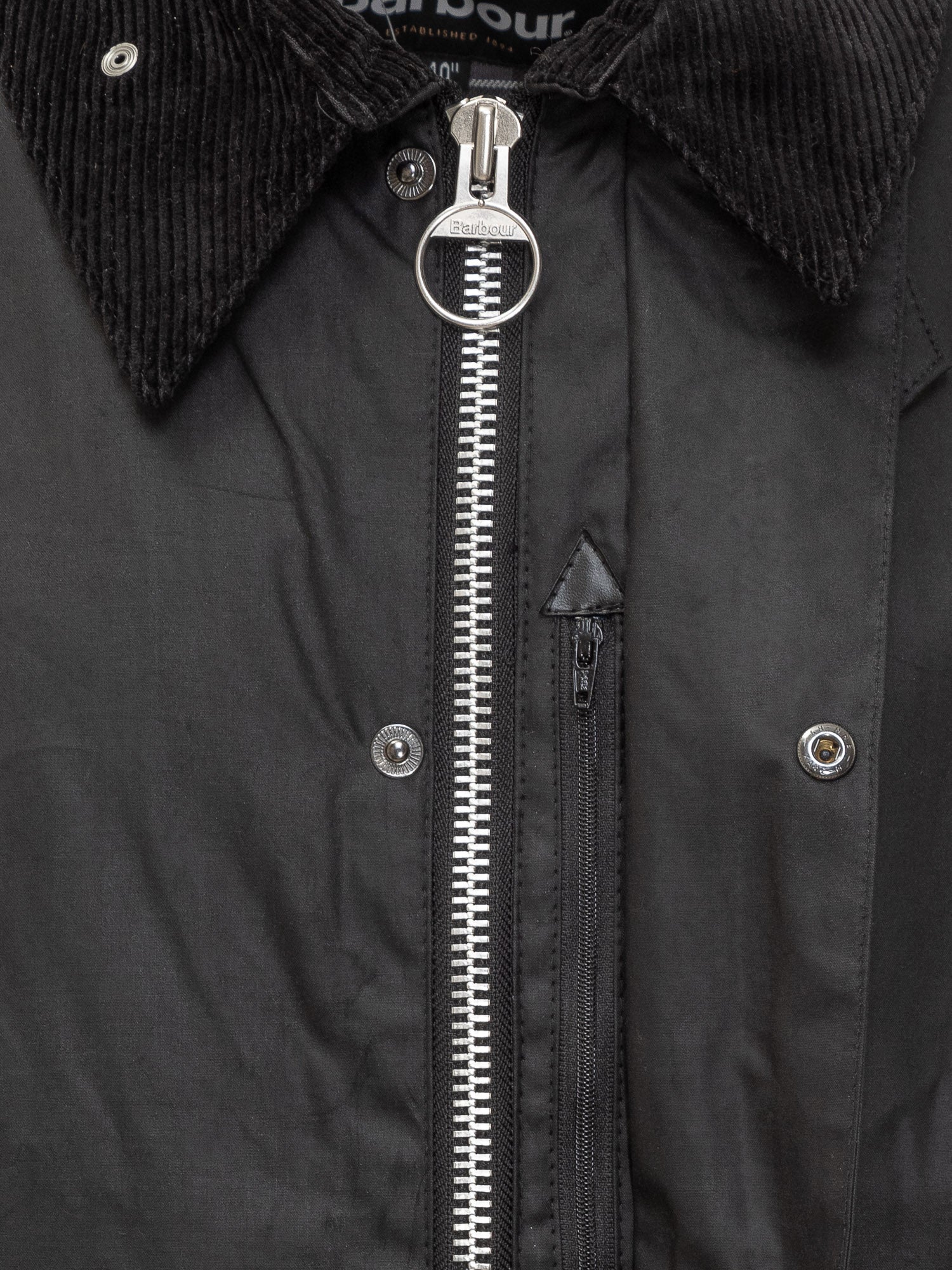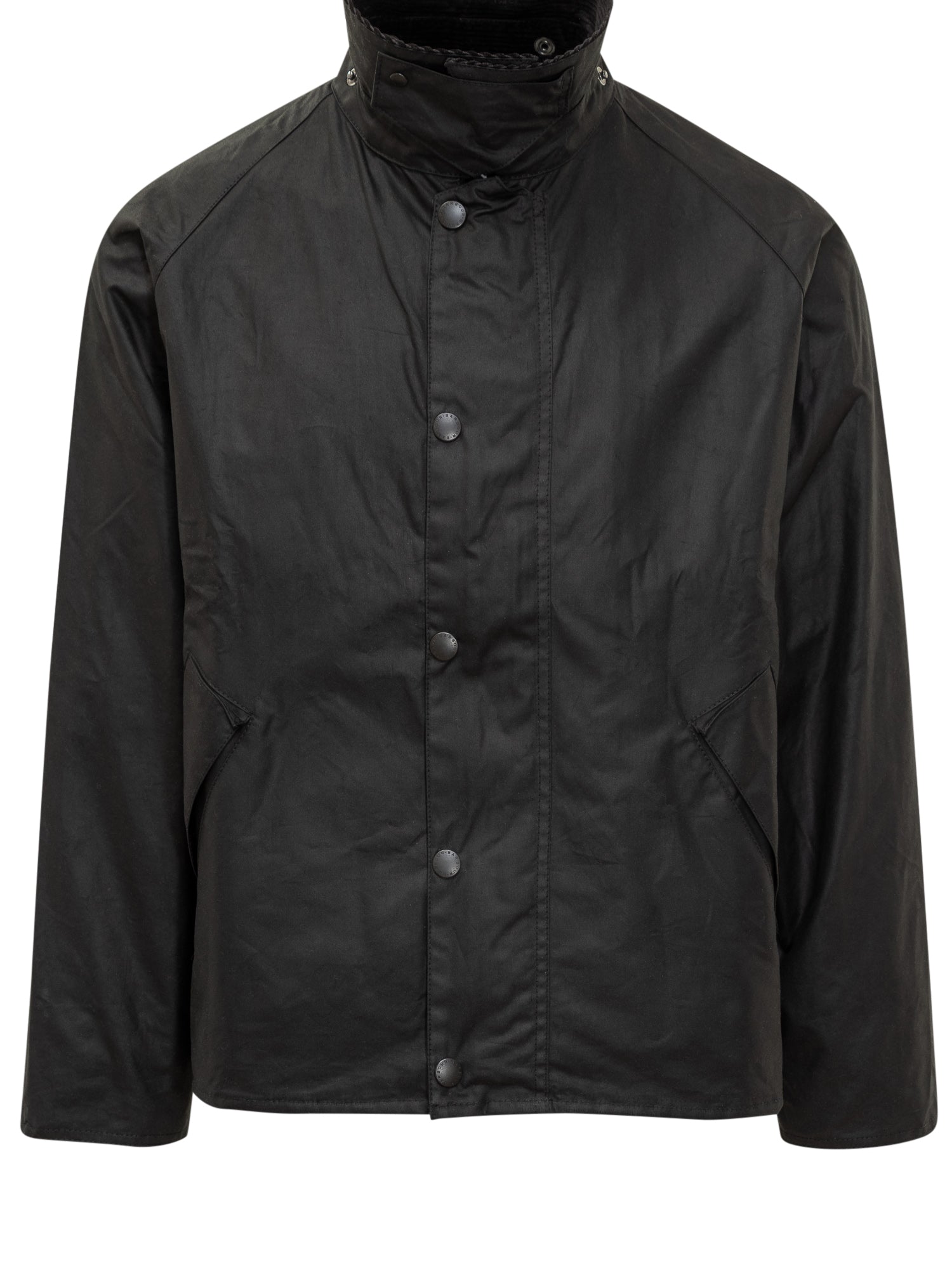Barbour black waxed jacket with corduroy collar and snap button closure.