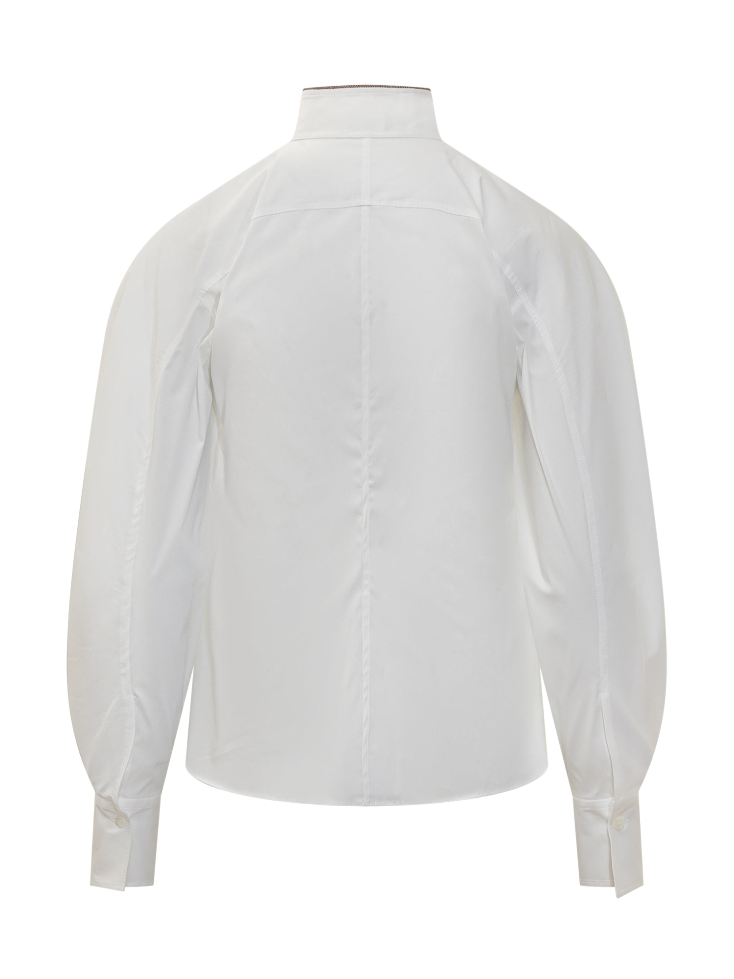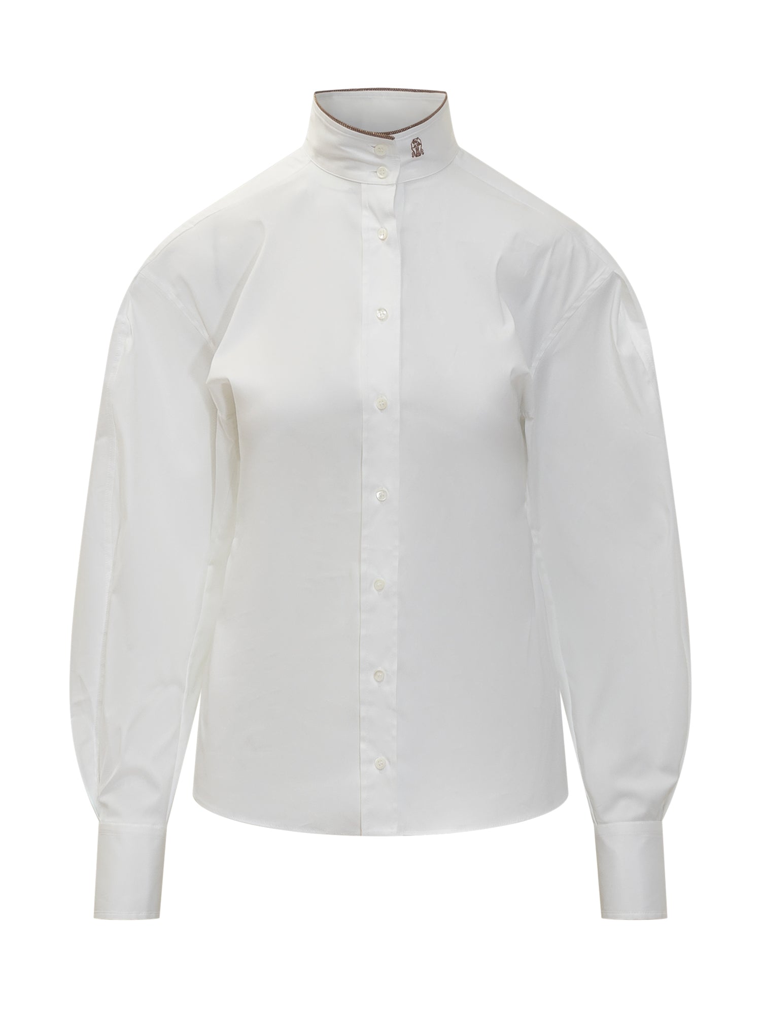 White cotton poplin shirt with elegant mandarin collar and subtle embroidery.